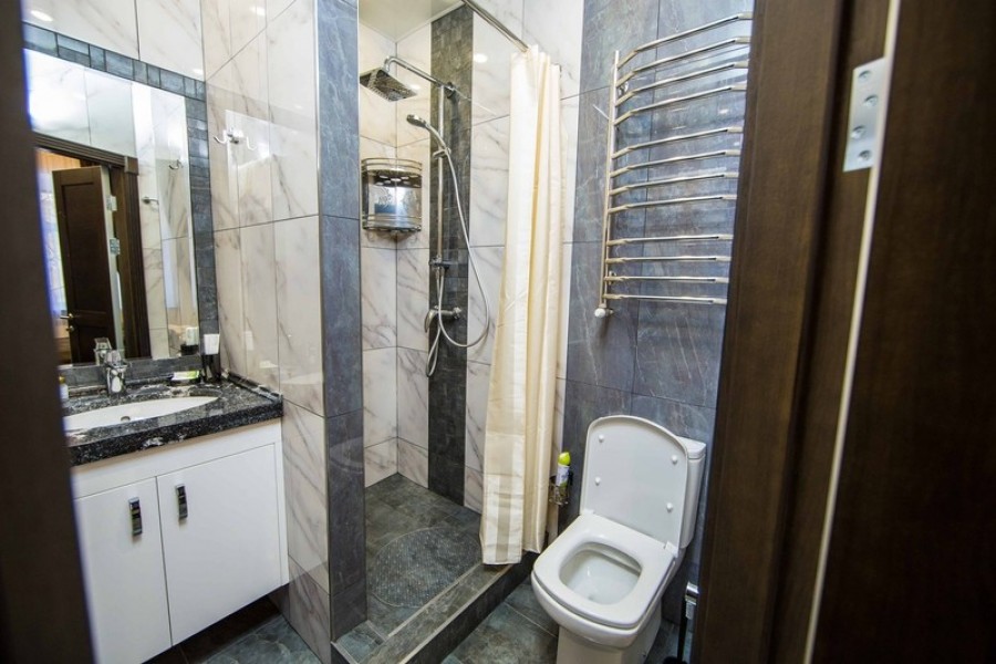 Санузел: с душем, тапочки, туалетные принадлежности, фен, халат