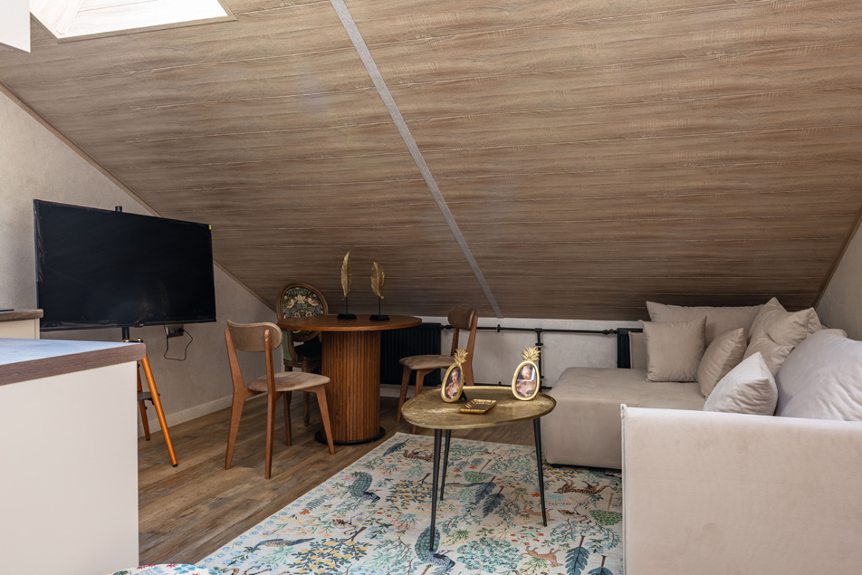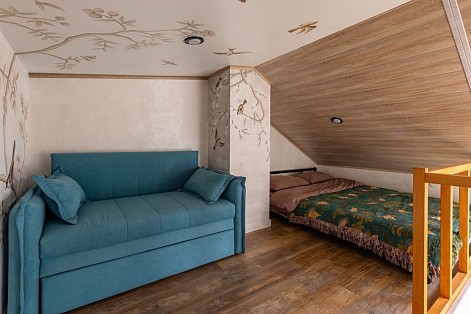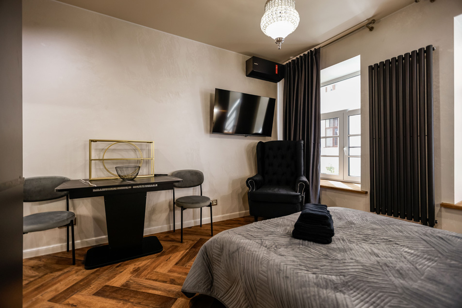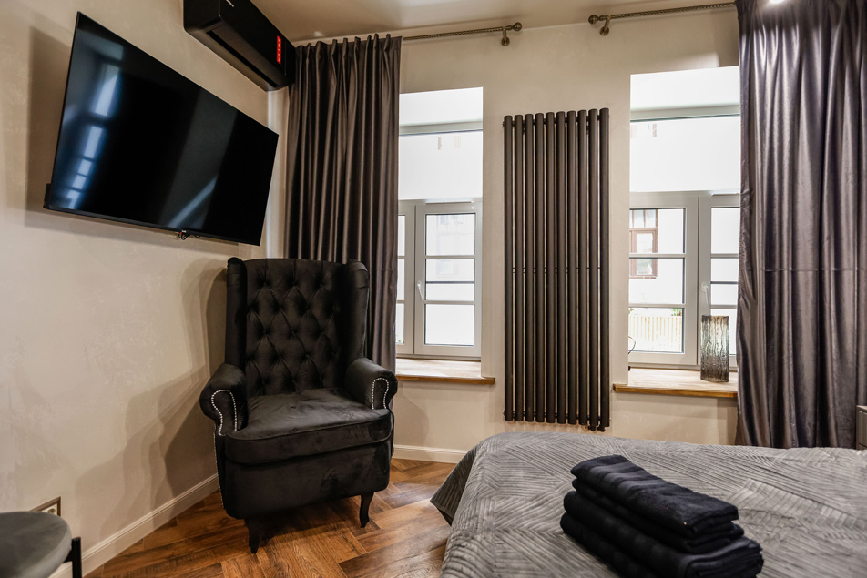 В номере: вешалка, диван раскладной, зеркало, кровать двуспальная, стол, стулья, шкаф, кондиционер, микроволновая печь, мини-холодильник, набор посуды, плита электрическая, телевизор, электрочайник