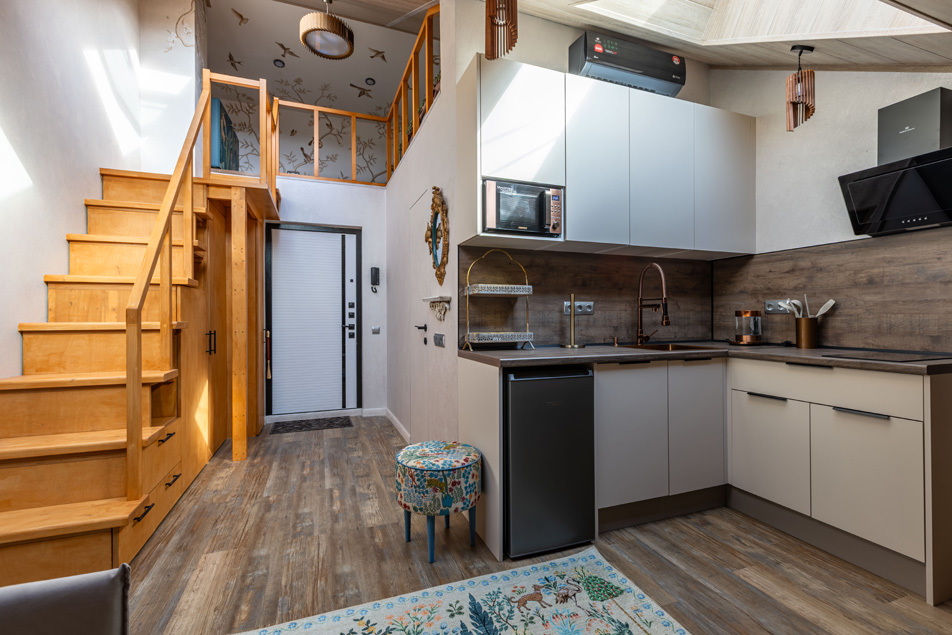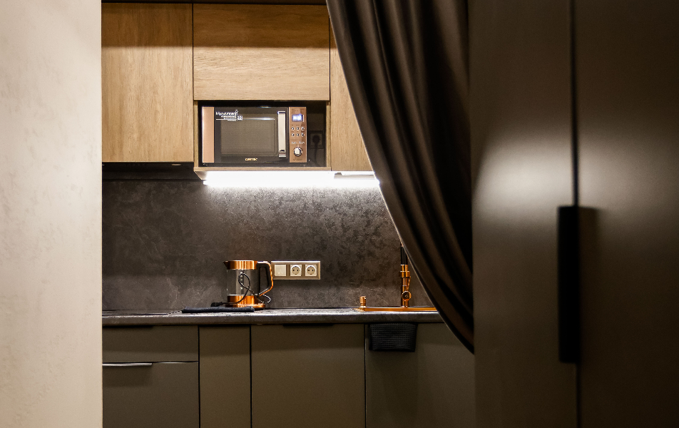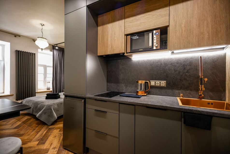 В номере: вешалка, зеркало, кровать двуспальная, прикроватные тумбочки, стол, стулья, шкаф, микроволновая печь, мини-холодильник, набор посуды, плита электрическая, телевизор, электрочайник