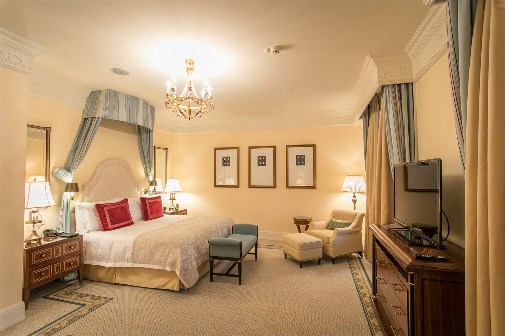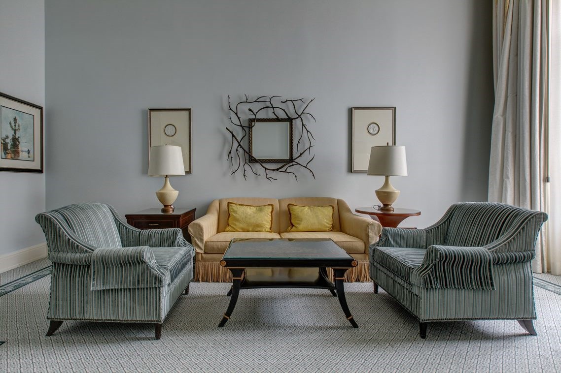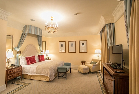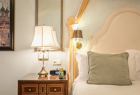 В номере: вешалка, диван, зеркало, кровать двуспальная, прикроватные тумбочки, стол, стулья, шкаф, гладильная доска, кофемашина, мини-холодильник, сейф, сплит-система, телевизор, телефон, утюг, электрочайник