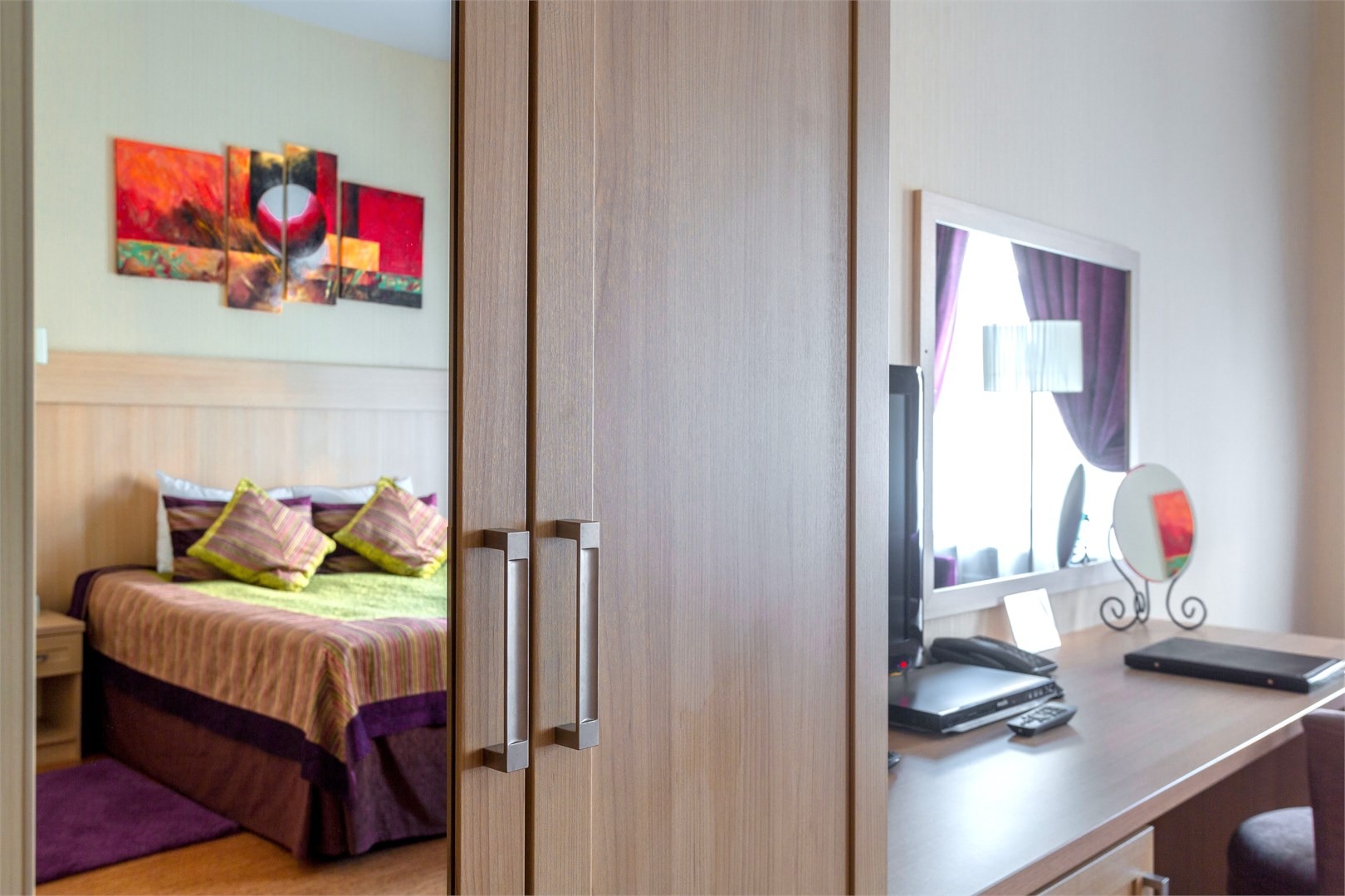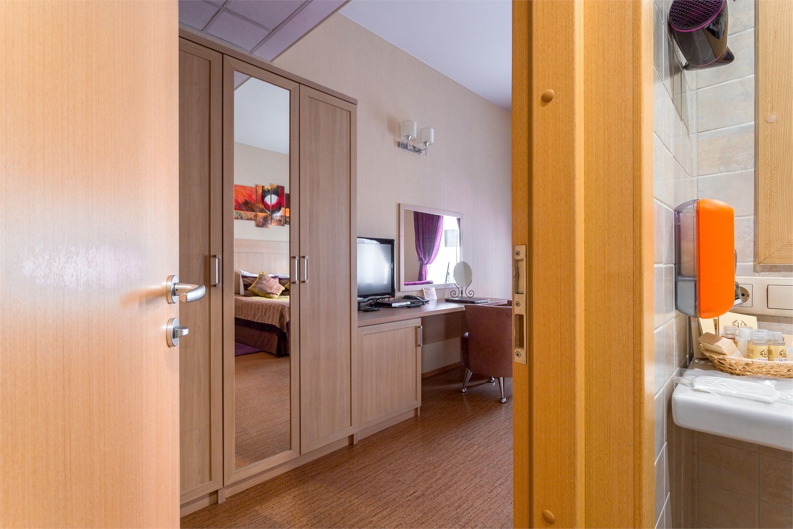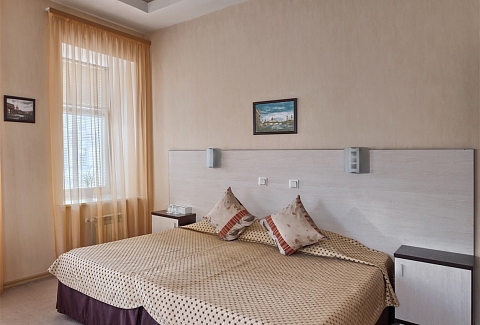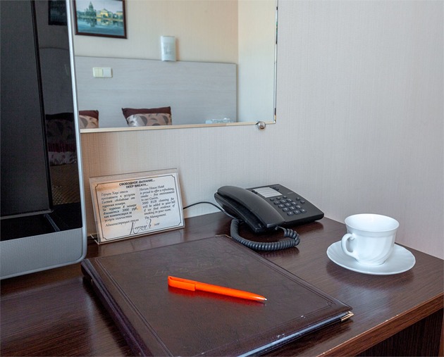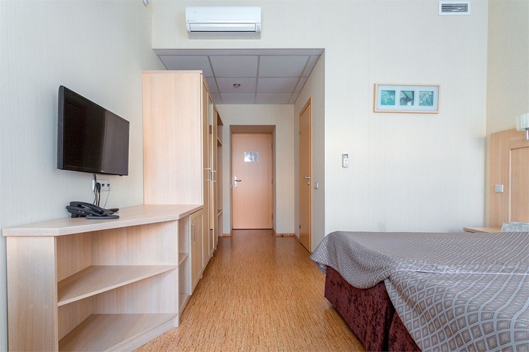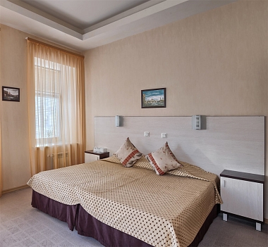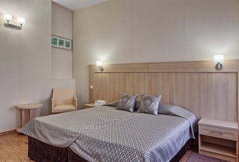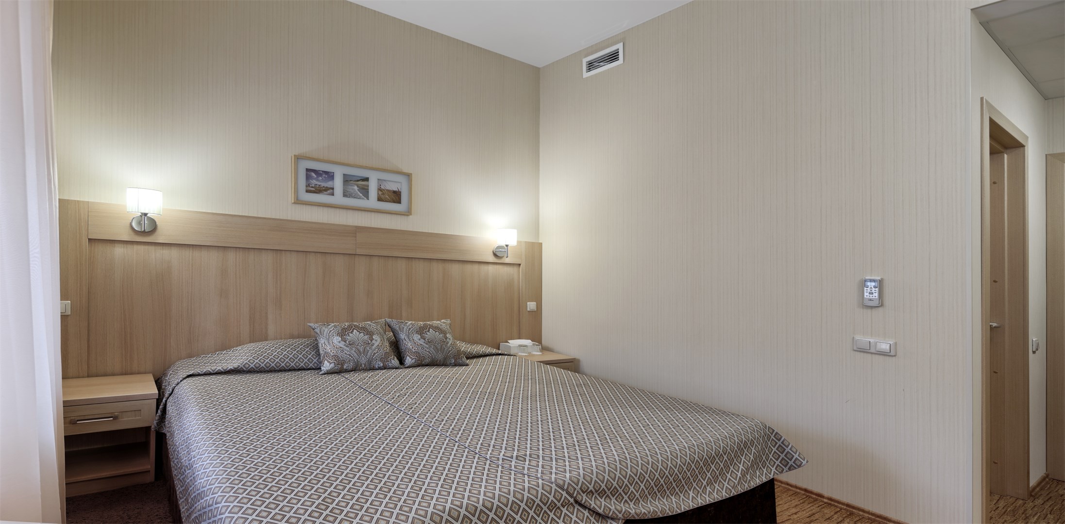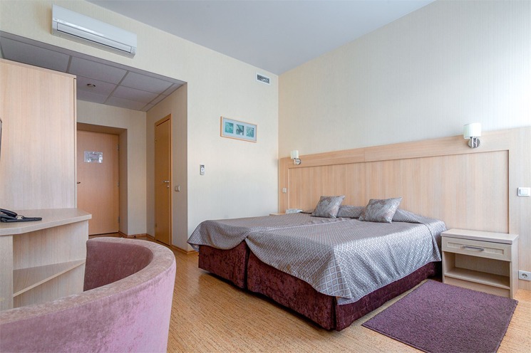 В номере: вешалка, зеркало, кровать двуспальная, прикроватные тумбочки, стол, стулья, шкаф, кондиционер, мини-холодильник, сейф, телевизор, телефон, чайный набор посуды, электрочайник