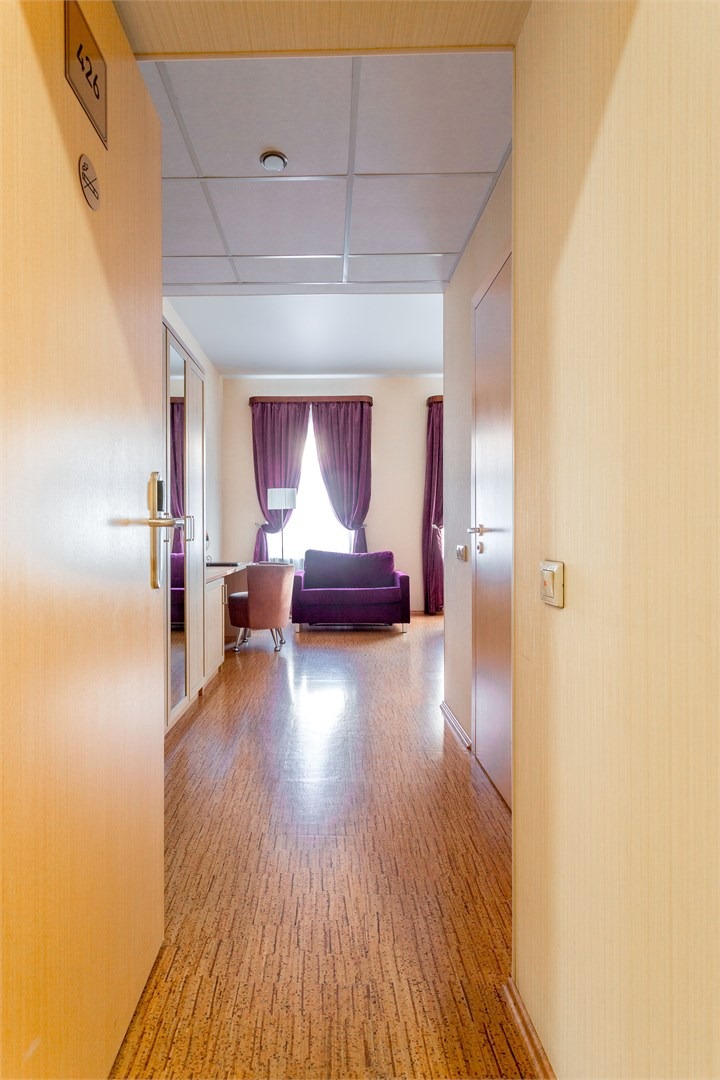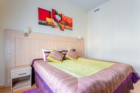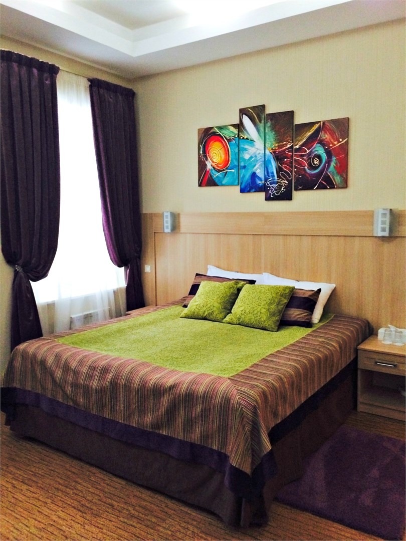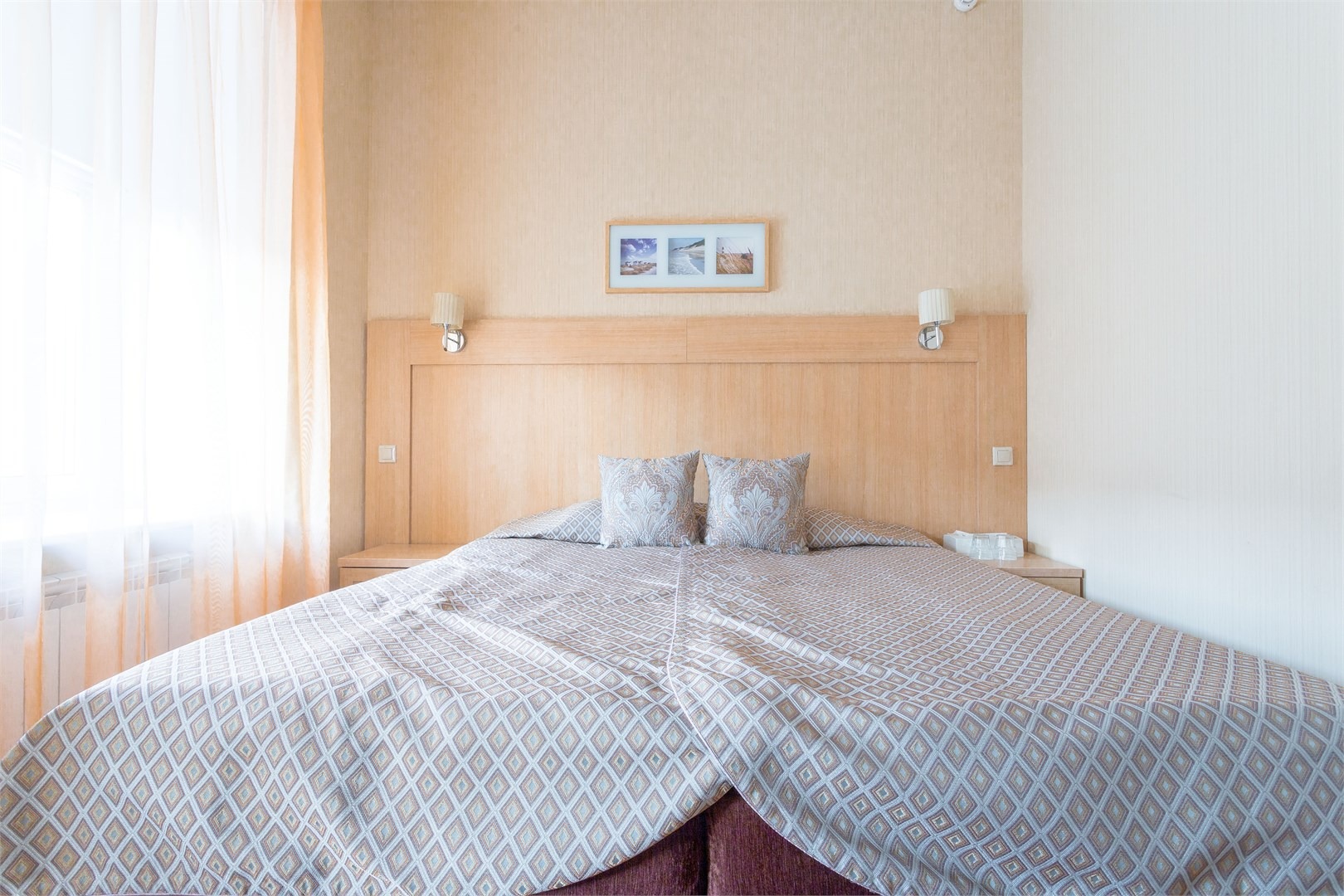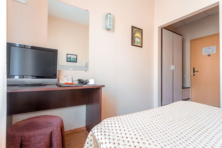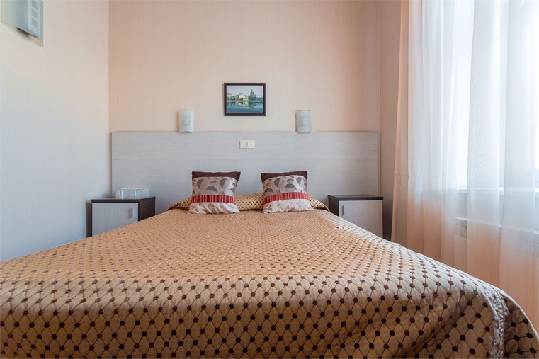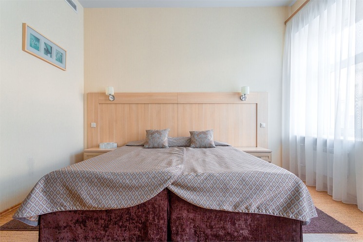 В номере: вешалка, зеркало, кровать двуспальная, прикроватные тумбочки, стол, стулья, шкаф, кондиционер, мини-холодильник, сейф, телевизор, телефон, чайный набор посуды, электрочайник