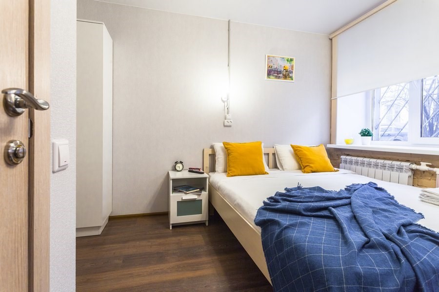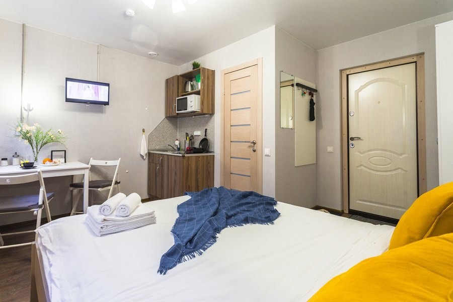 В номере: вешалка, зеркало, кровать двуспальная, стол, стулья, микроволновая печь, мини-холодильник, набор посуды, плита электрическая, стиральная машина, телевизор, утюг, электрочайник