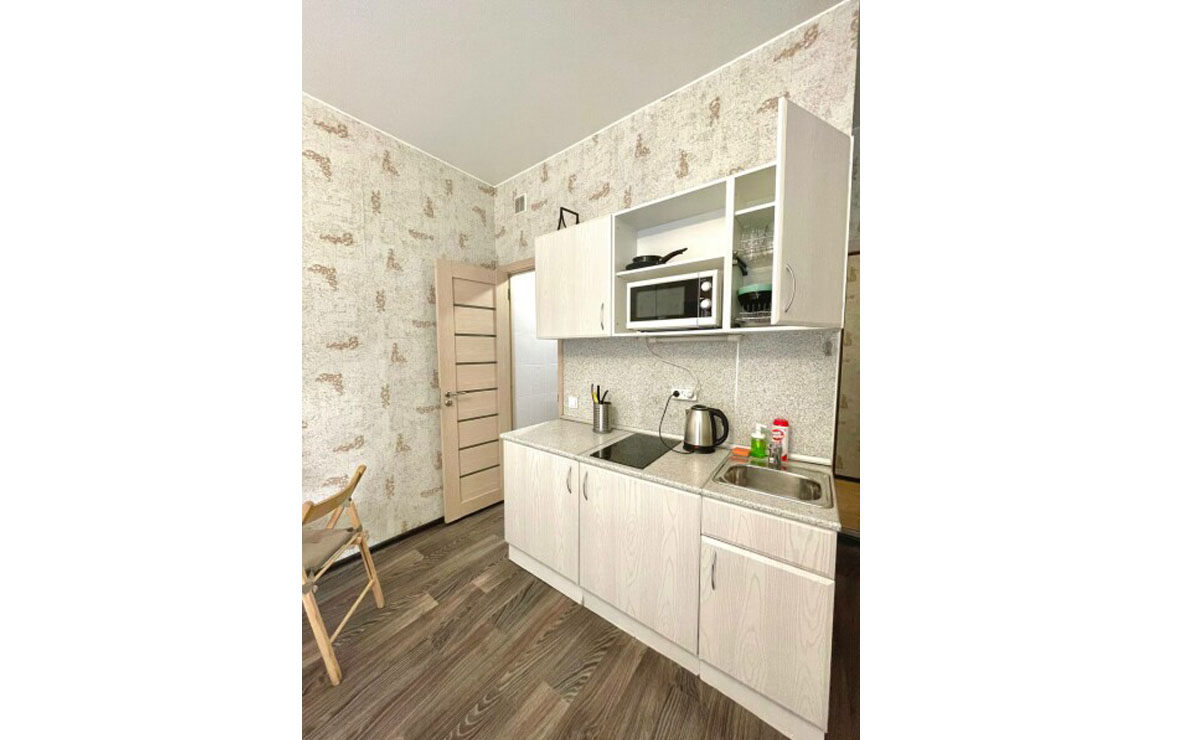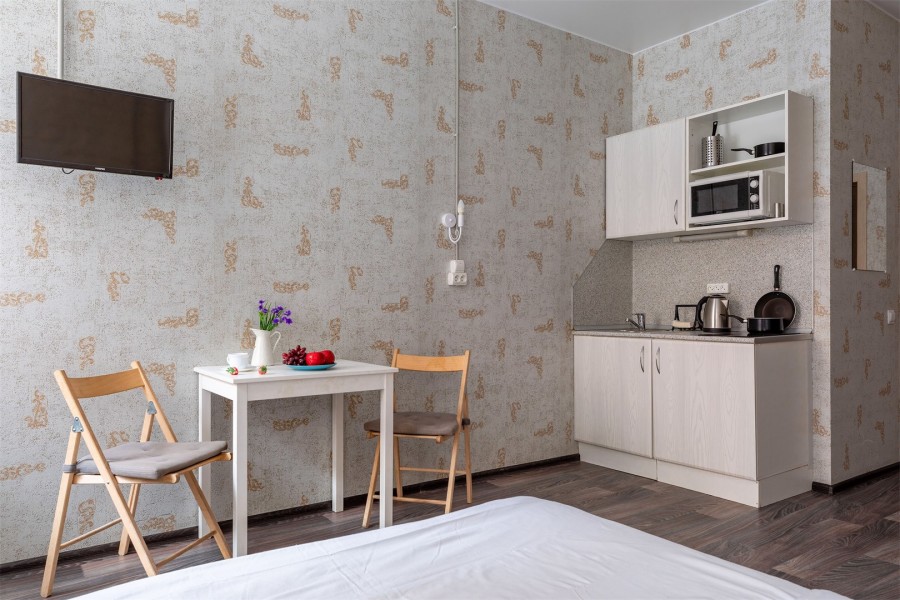В номере: вешалка, зеркало, кровать двуспальная, стол, стулья, микроволновая печь, мини-холодильник, набор посуды, плита электрическая, стиральная машина, телевизор, утюг, электрочайник
