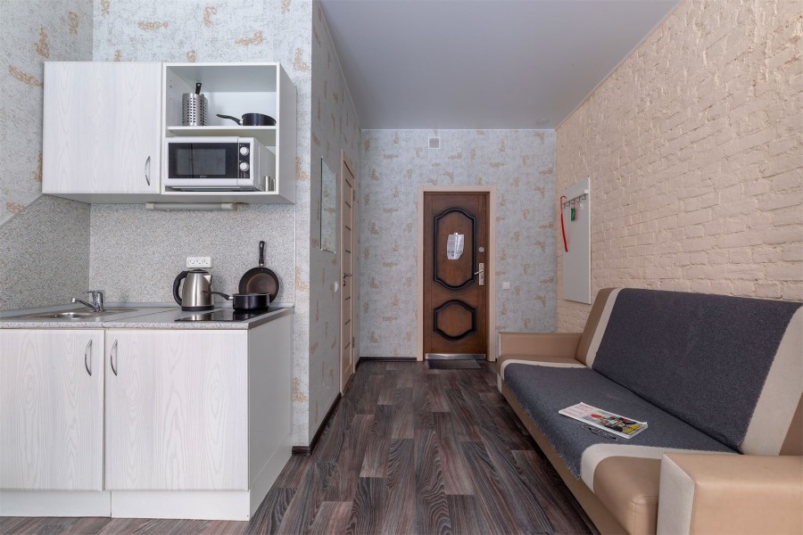 В номере: вешалка, диван раскладной, зеркало, кровать двуспальная, стол, стулья, шкаф, микроволновая печь, мини-холодильник, набор посуды, плита электрическая, стиральная машина, телевизор, утюг, электрочайник