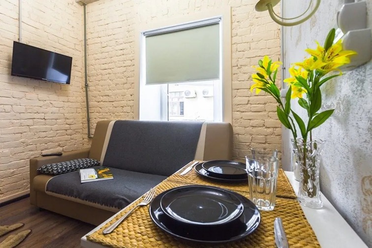 В номере: вешалка, диван, зеркало, матрас, стол, стулья, шкаф, микроволновая печь, мини-холодильник, набор посуды, плита электрическая, сушилка для белья, телевизор, электрочайник