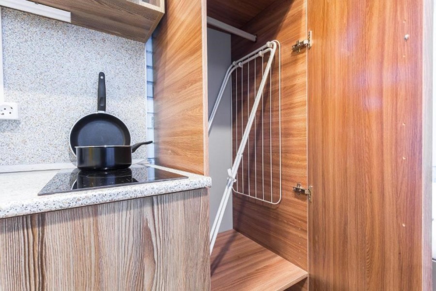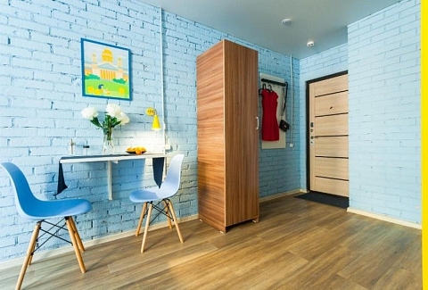 В номере: вешалка, зеркало, кровать двуспальная, стол, стулья, микроволновая печь, мини-холодильник, набор посуды, плита электрическая, стиральная машина, сушилка для белья, телевизор, утюг, электрочайник