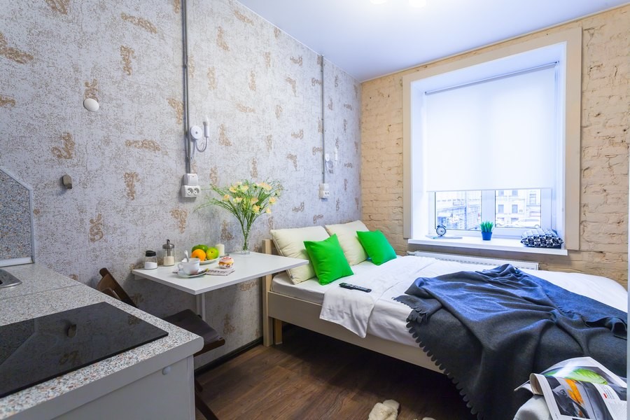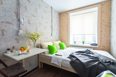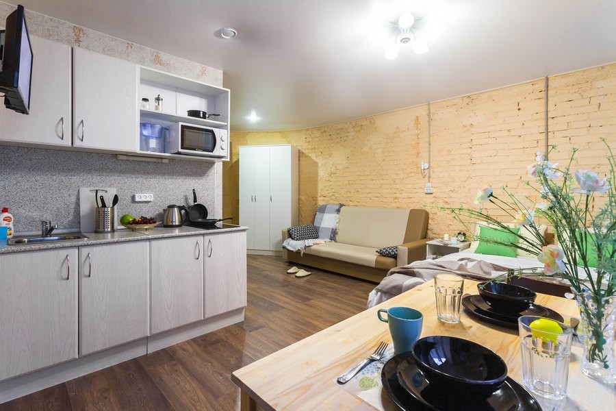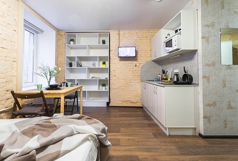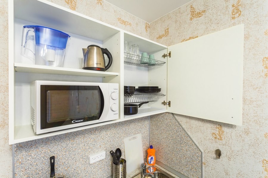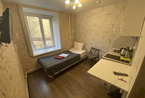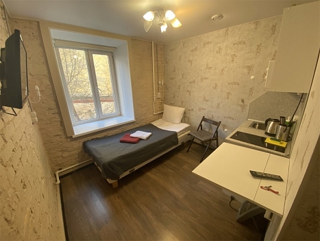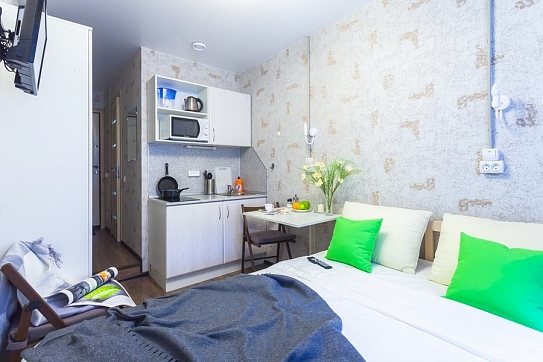 В номере: вешалка, зеркало, кровать односпальная, стол, стул, шкаф, микроволновая печь, мини-холодильник, набор посуды, плита электрическая, стиральная машина, телевизор, утюг, электрочайник