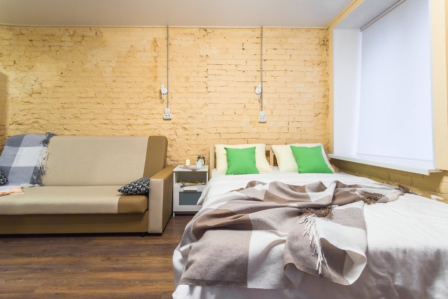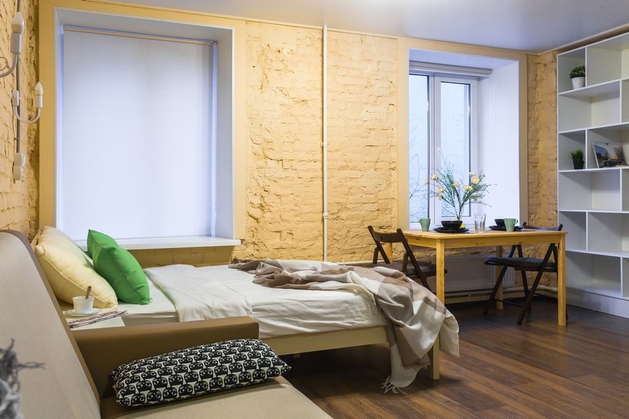 В номере: вешалка, диван раскладной, зеркало, кровать двуспальная, стол, стулья, шкаф, микроволновая печь, мини-холодильник, набор посуды, плита электрическая, стиральная машина, телевизор, утюг, электрочайник