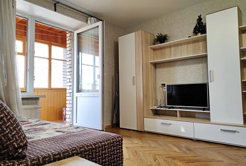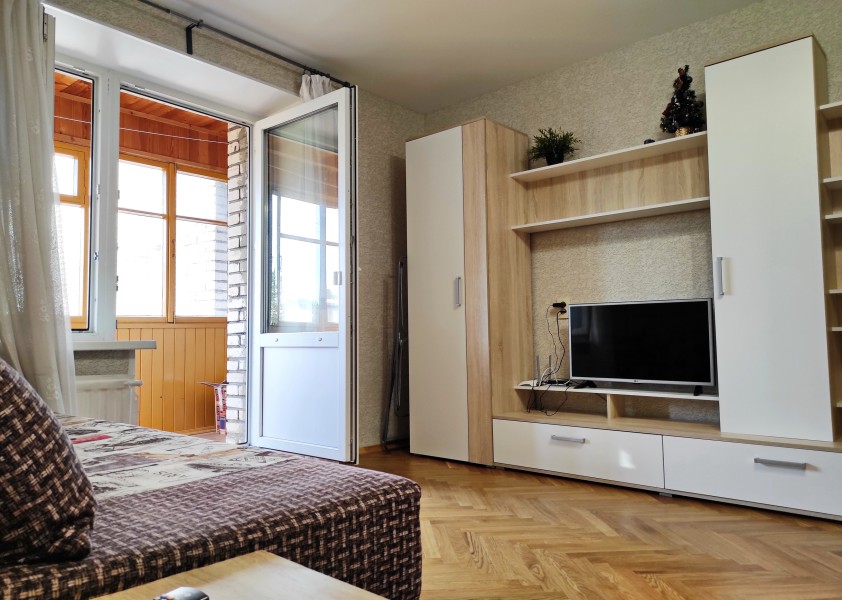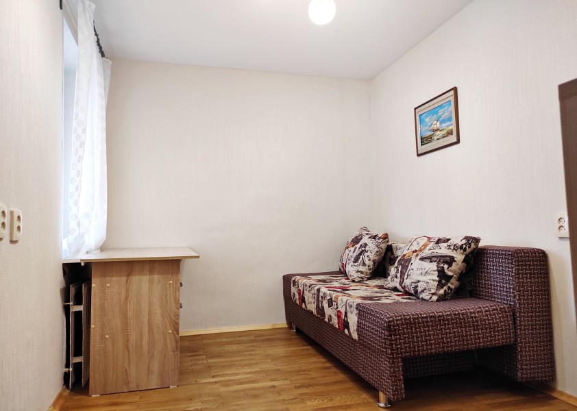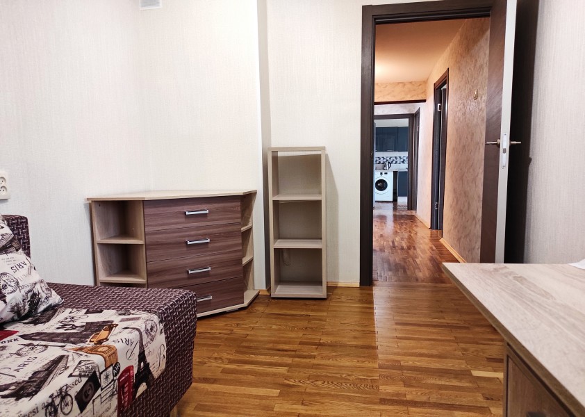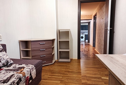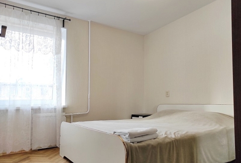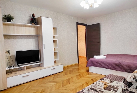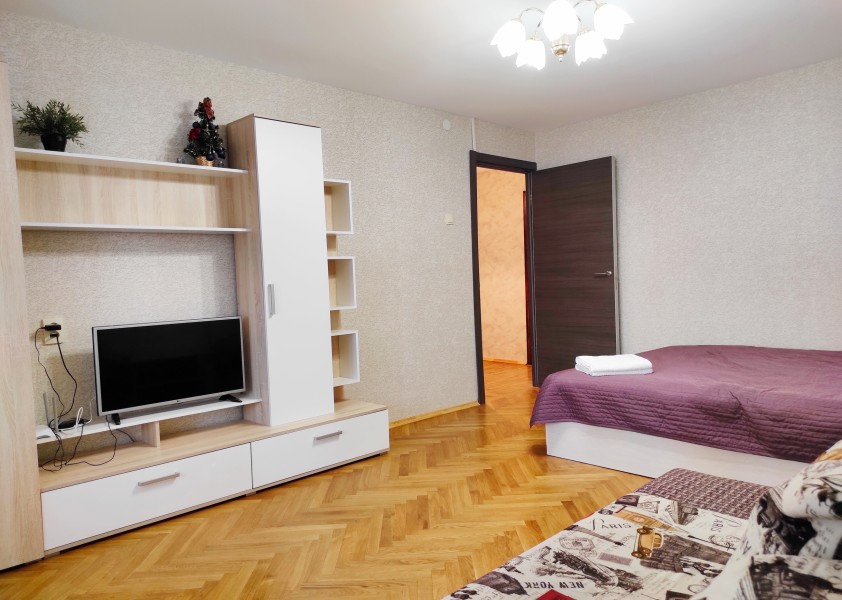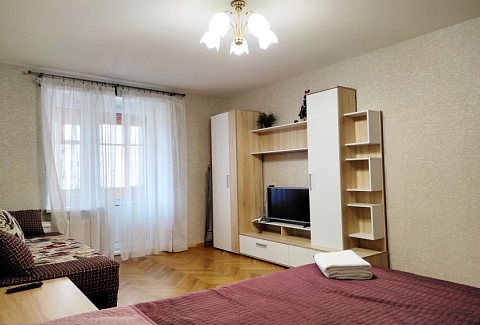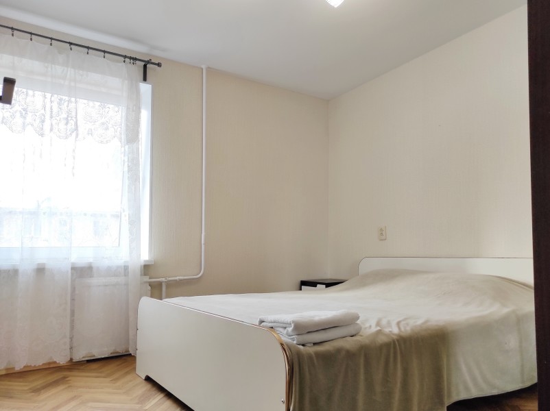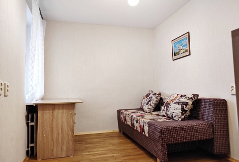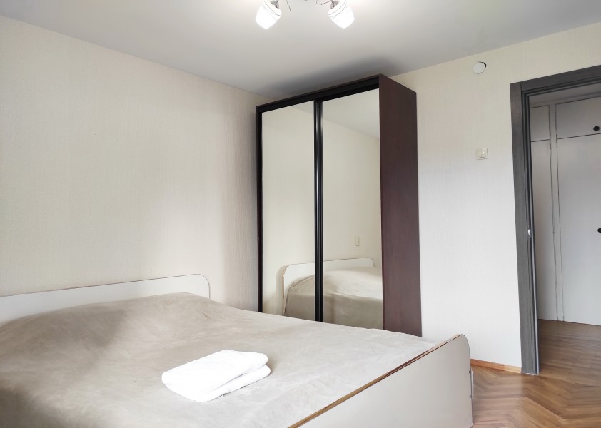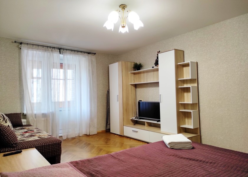 В номере: вешалка, диван раскладной, зеркало, кровать двуспальная, прикроватные тумбочки, стол, стулья, шкаф, гладильная доска, микроволновая печь, набор посуды, плита электрическая, стиральная машина, телевизор, утюг, холодильник, электрочайник