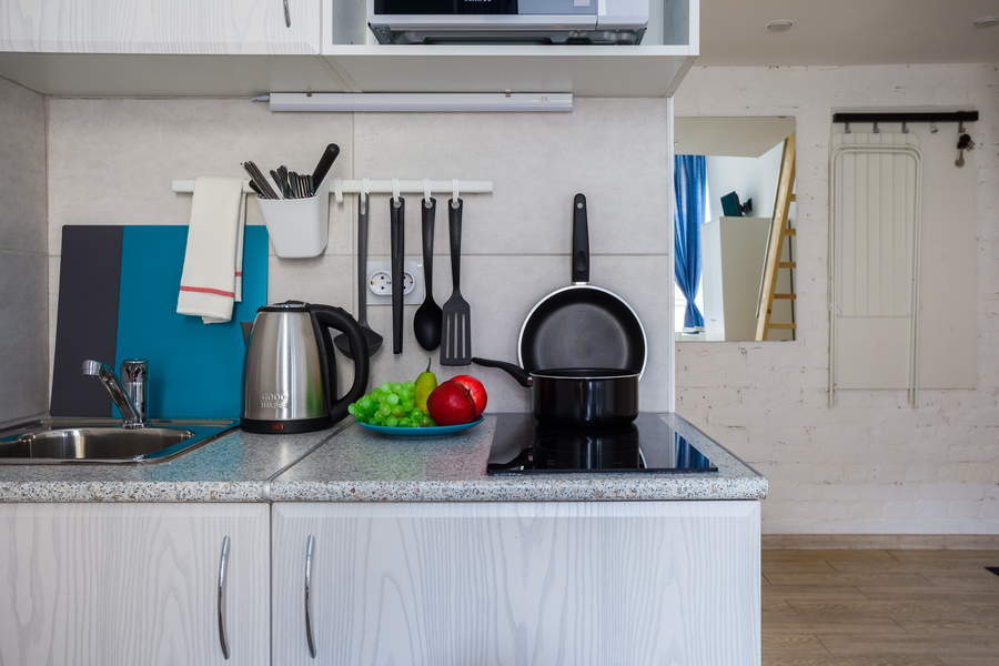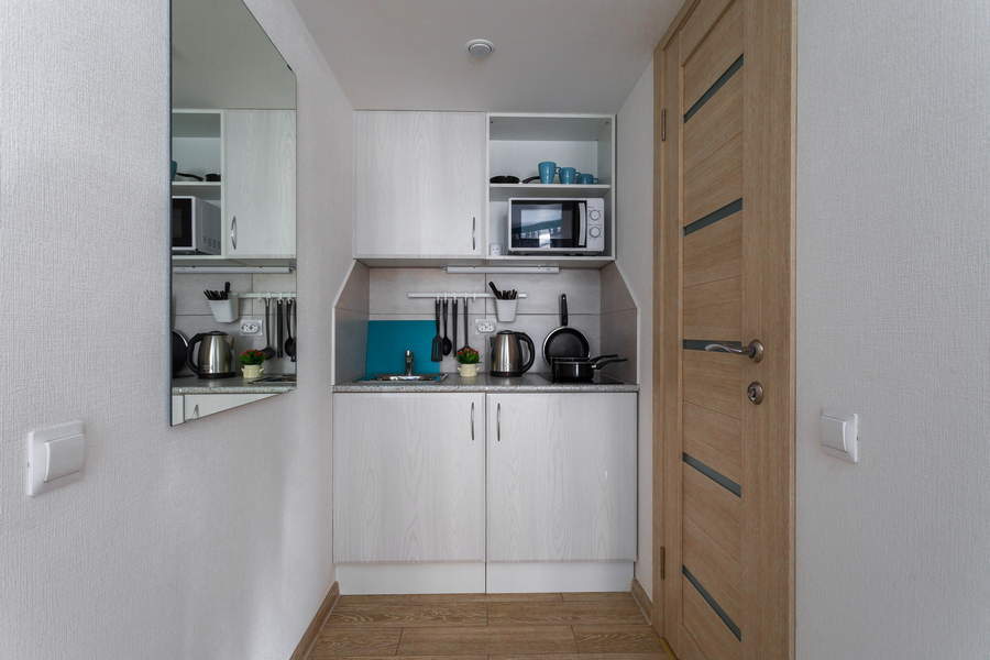 В номере: диван, зеркало, кровать двуспальная, прикроватные тумбочки, стол, стулья, шкаф, микроволновая печь, набор посуды, плита электрическая, телевизор, холодильник, чайник