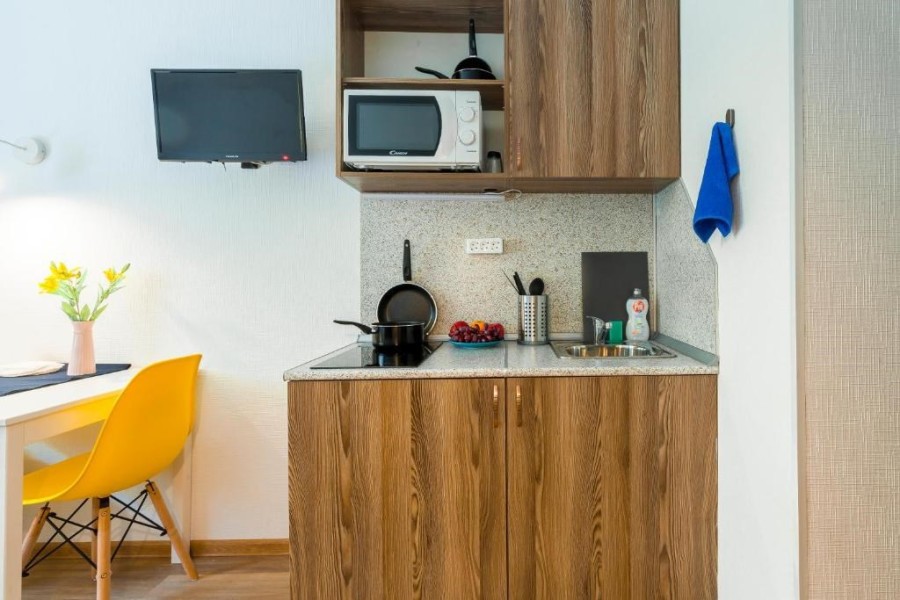 В номере: вешалка, диван раскладной, зеркало, стол, стулья, гладильная доска, микроволновая печь, мини-холодильник, набор посуды, плита электрическая, стиральная машина, телевизор, утюг, электрочайник