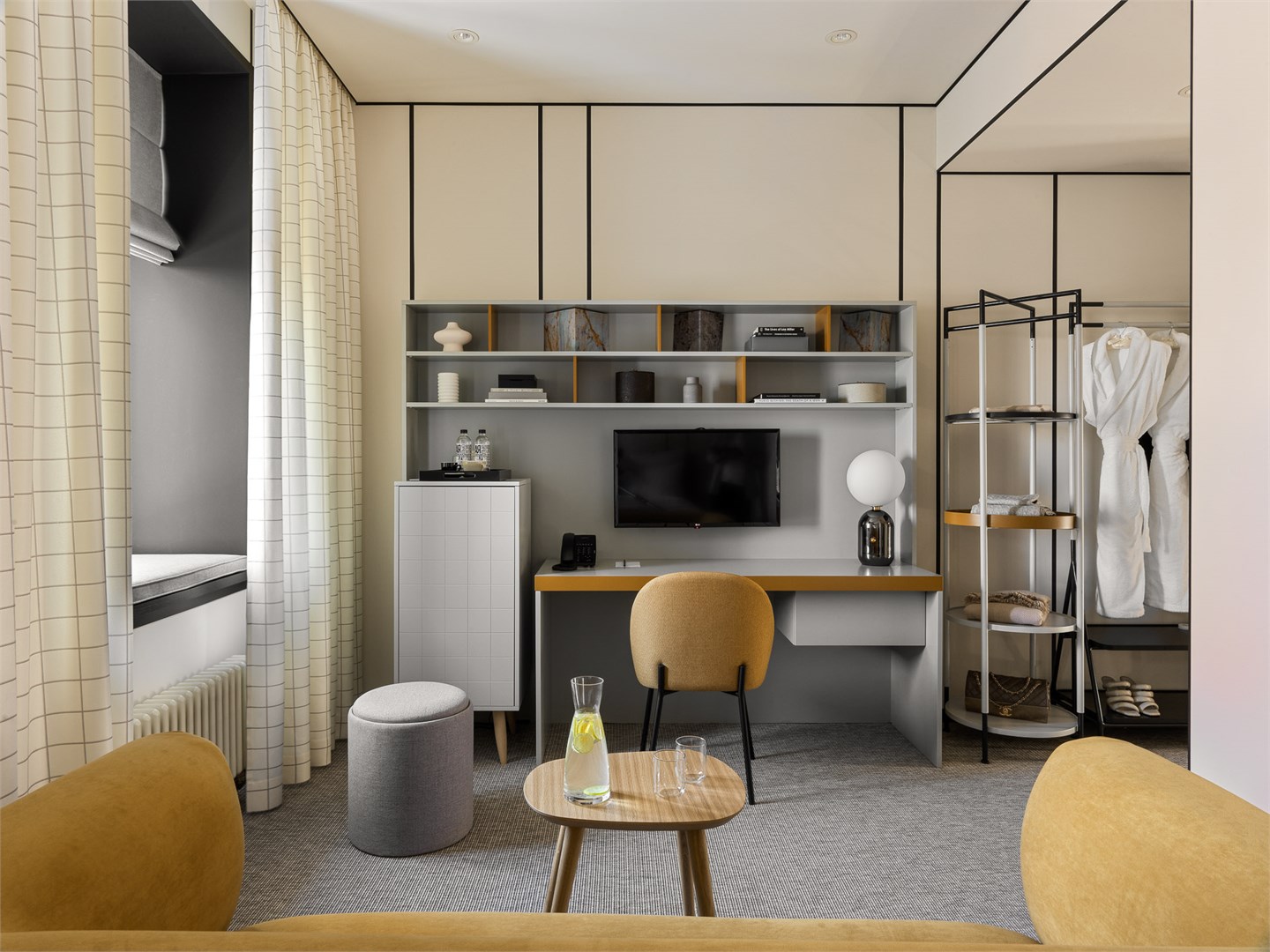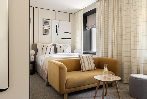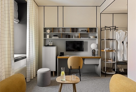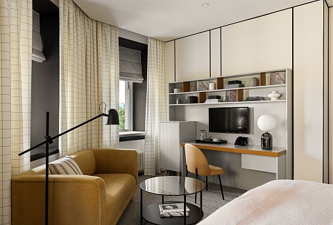 В номере: диван, зеркало, кресло, кровать двуспальная, стол, стул, шкаф, кондиционер, мини-холодильник, телевизор ЖК, электрочайник
