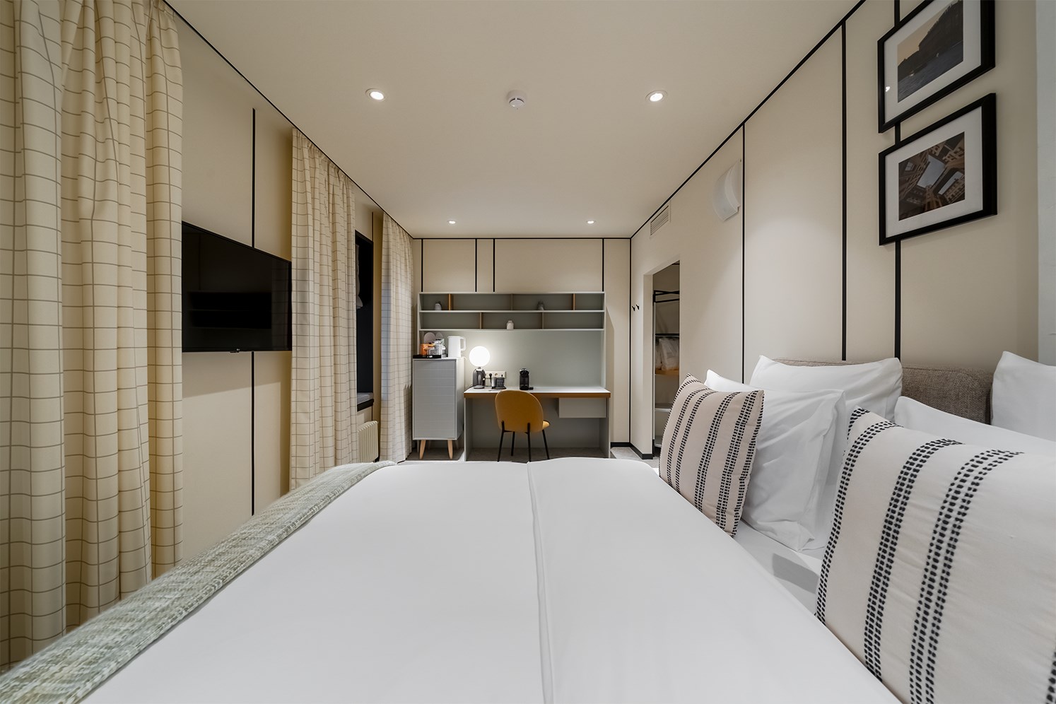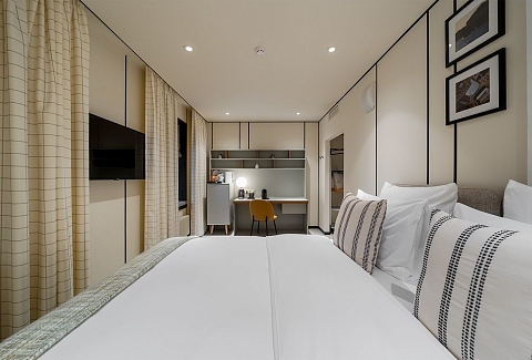 В номере: диван, зеркало, кровать двуспальная, стол, стул, шкаф, кондиционер, мини-холодильник, телевизор ЖК, электрочайник