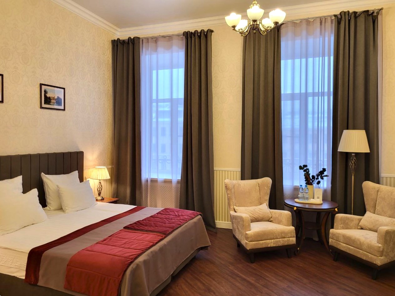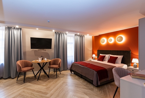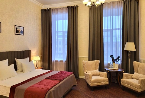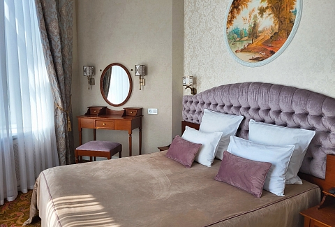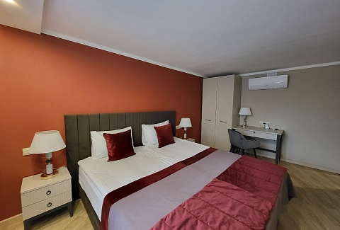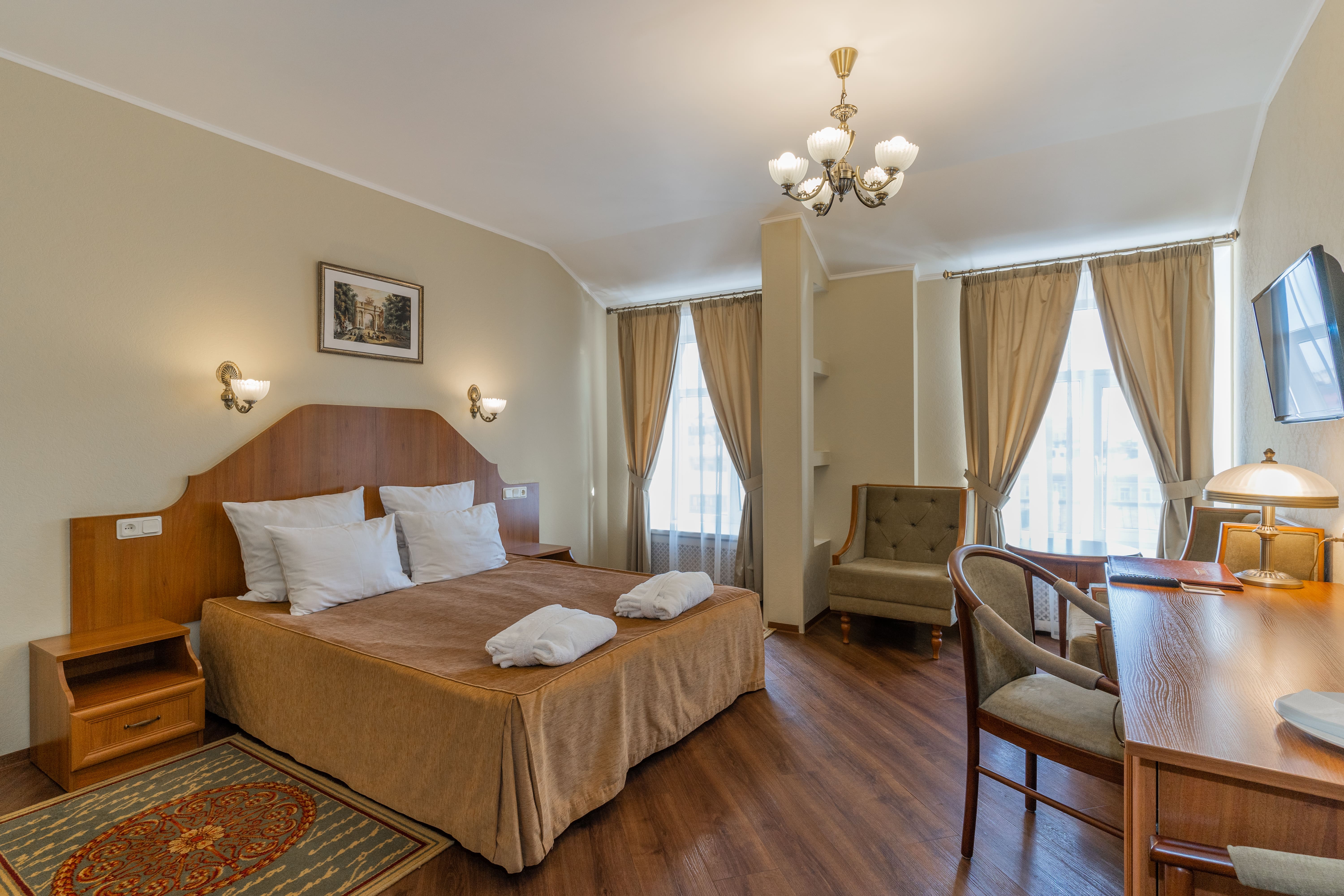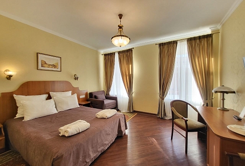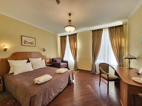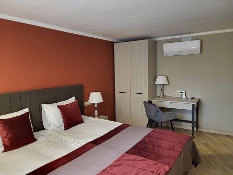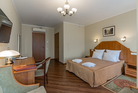В номере: вешалка, зеркало, кресла, кровати односпальные /одна двуспальная кровать, прикроватные тумбочки, стол, стулья, шкаф, кондиционер, мини-холодильник, сейф, телевизор, телефон