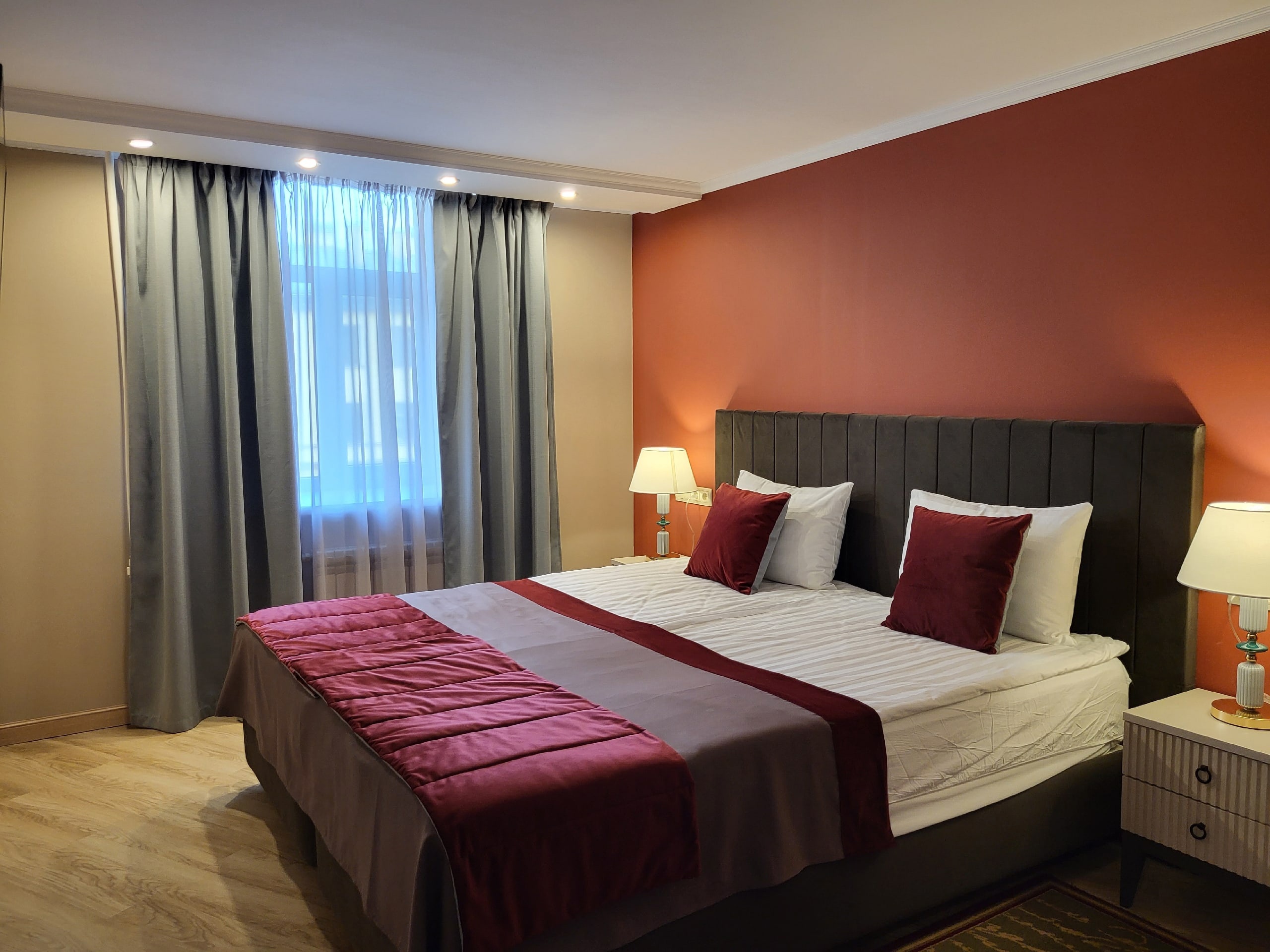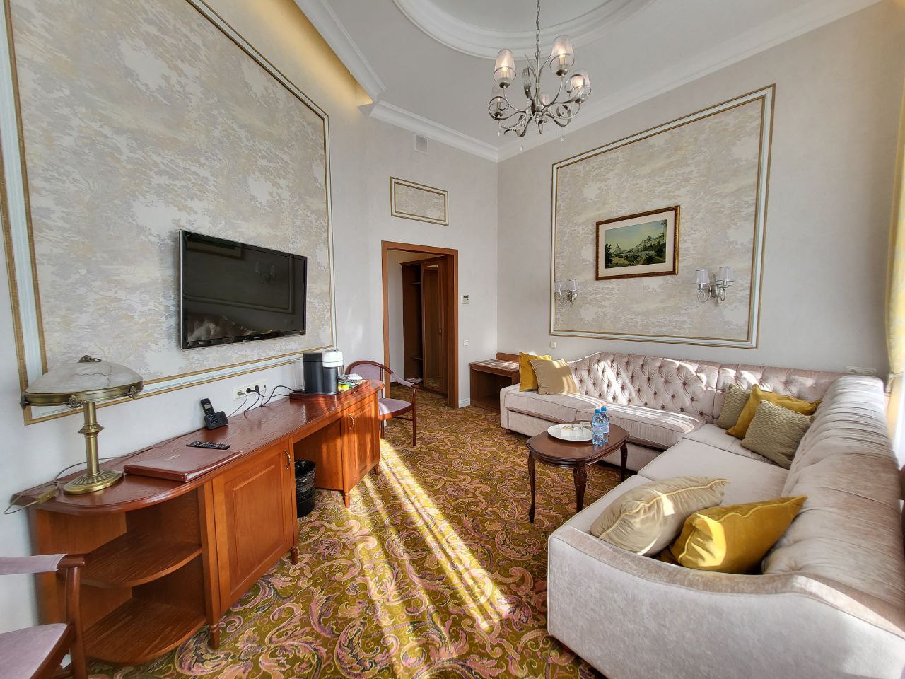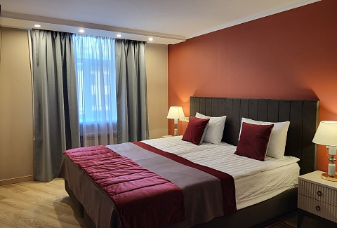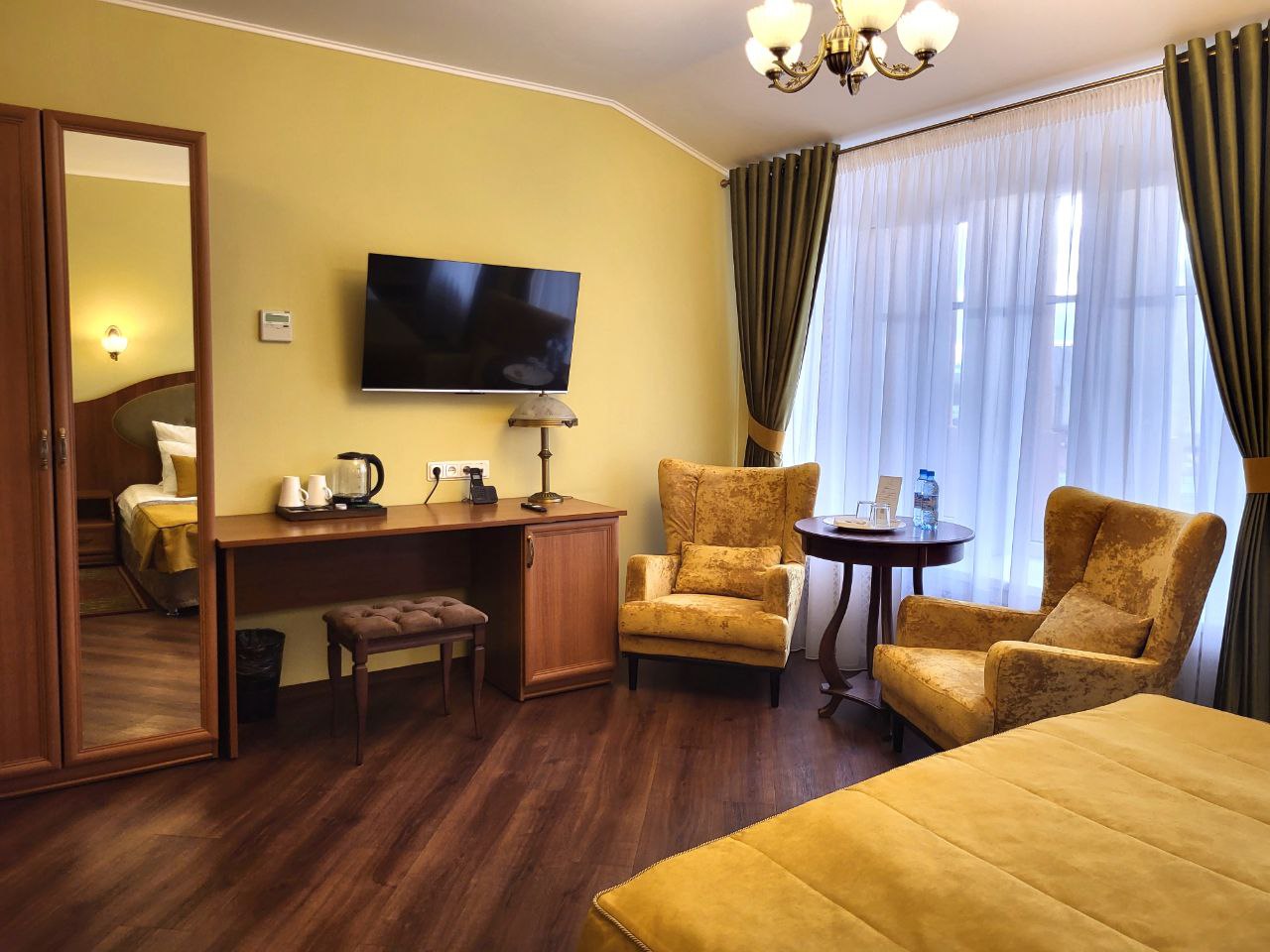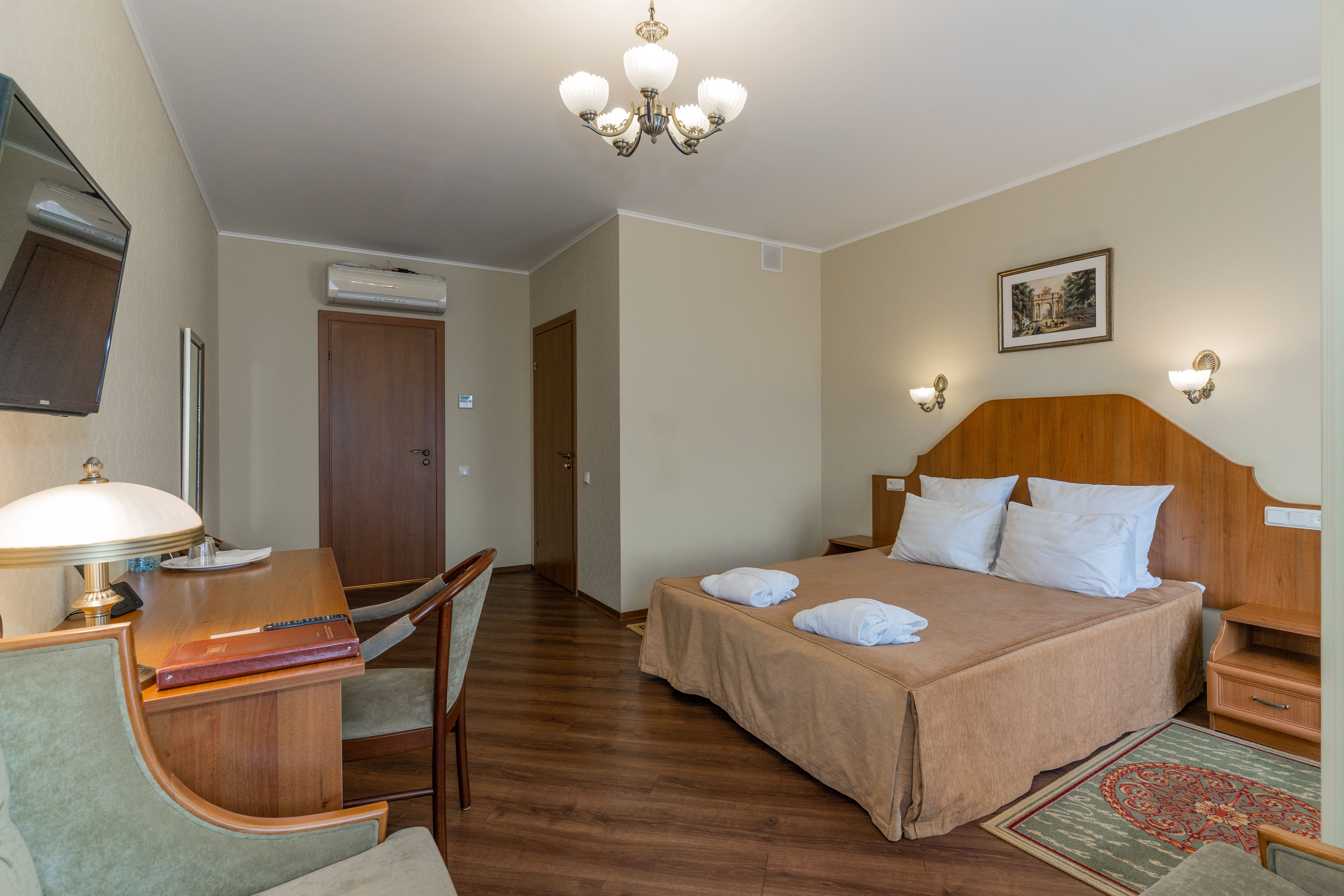 В номере: вешалка, диван раскладной, зеркало, кровать двуспальная, прикроватные тумбочки, столик журнальный, стулья, тумба, тумба багажная, шкаф, кондиционер, мини-холодильник, сейф, телевизор, телефон, чайная станция, чайный набор посуды
