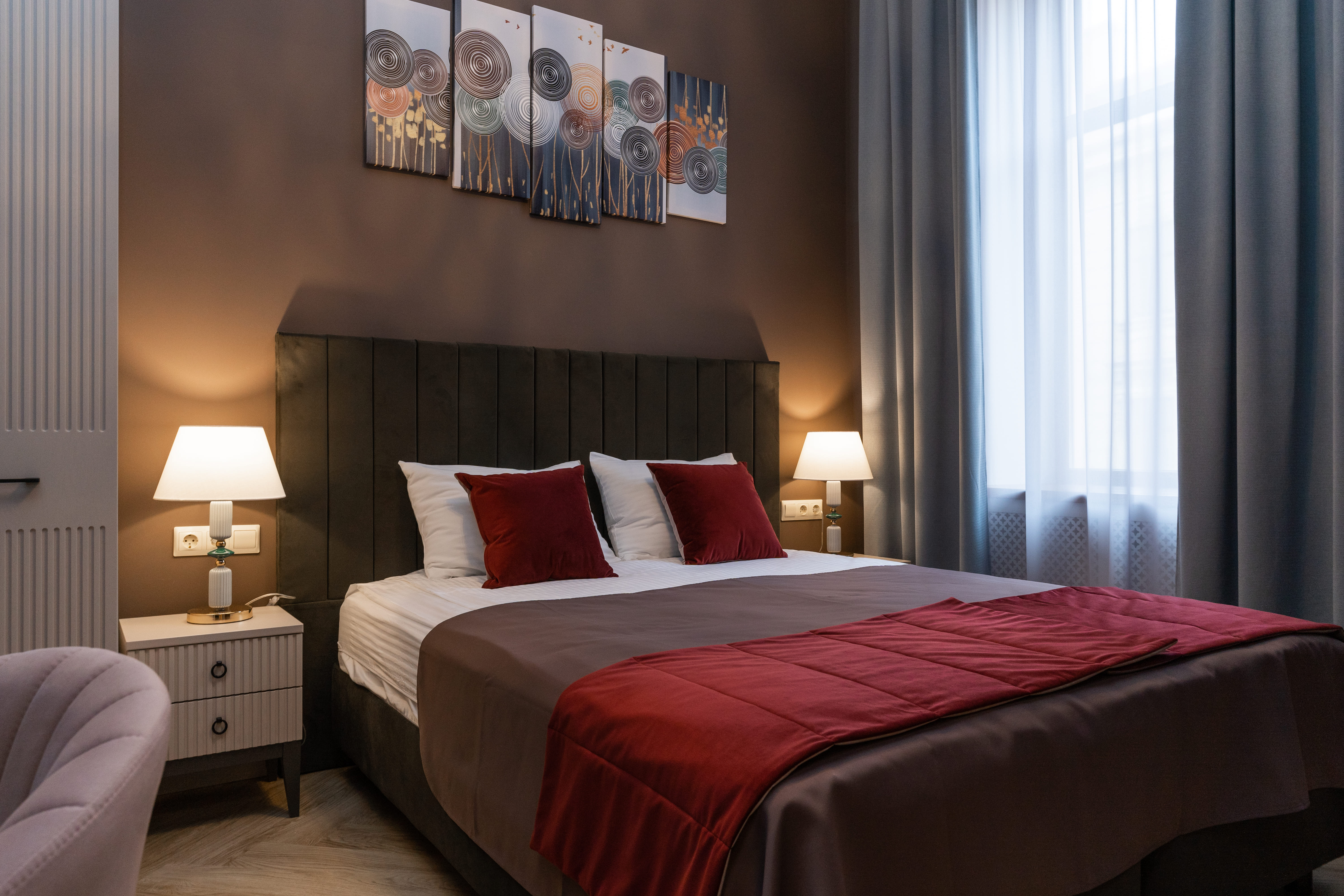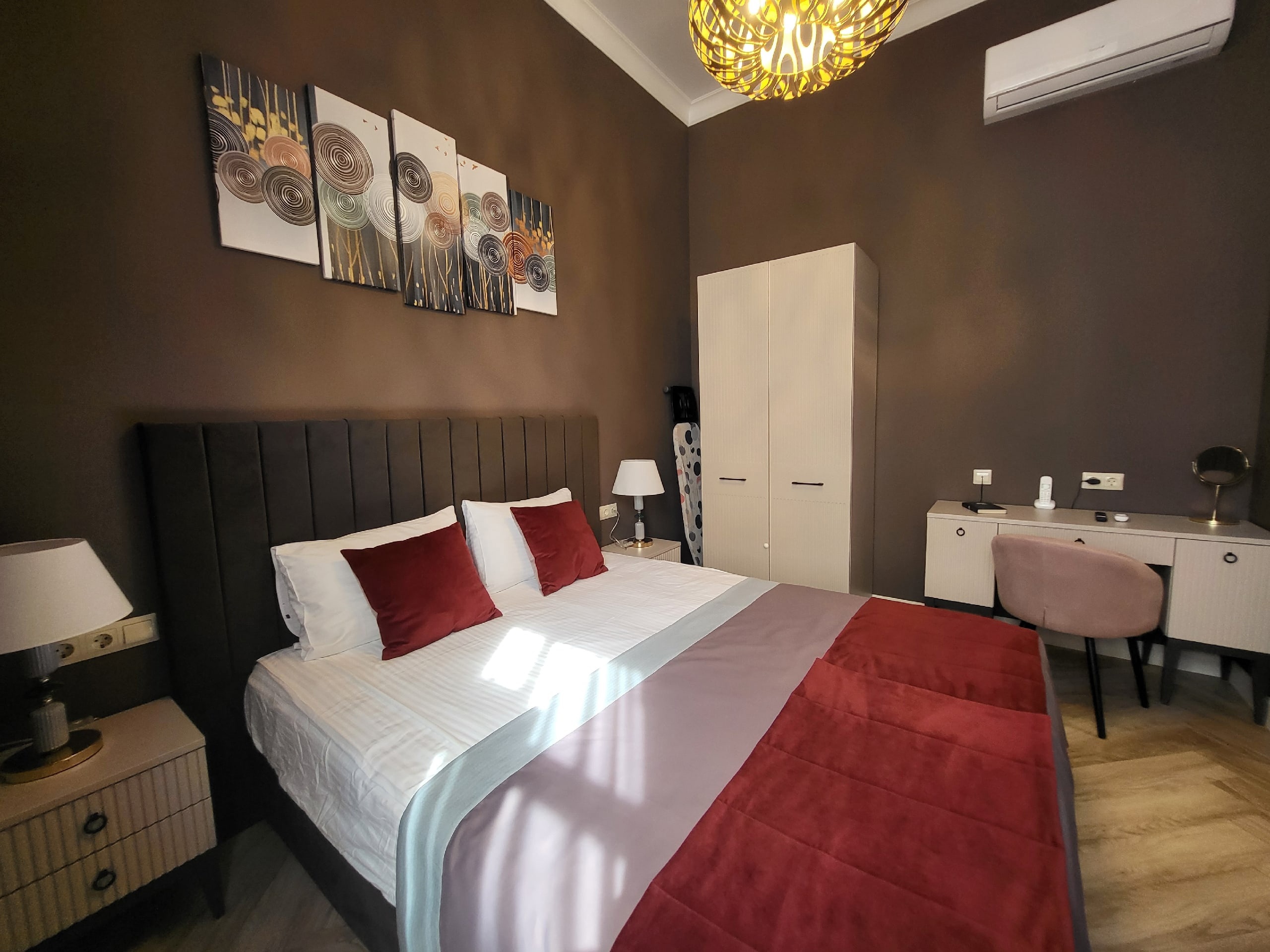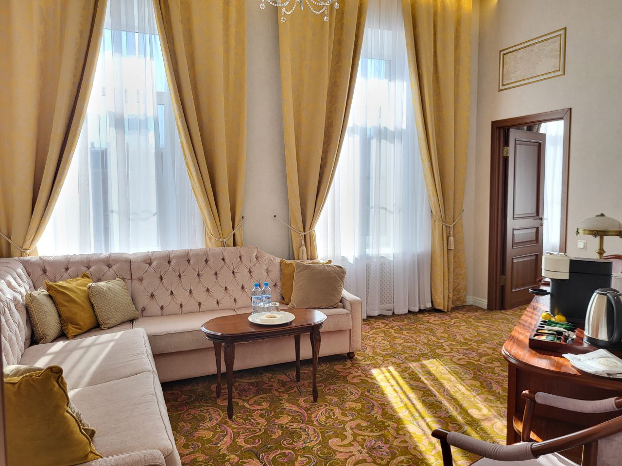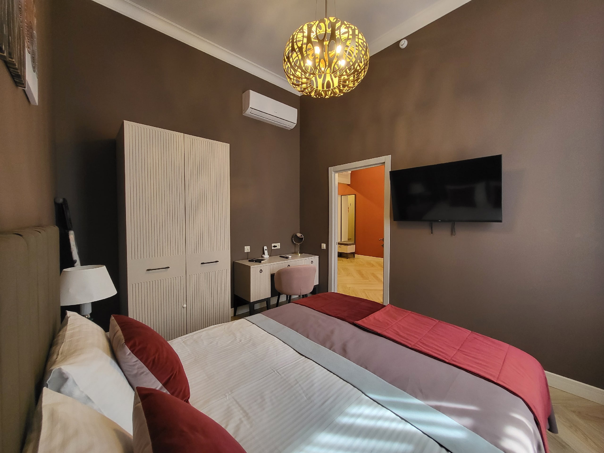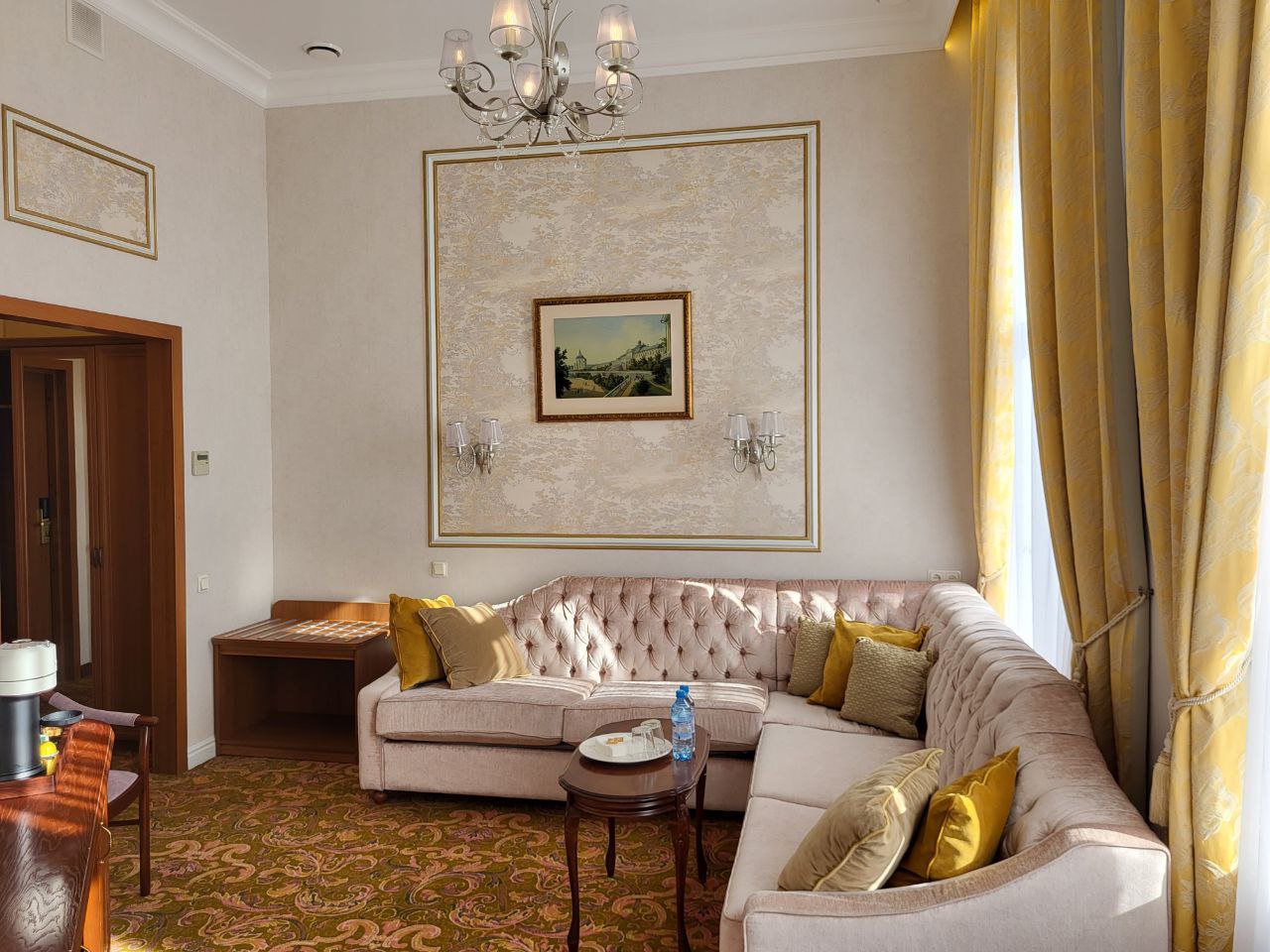 В номере: вешалка, диван раскладной, зеркало, кровать двуспальная, прикроватные тумбочки, столик журнальный, стулья, тумба, тумба багажная, шкаф, кондиционер, мини-холодильник, сейф, телевизор, телефон, чайная станция, чайный набор посуды