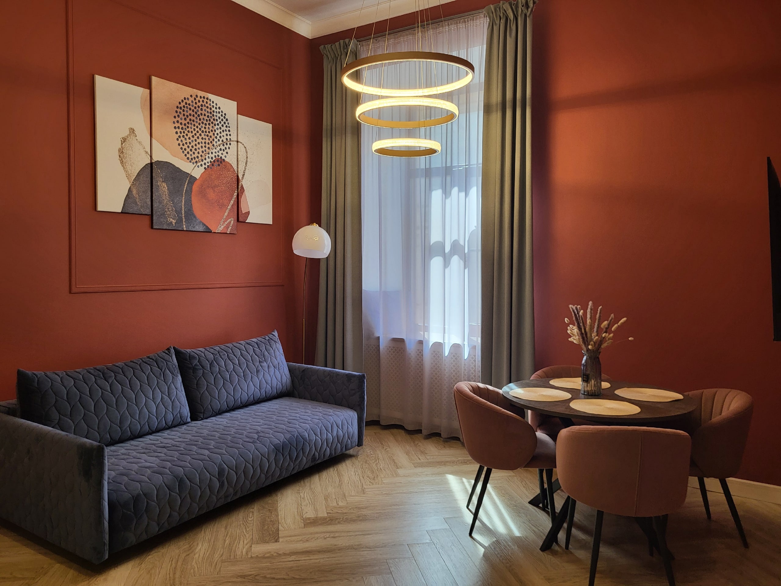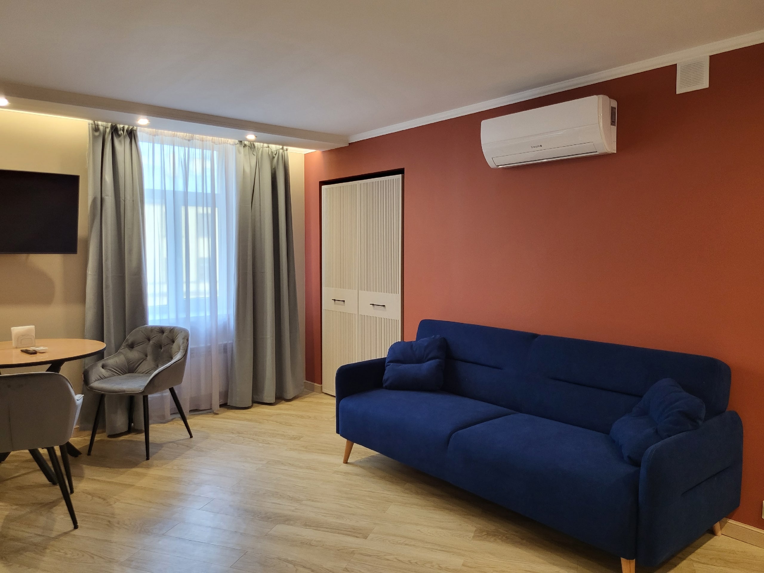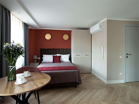 В номере: вешалка, диван раскладной, зеркало, кровати односпальные /одна двуспальная кровать, прикроватные тумбочки, стол, стулья, шкаф, духовой шкаф, кондиционер, микроволновая печь, мини-холодильник, набор посуды, плита электрическая, телевизор, телефон, электрочайник