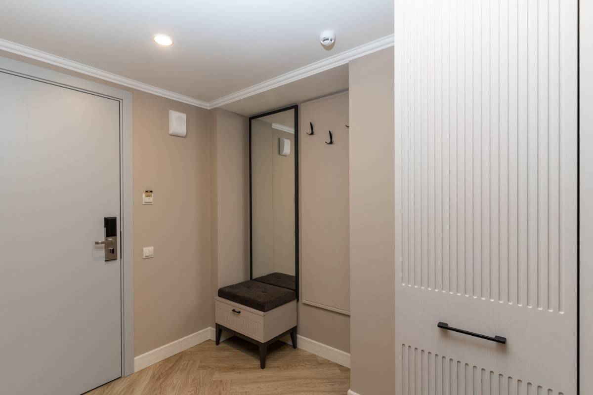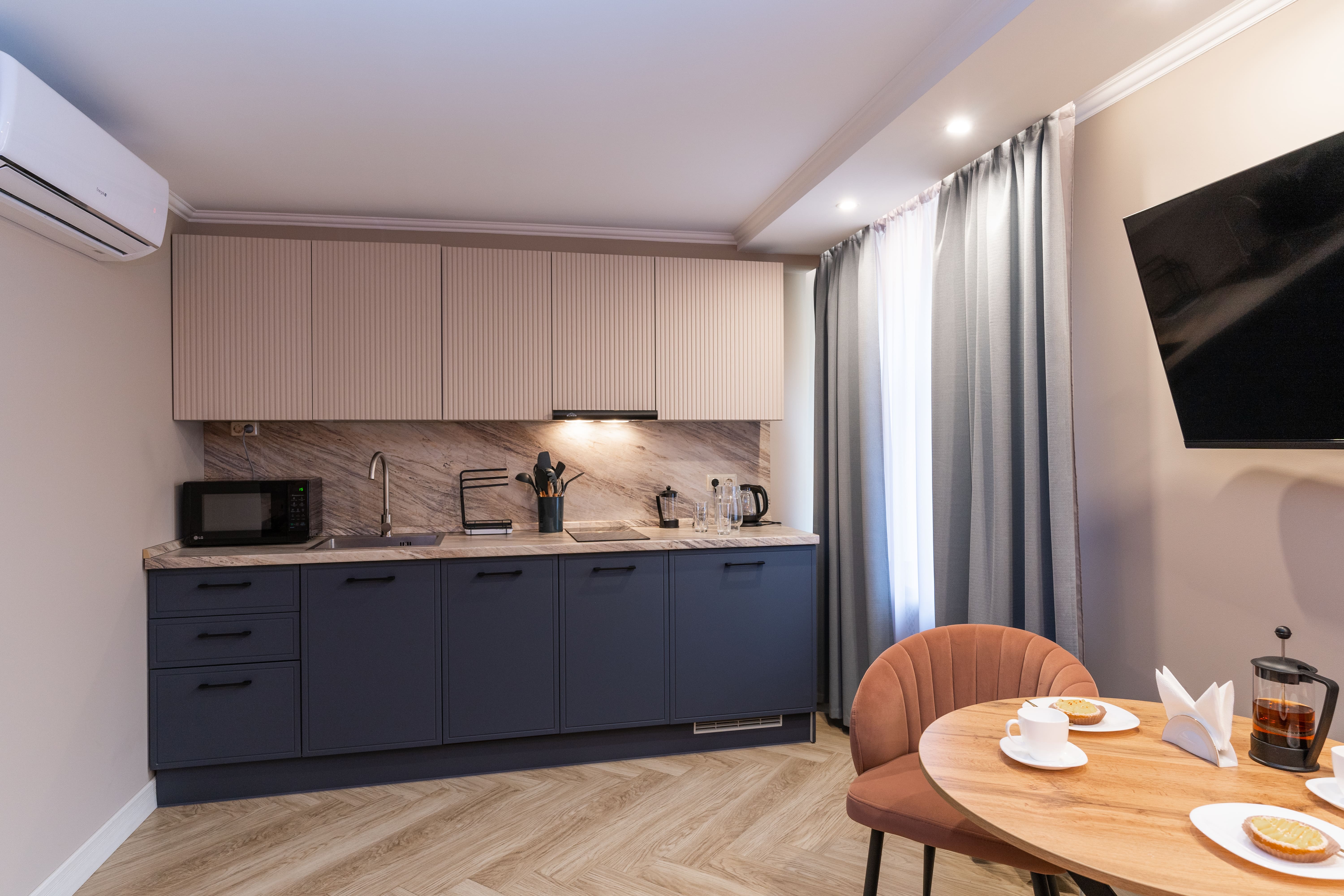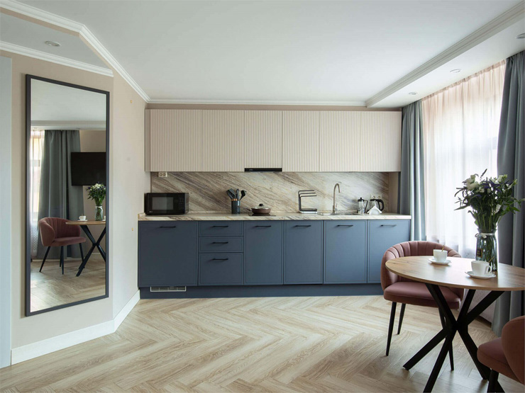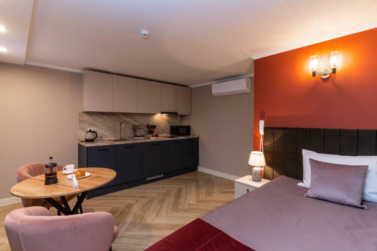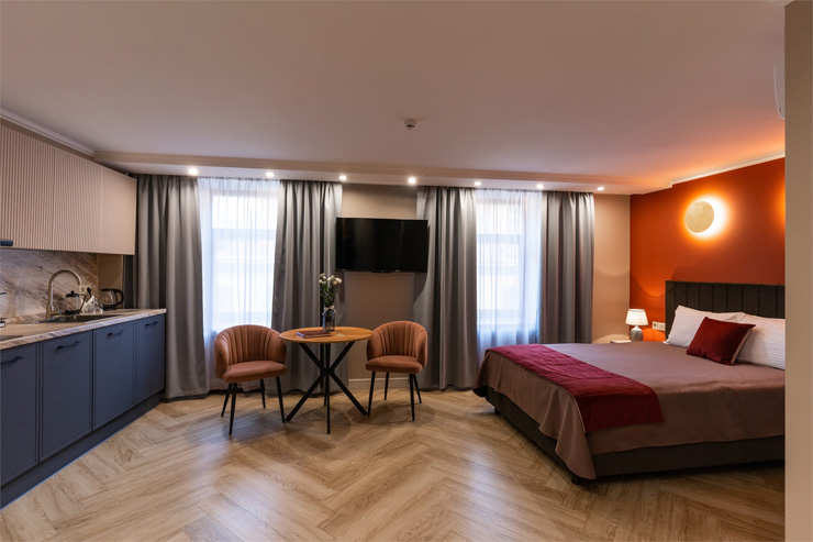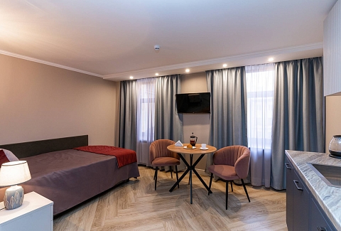 В номере: вешалка, зеркало, кровать односпальная, прикроватная тумбочка, стол, стулья, шкаф, гладильная доска, кондиционер, микроволновая печь, мини-холодильник, набор посуды, плита электрическая, посудомоечная машина, сейф, стиральная машина, сушилка для белья, телевизор, телефон, утюг, электрочайник