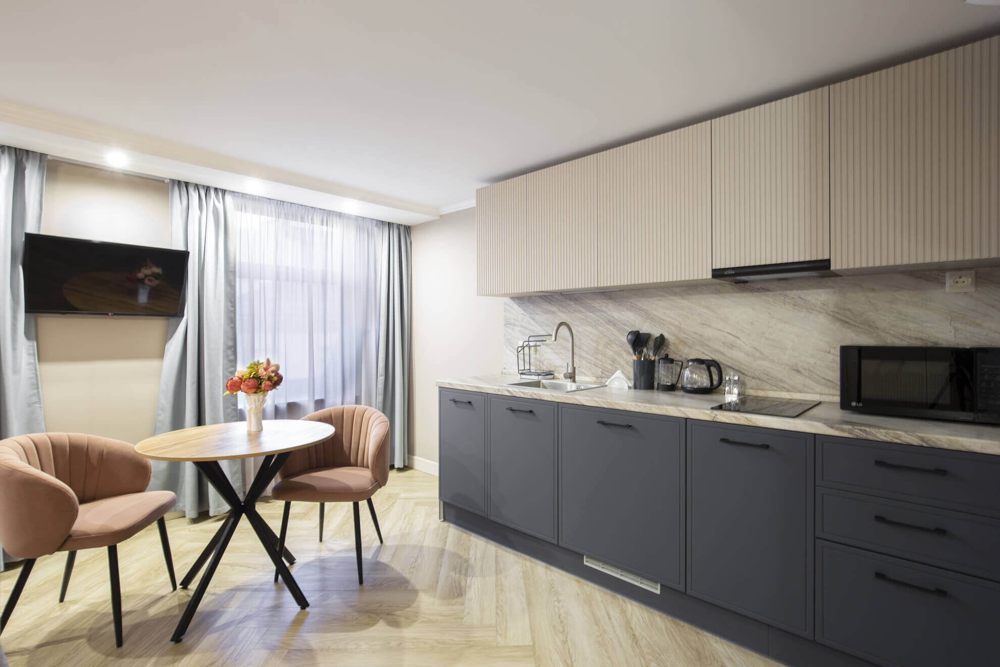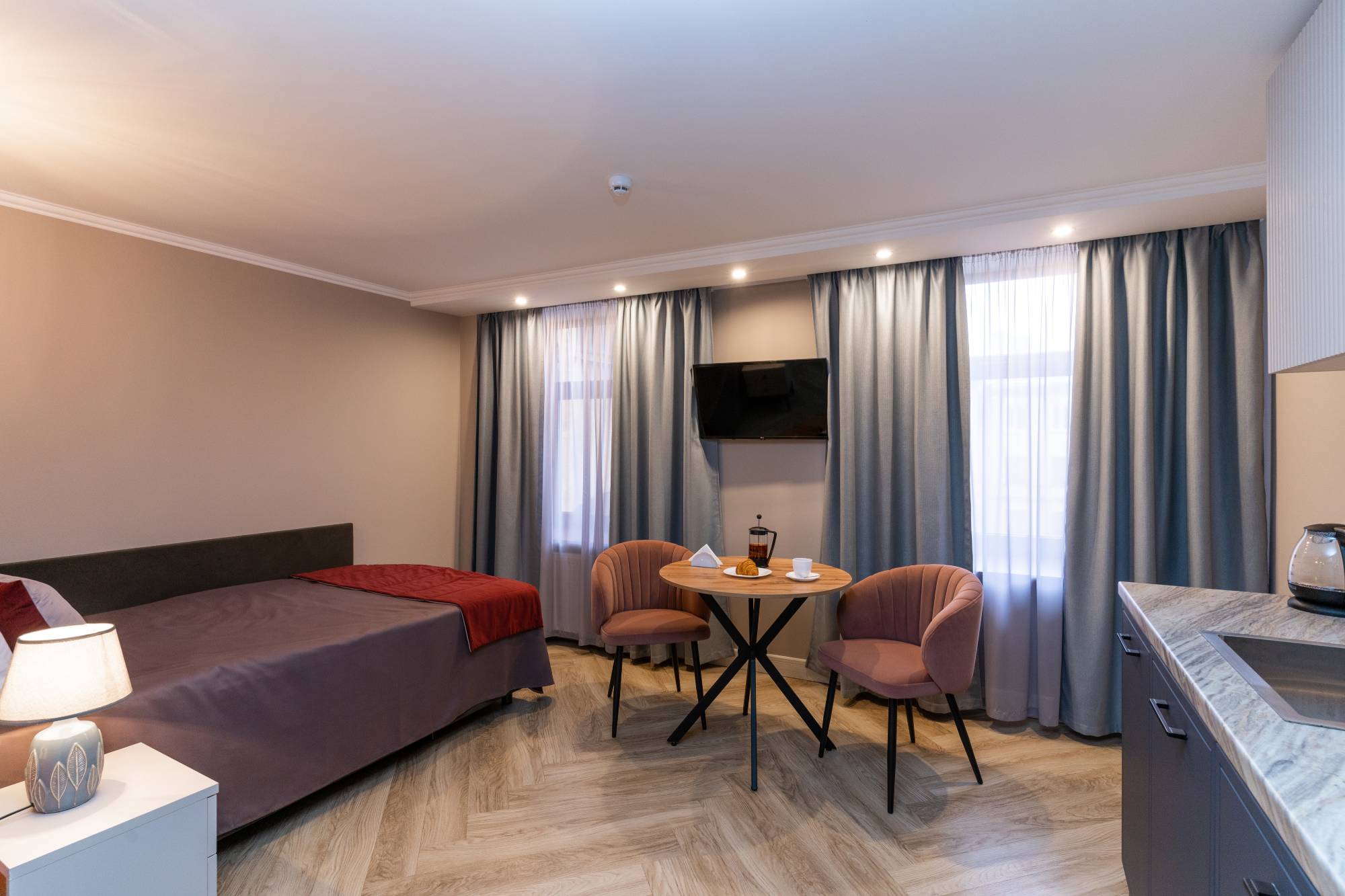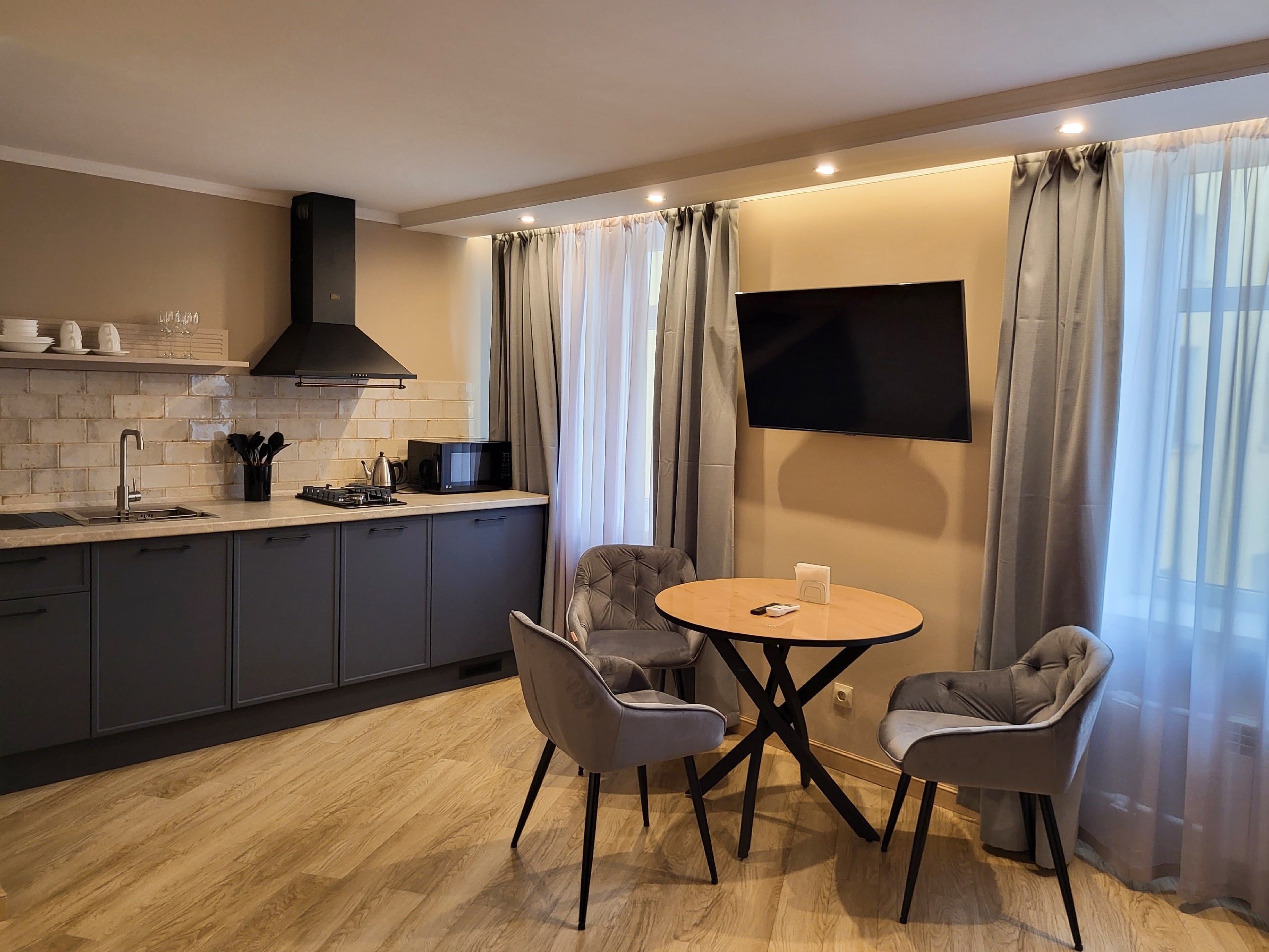 В номере: вешалка, зеркало, кровать односпальная, прикроватная тумбочка, стол, стулья, шкаф, гладильная доска, кондиционер, микроволновая печь, мини-холодильник, набор посуды, плита электрическая, посудомоечная машина, сейф, стиральная машина, сушилка для белья, телевизор, телефон, утюг, электрочайник