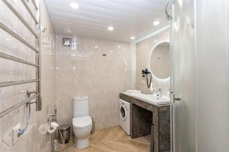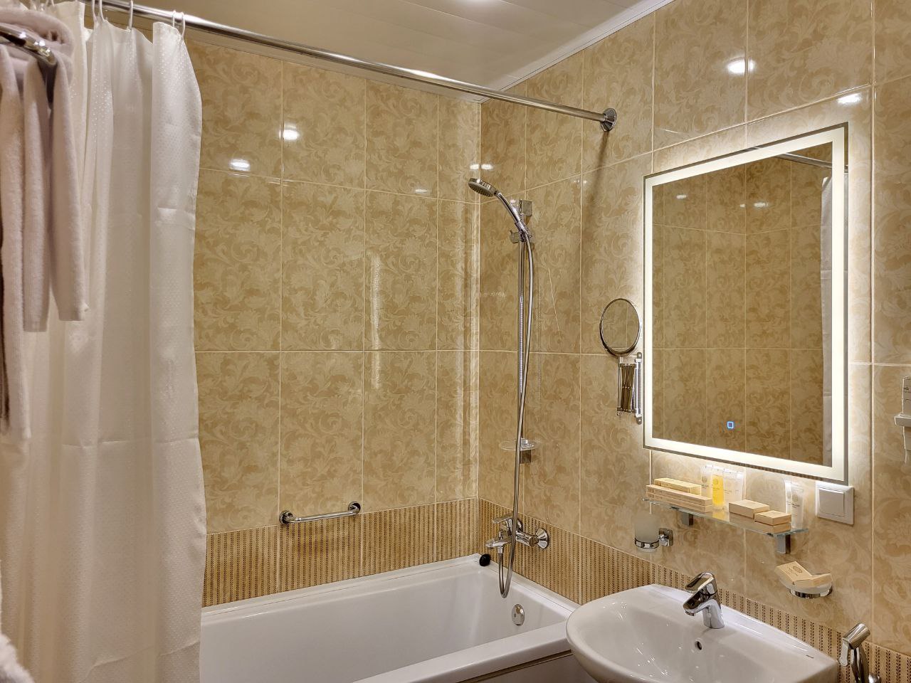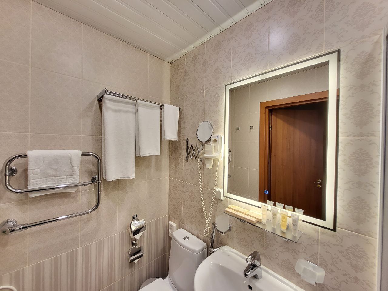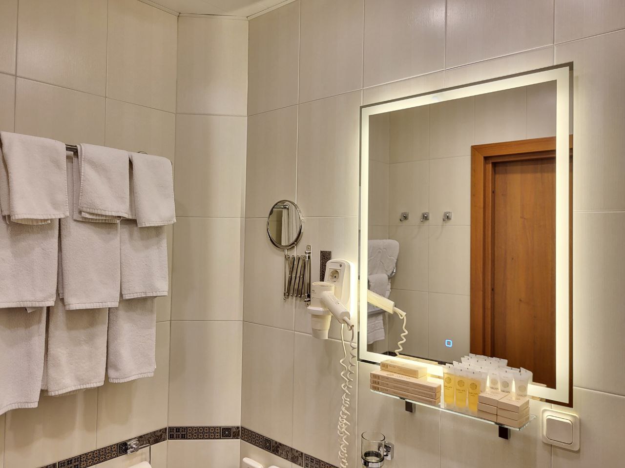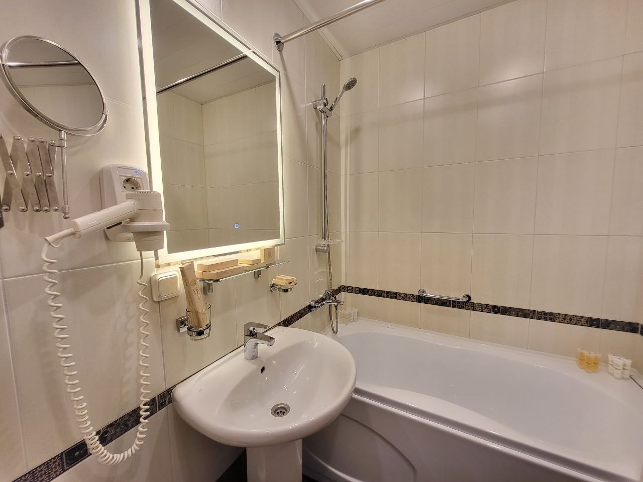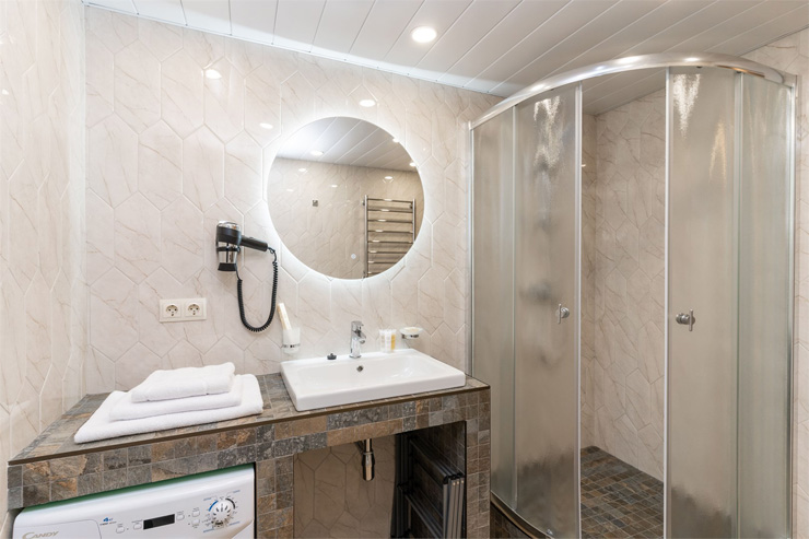 Санузел: с ванной или душевой кабиной, тапочки, туалетные принадлежности, фен, халат
