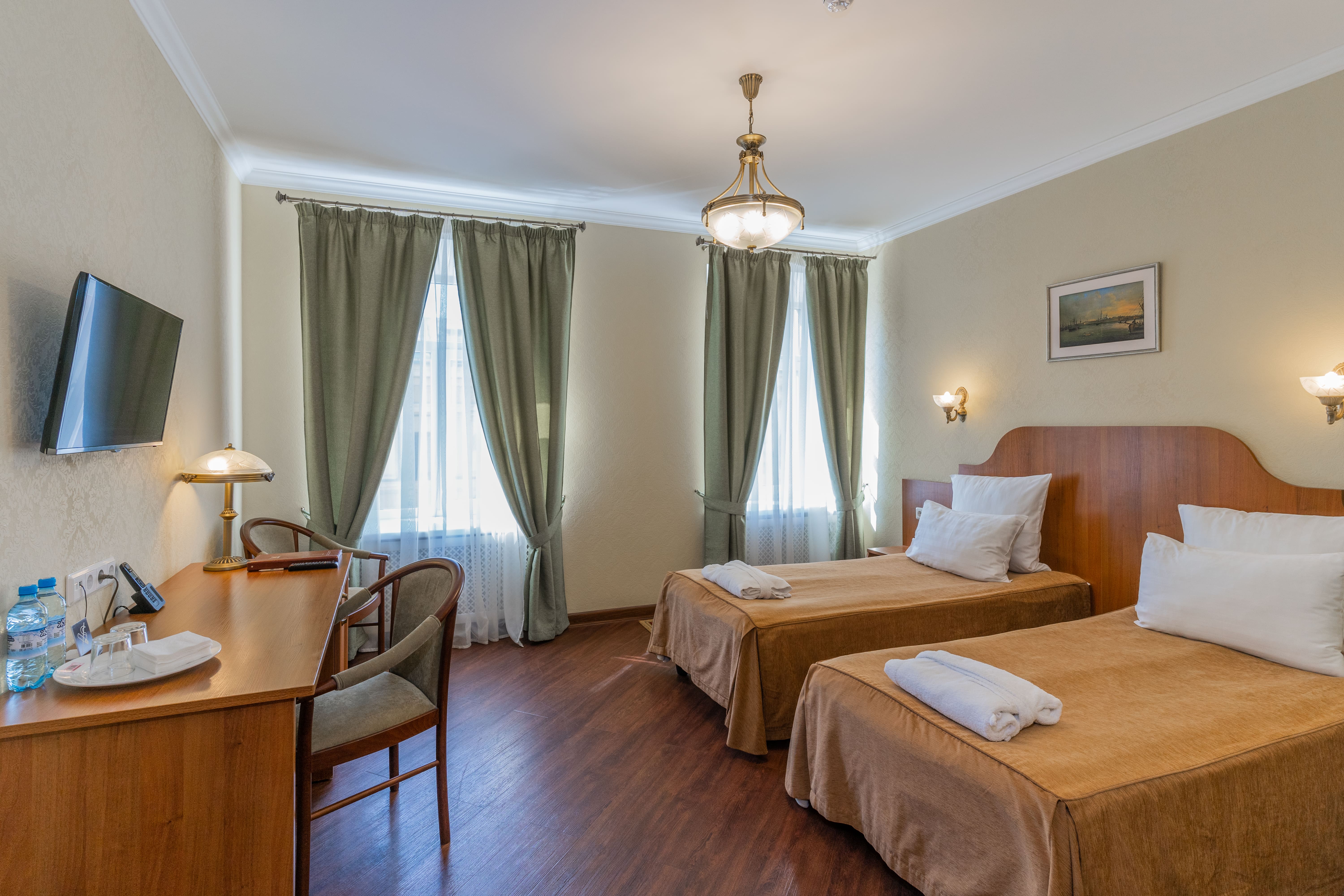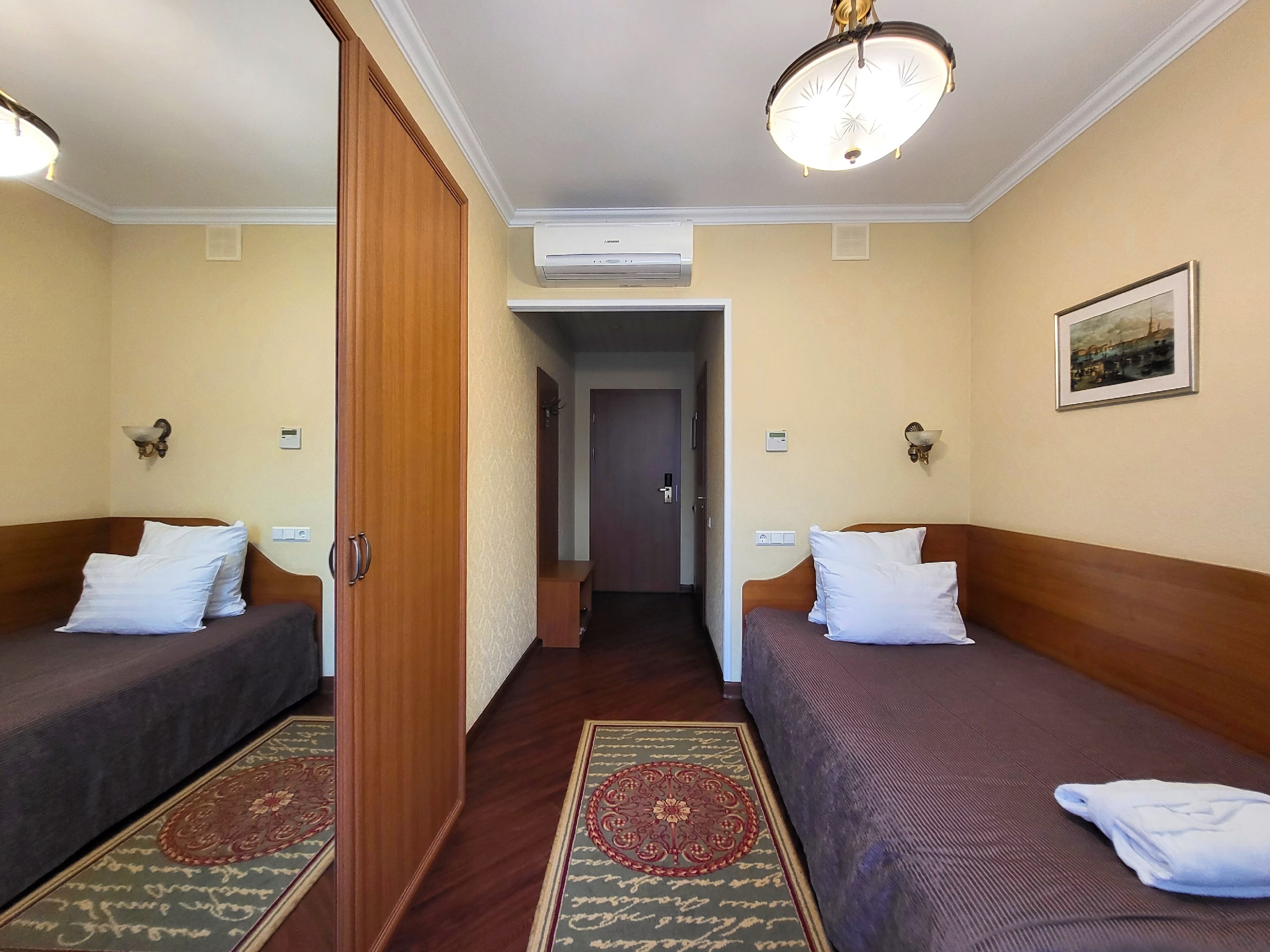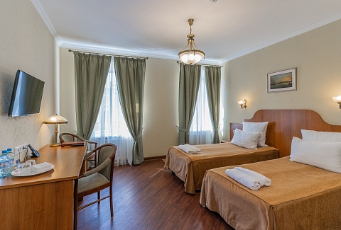 В номере: вешалка, зеркало, кровати односпальные /одна двуспальная кровать, стол, стулья, тумба багажная, шкаф, кондиционер, сейф, телевизор, телефон, холодильник