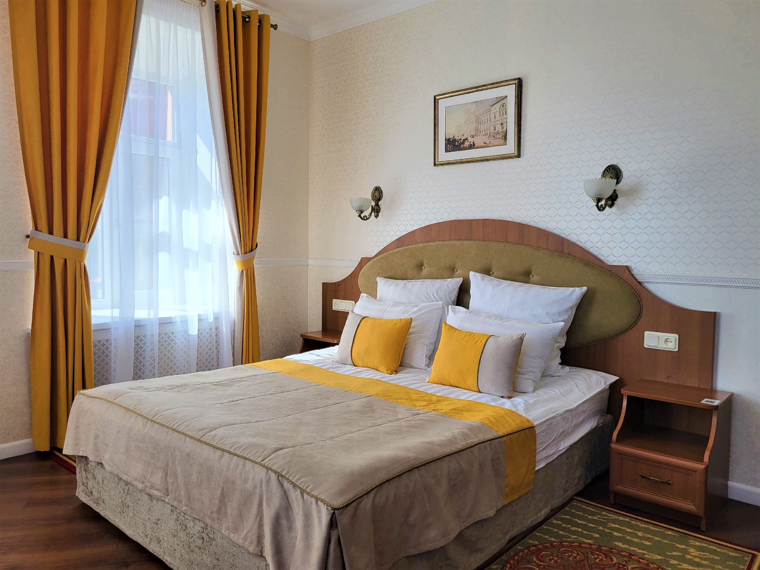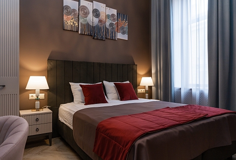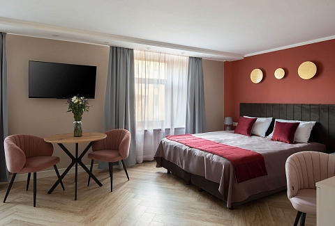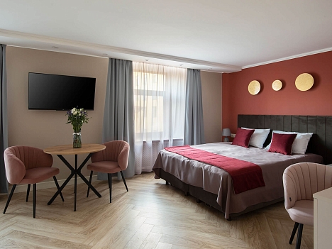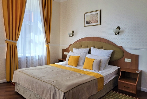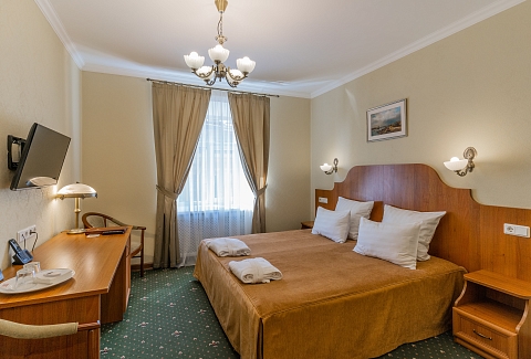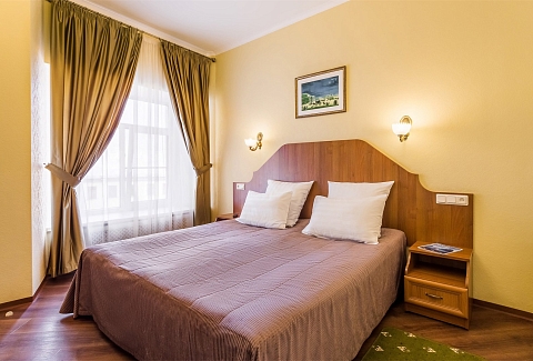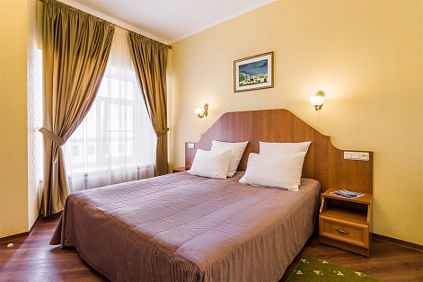 Отель вмещает до 70-ти отдыхающих и предлагает гостям классические номера разных категорий комфорта. Везде есть удобный мебельный гарнитур, санузел с ванной или душем, а также кондиционер, пламенный телевизор, холодильник, беспроводной интернет, в ряде номеров предусмотрены балконы. В отеле работает банкетный зал, где для гостей по утрам накрываются завтраки. А отдыхающим с детьми по запросу предоставляются кроватки-манежи.