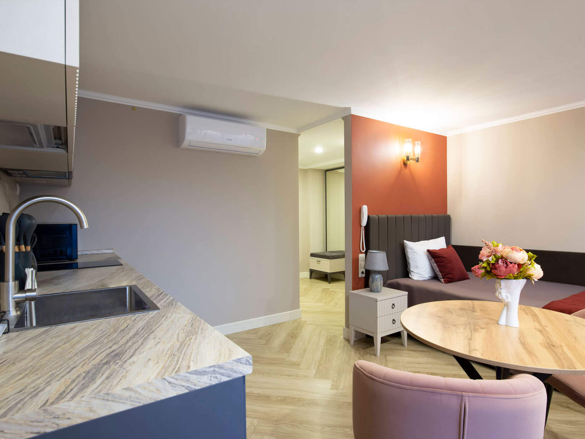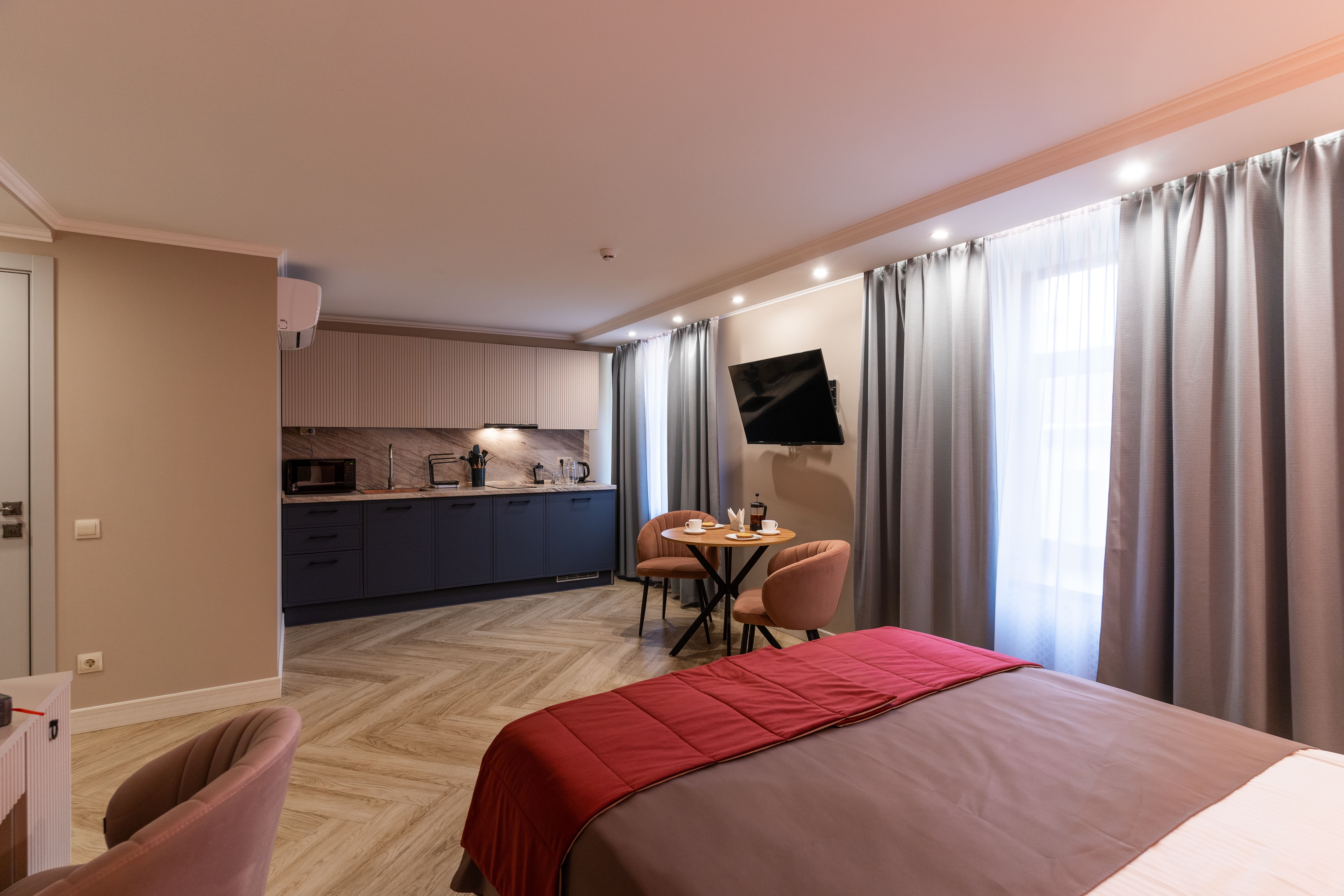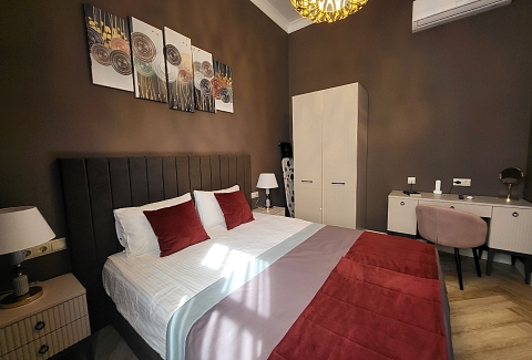 В номере: вешалка, диван, зеркало, кровать двуспальная, прикроватные тумбочки, стол, стулья, шкаф, кондиционер, микроволновая печь, мини-холодильник, набор посуды, плита газовая, стиральная машина, телевизор, телефон, электрочайник