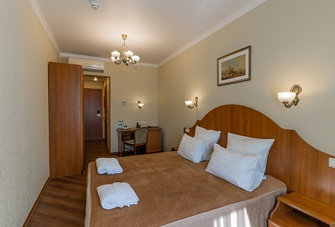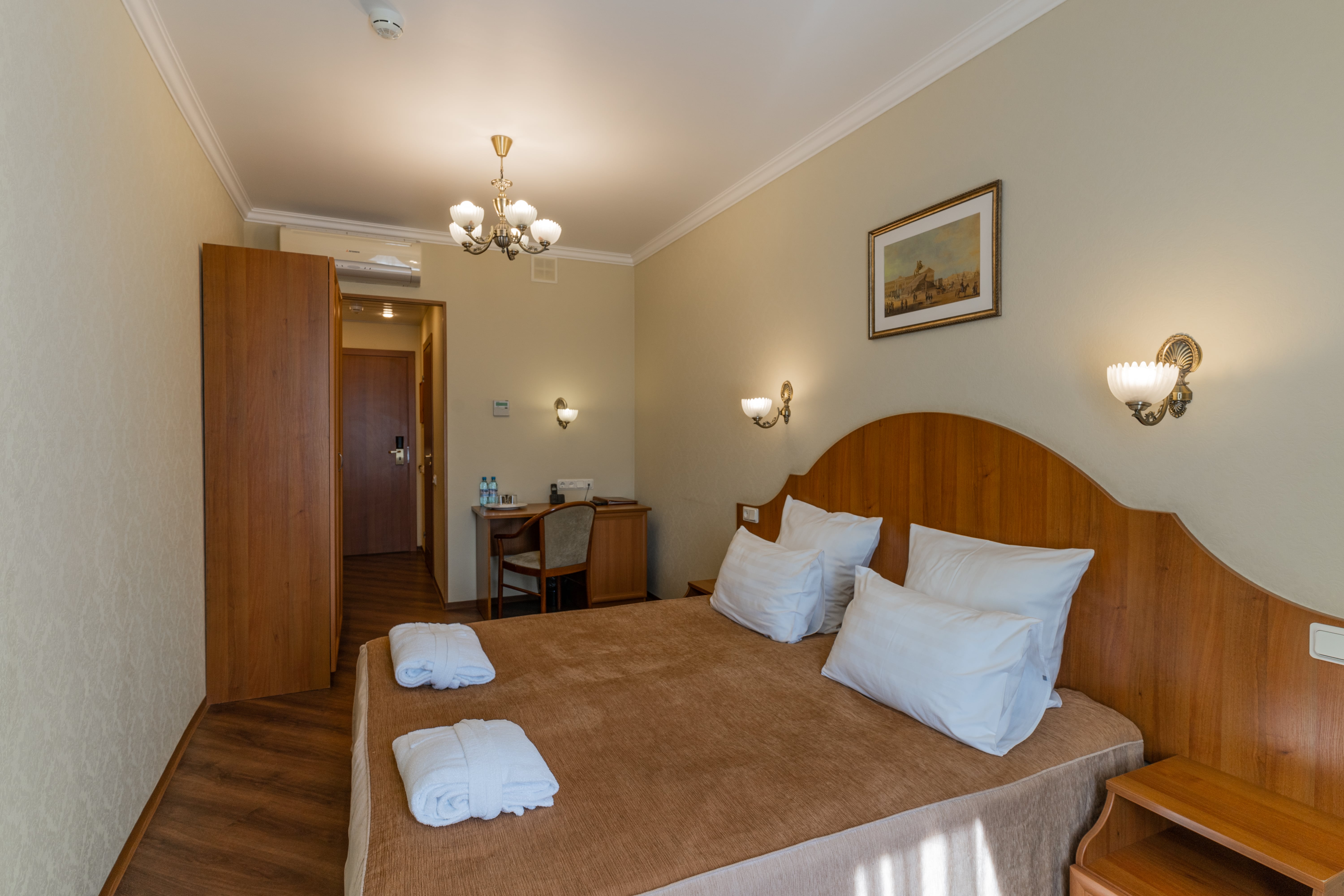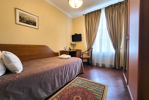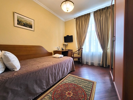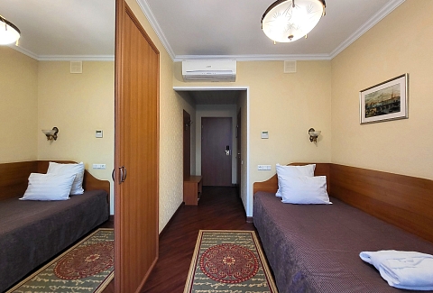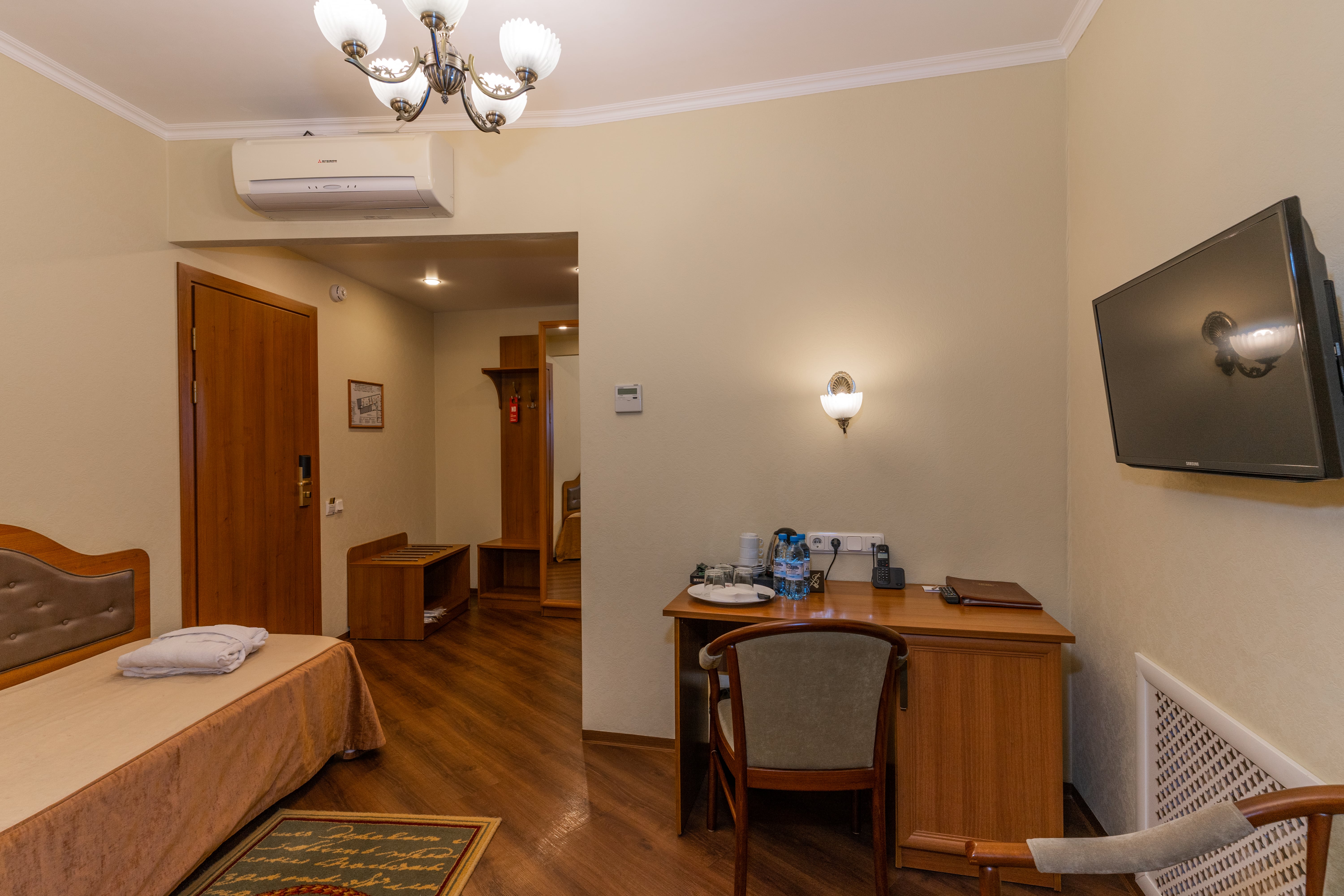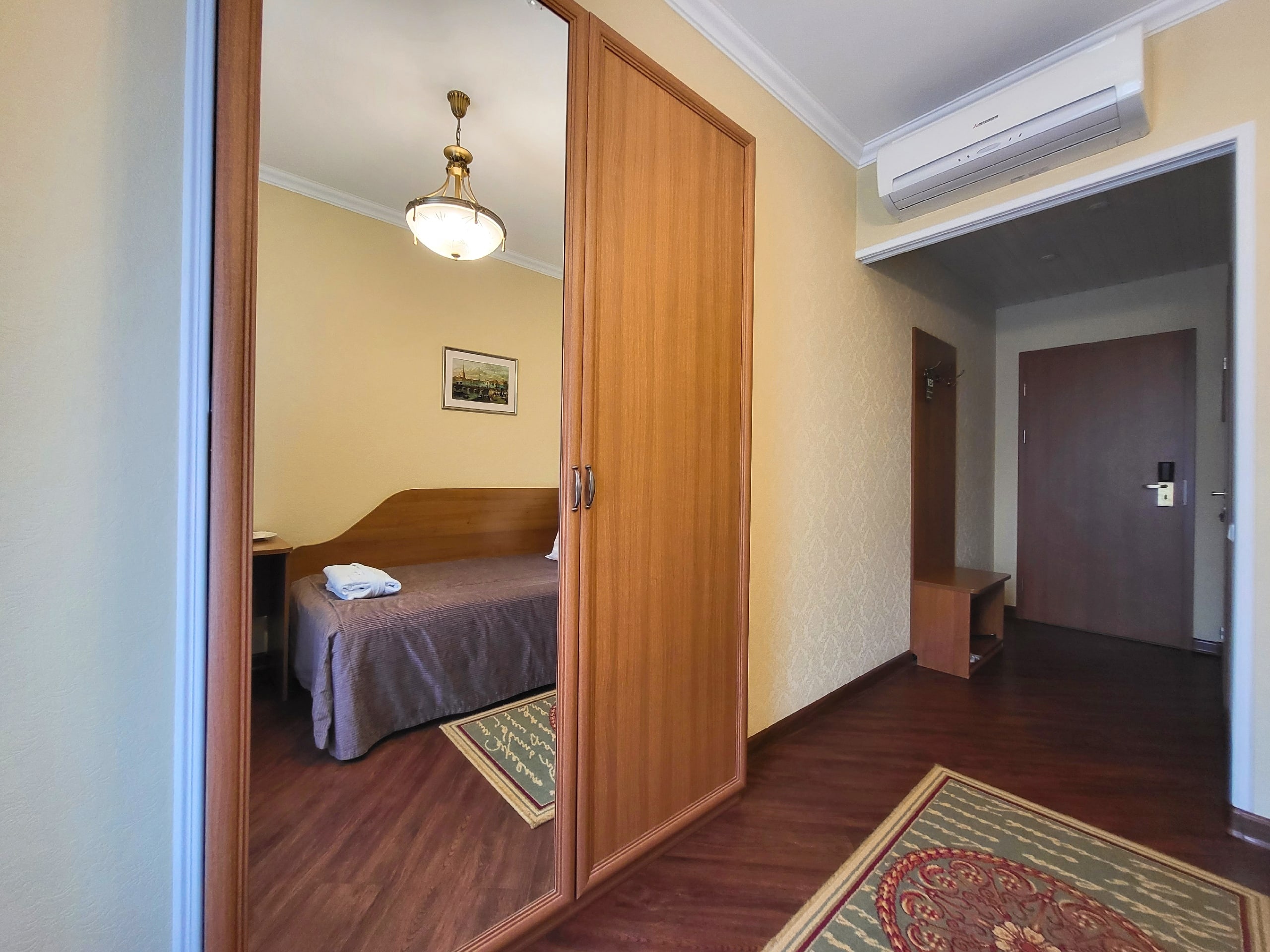 В номере: вешалка, зеркало, кровать односпальная, прикроватная тумбочка, стол, стул, шкаф, кондиционер, сейф, телевизор, телефон, холодильник