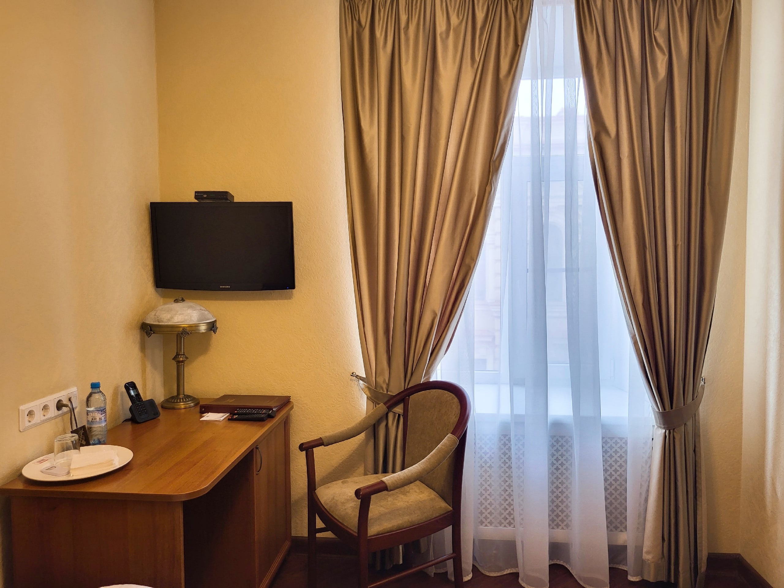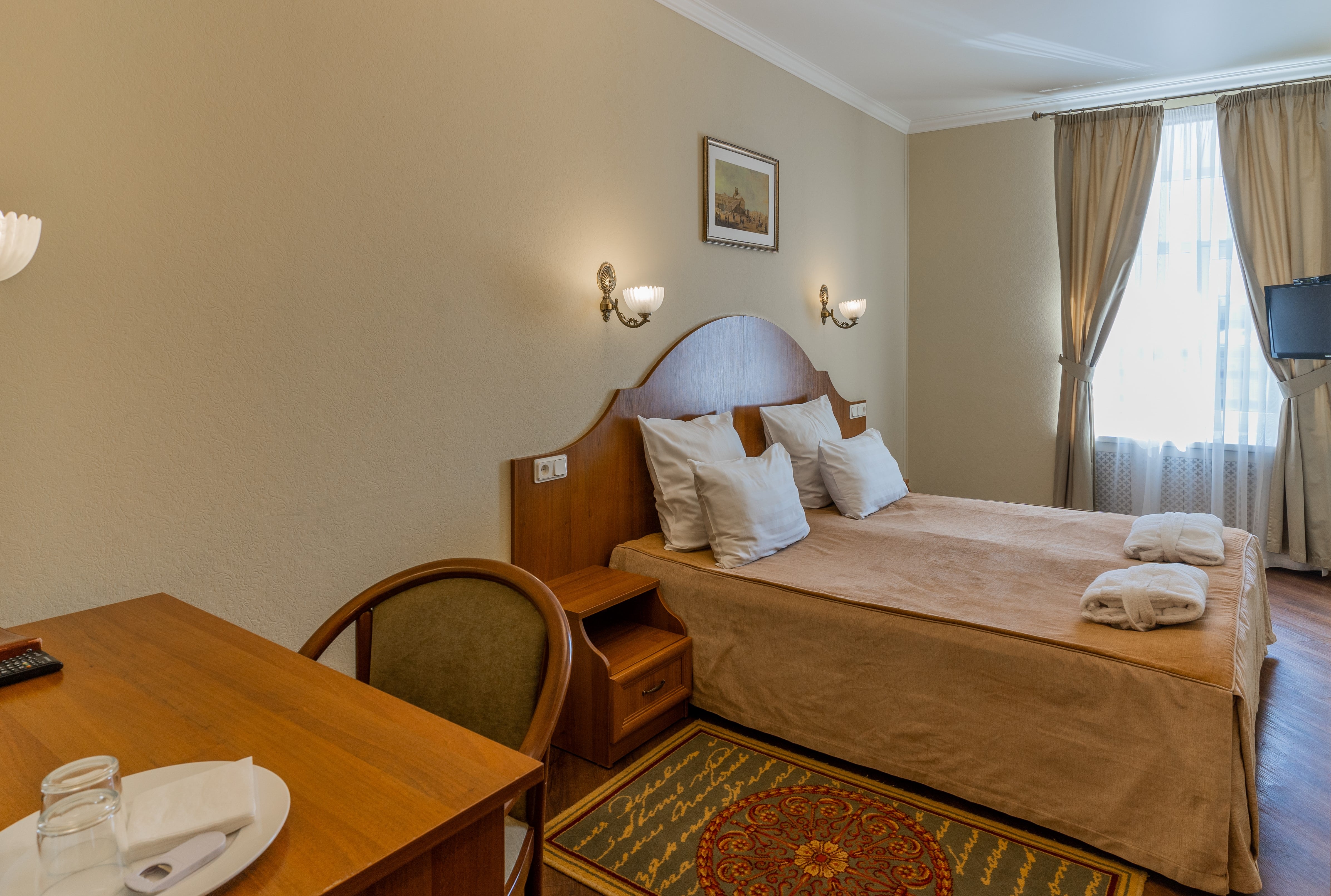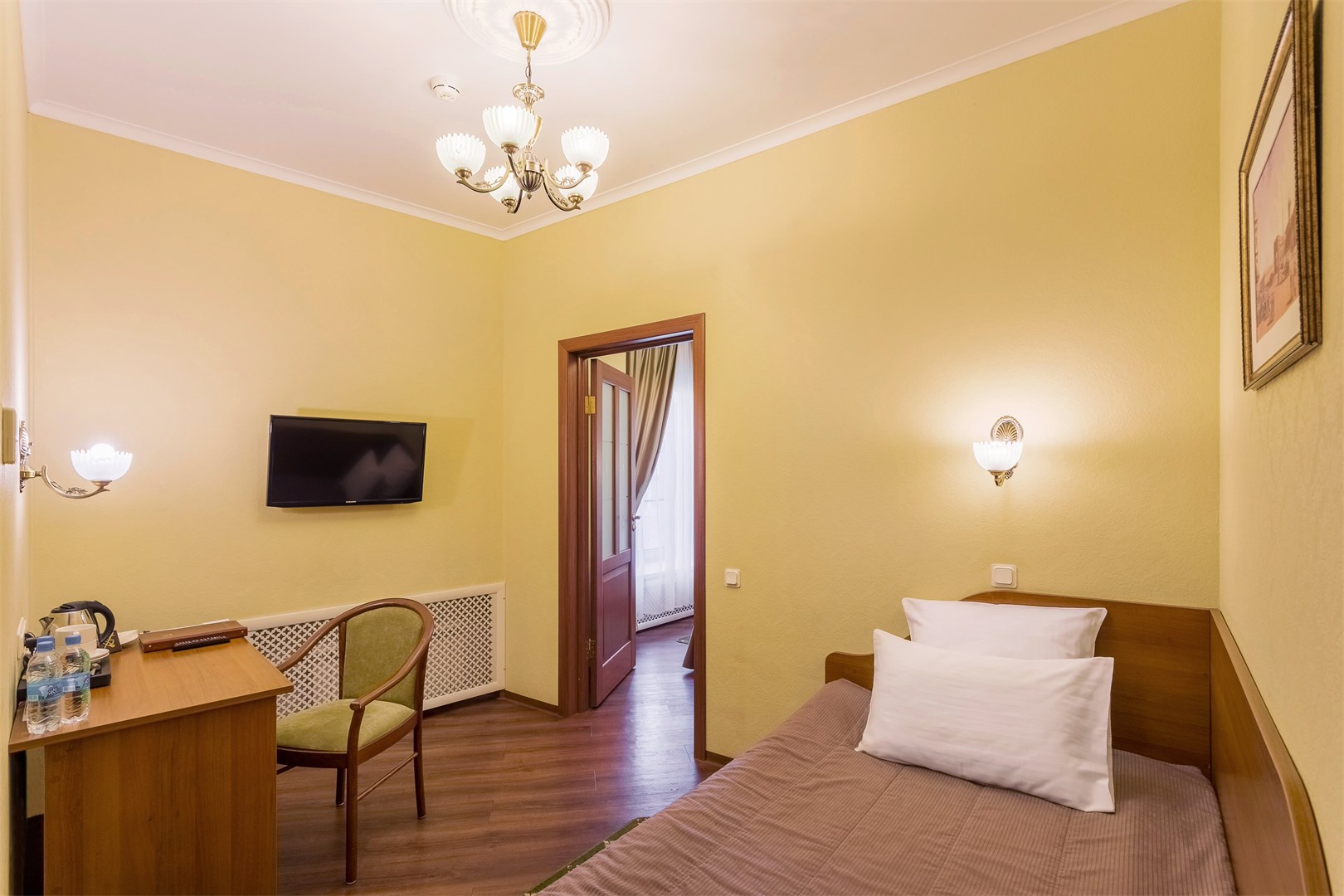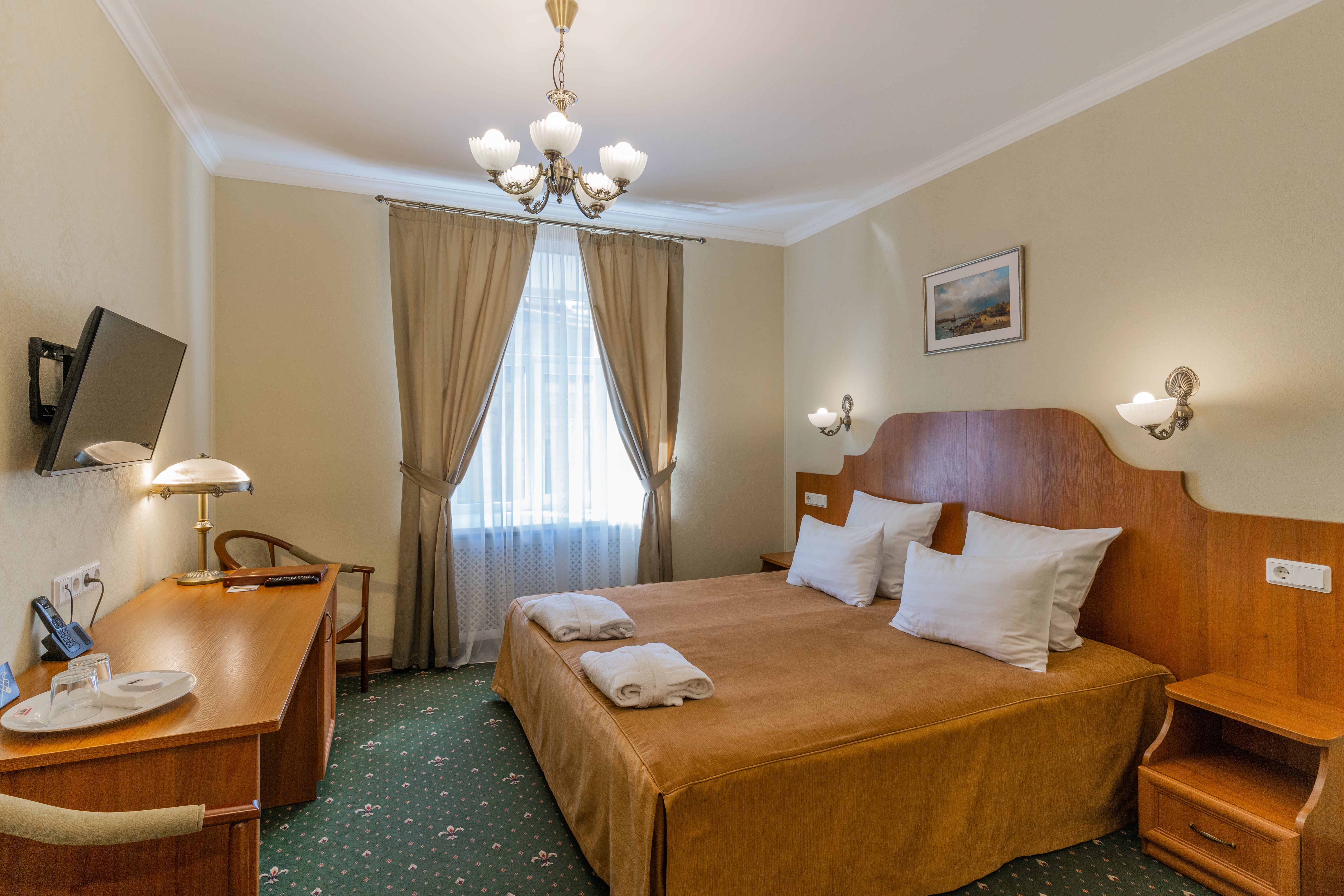 В номере: вешалка, зеркало, кровать односпальная, прикроватная тумбочка, стол, стул, шкаф, кондиционер, сейф, телевизор, телефон, холодильник