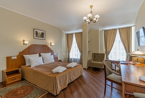 В номере: вешалка, зеркало, кресло-кровать, кровати односпальные /одна двуспальная кровать, прикроватные тумбочки, стол, столик журнальный, стулья, тумба багажная, шкаф, кондиционер, сейф, телевизор, телефон, холодильник