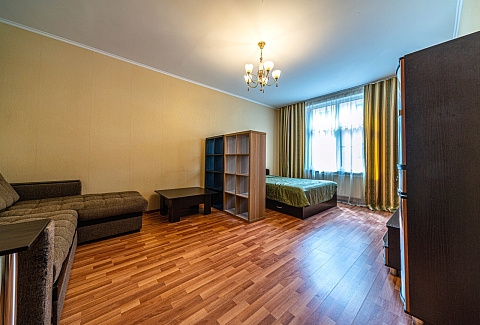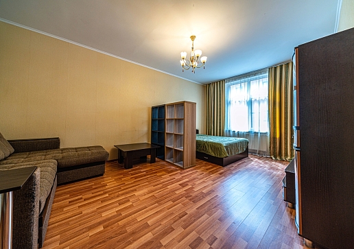 В номере: вешалка, диван, зеркало, кровать двуспальная, стол, стулья, шкаф, духовой шкаф, микроволновая печь, набор посуды, плита индукционная, стиральная машина, телевизор, холодильник, чайный набор посуды, электрочайник