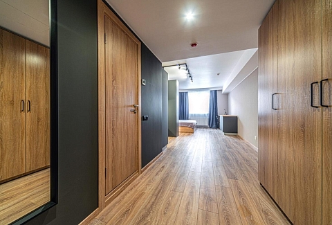 В номере: вешалка, зеркало, кровать двуспальная, прикроватные тумбочки, стол, стулья, шкаф, микроволновая печь, набор посуды, плита электрическая, стиральная машина, телевизор ЖК, холодильник, чайный набор посуды, электрочайник