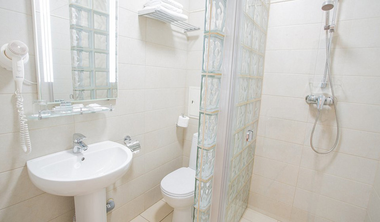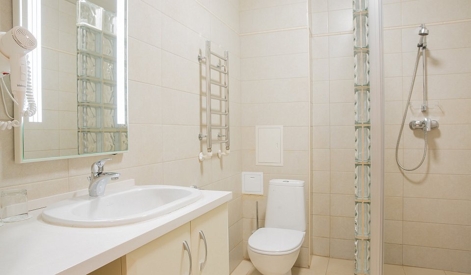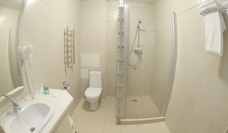 Санузел: с душем, туалетные принадлежности, фен, халат