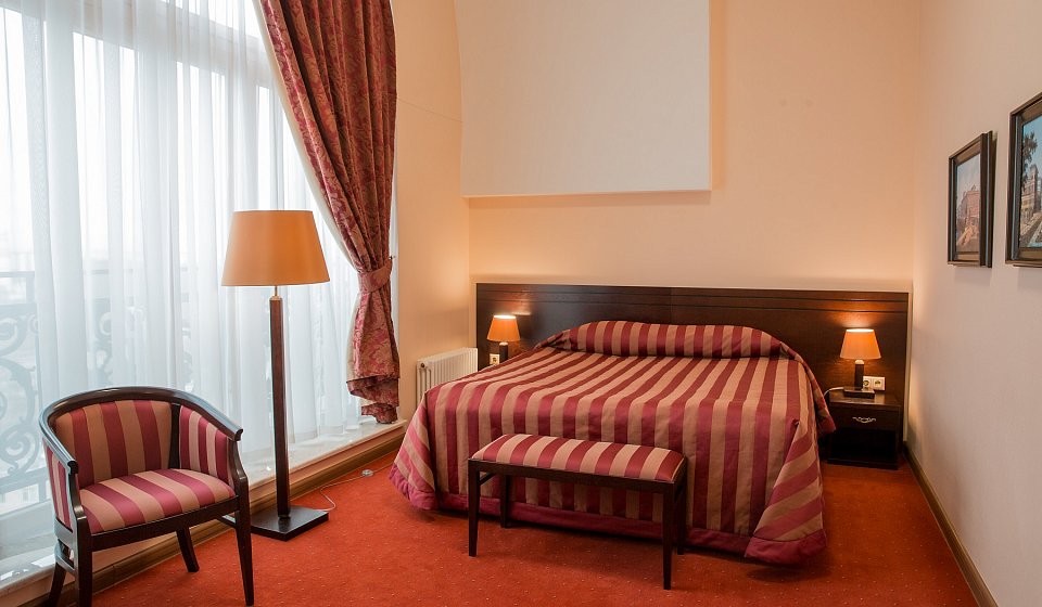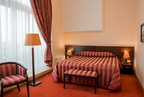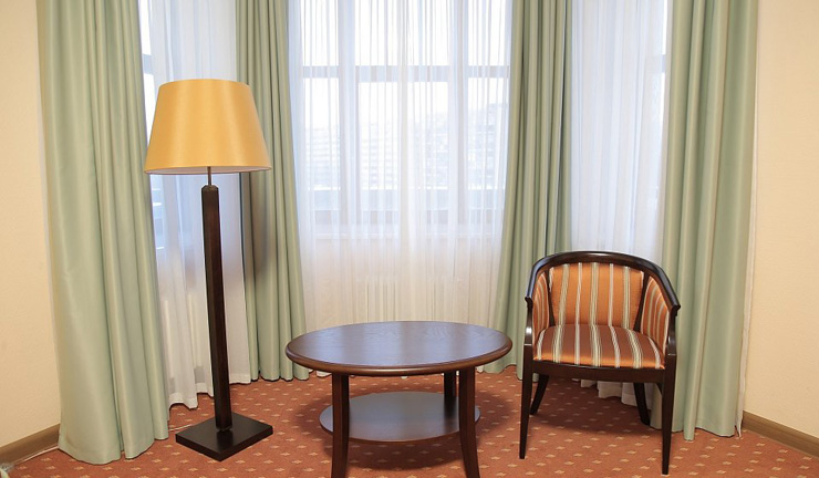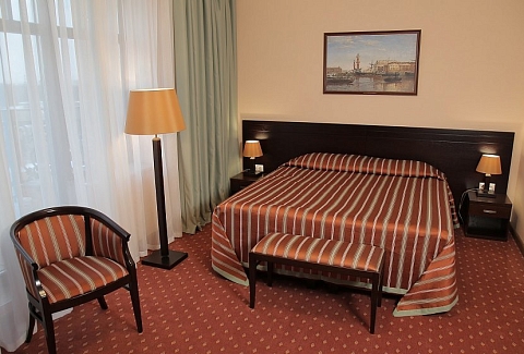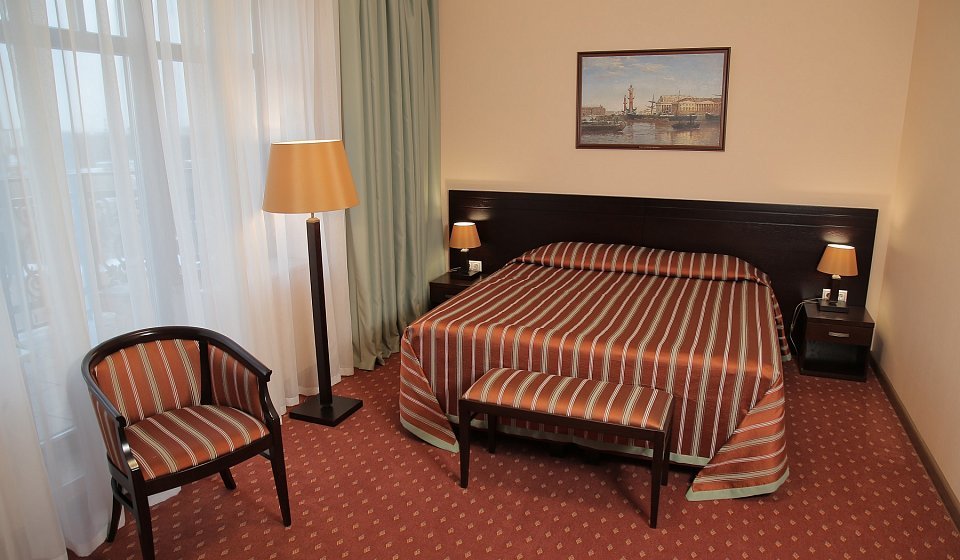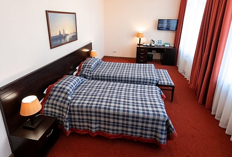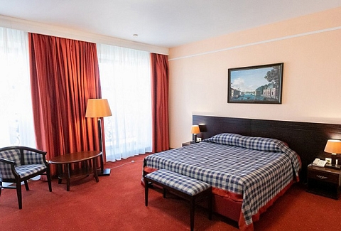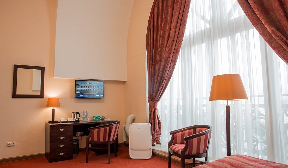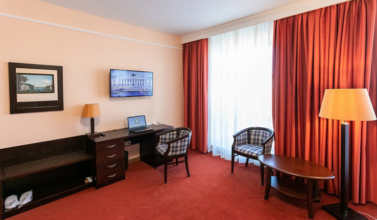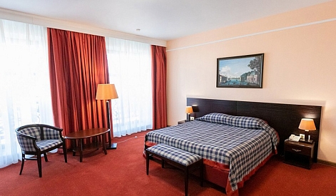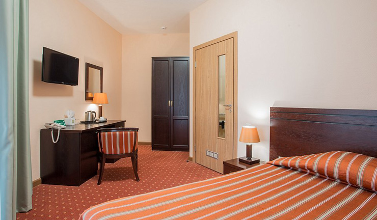 В номере: зеркало, ковровое покрытие, кровать двуспальная/ две полутороспальные кровати, прикроватные тумбочки, стол, стулья, шкаф, мини-холодильник, сейф, телевизор, телефон, чайная станция, чайный набор посуды, электрочайник