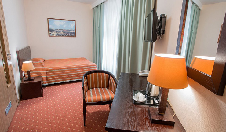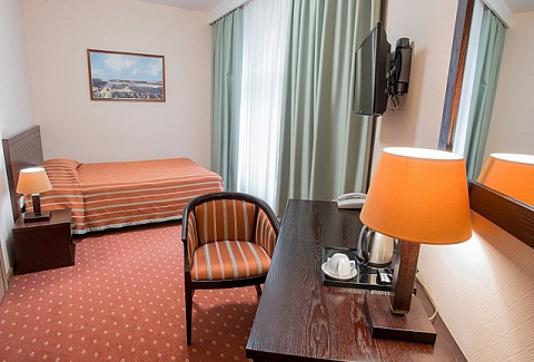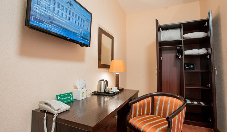 В номере: зеркало, ковровое покрытие, кровать полутороспальная, прикроватная тумбочка, стол, стул, шкаф, мини-холодильник, сейф, телевизор, телефон, чайная станция, чайный набор посуды, электрочайник