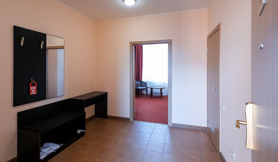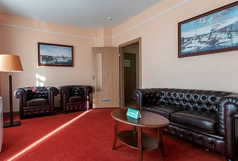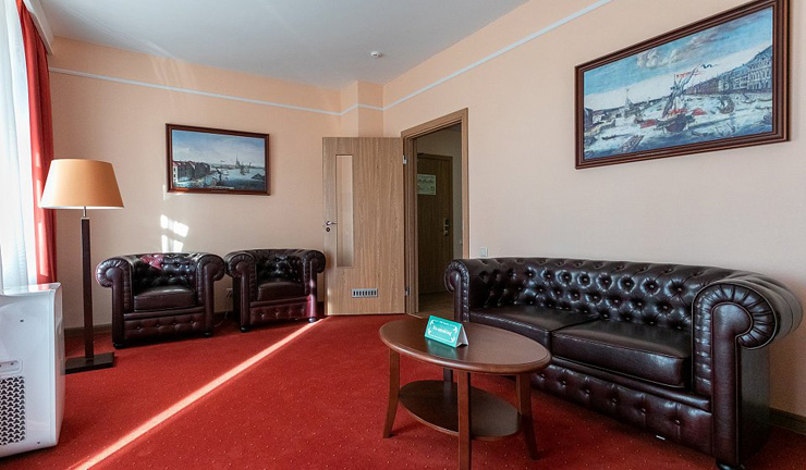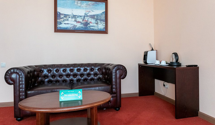 В номере: вешалка, диван, зеркало, ковровое покрытие, кресла, кровать двуспальная, прикроватные тумбочки, стол, стулья, шкаф, гладильная доска, кондиционер, кофемашина, мини-холодильник, сейф, телевизор, телефон, утюг, чайная станция, чайный набор посуды, электрочайник