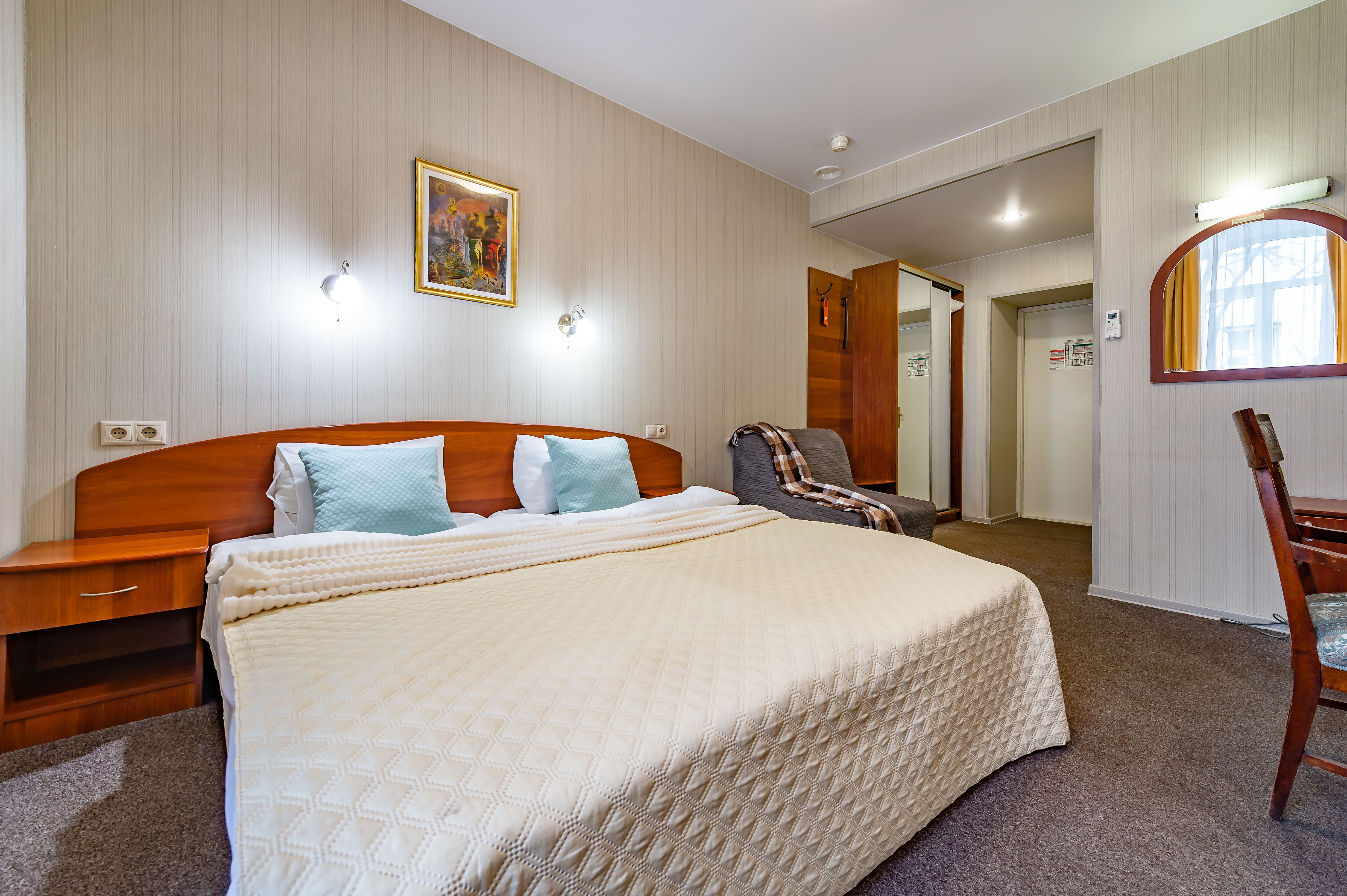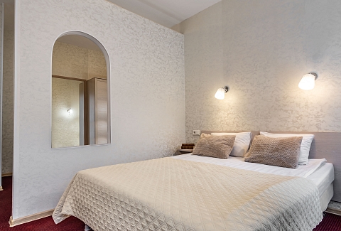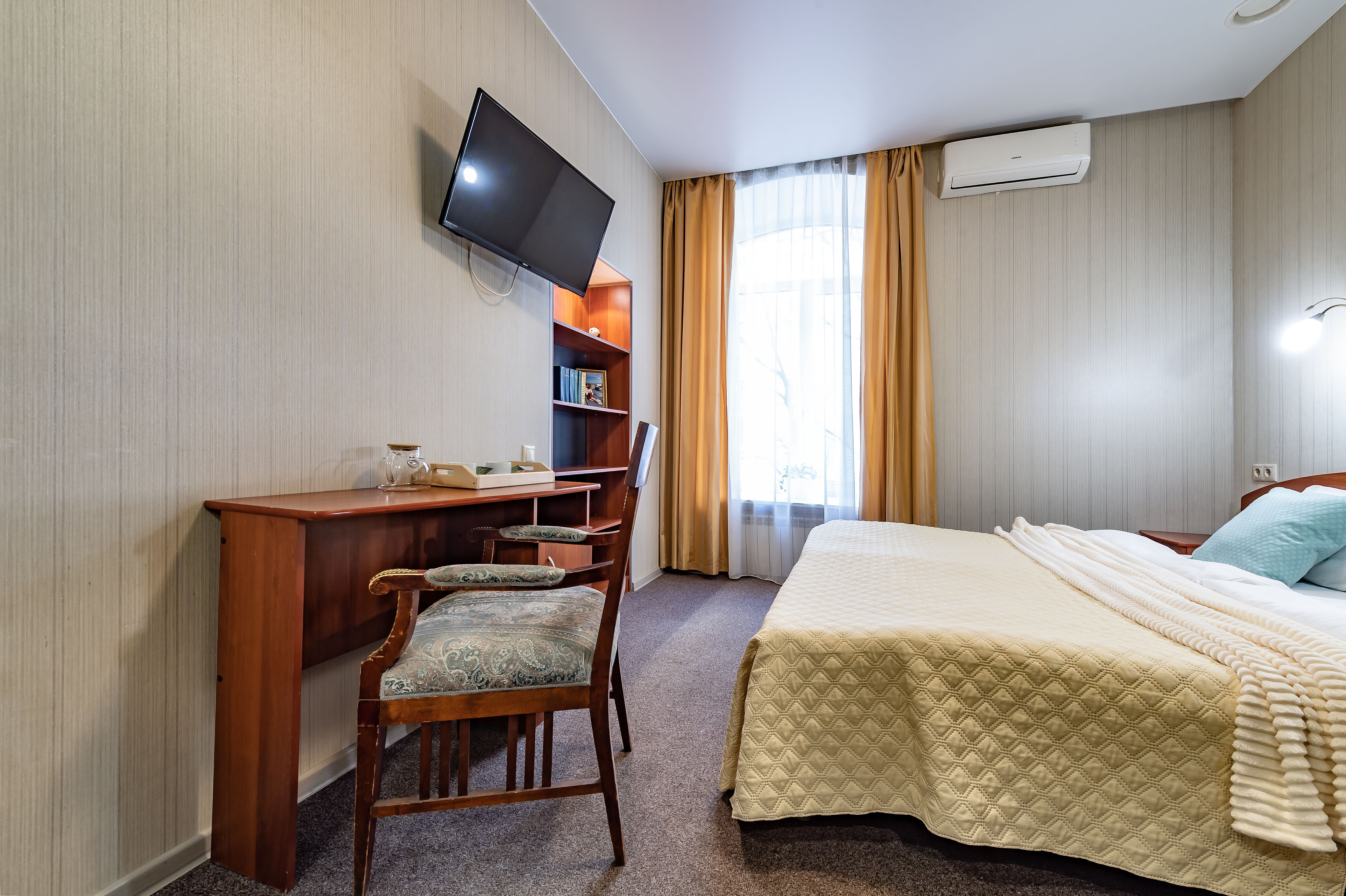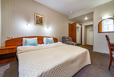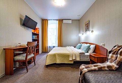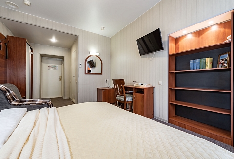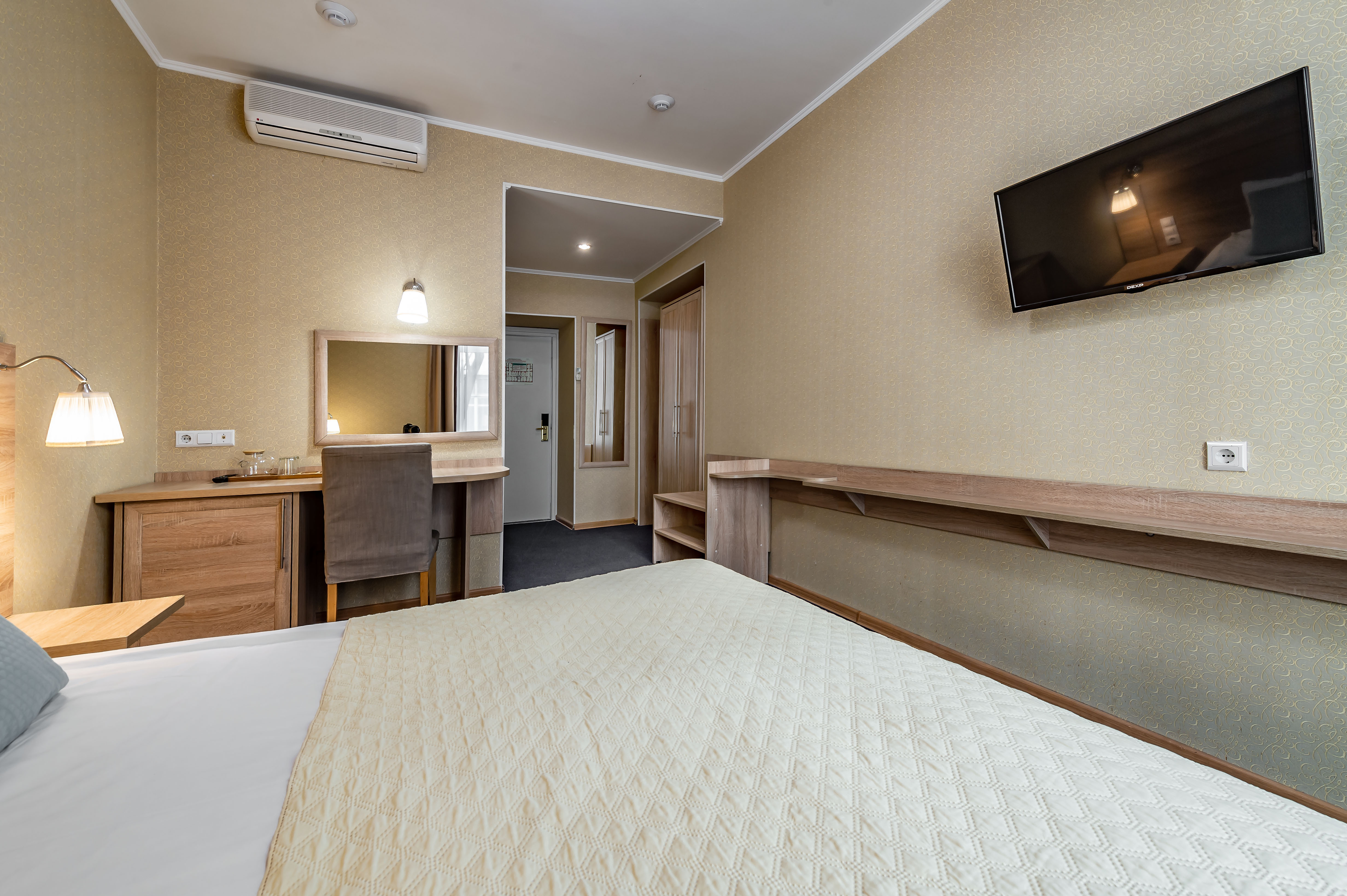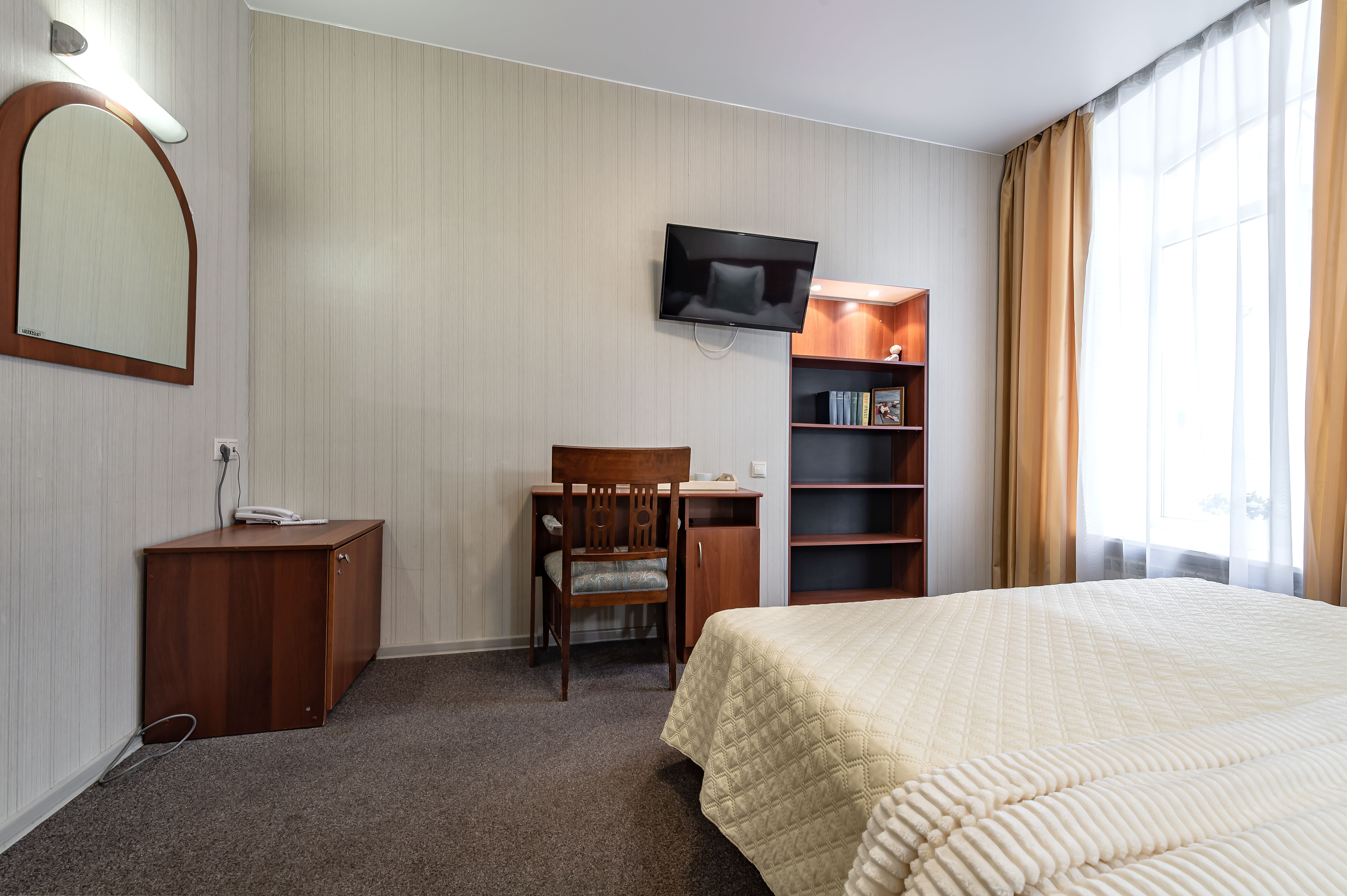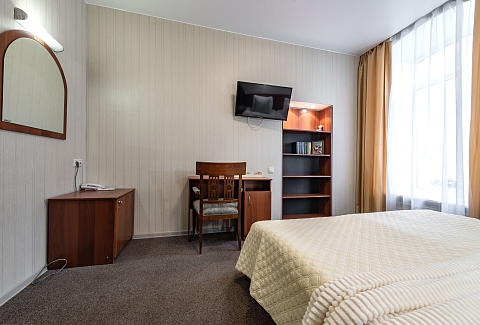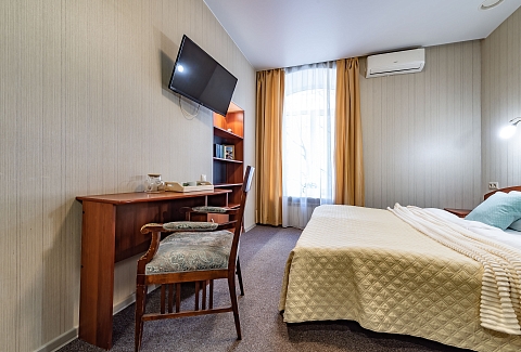 В номере: вешалка, зеркало, кровать двуспальная/ две полутороспальные кровати, прикроватные тумбочки, стол, стулья, шкаф, мини-холодильник, сплит-система, телевизор