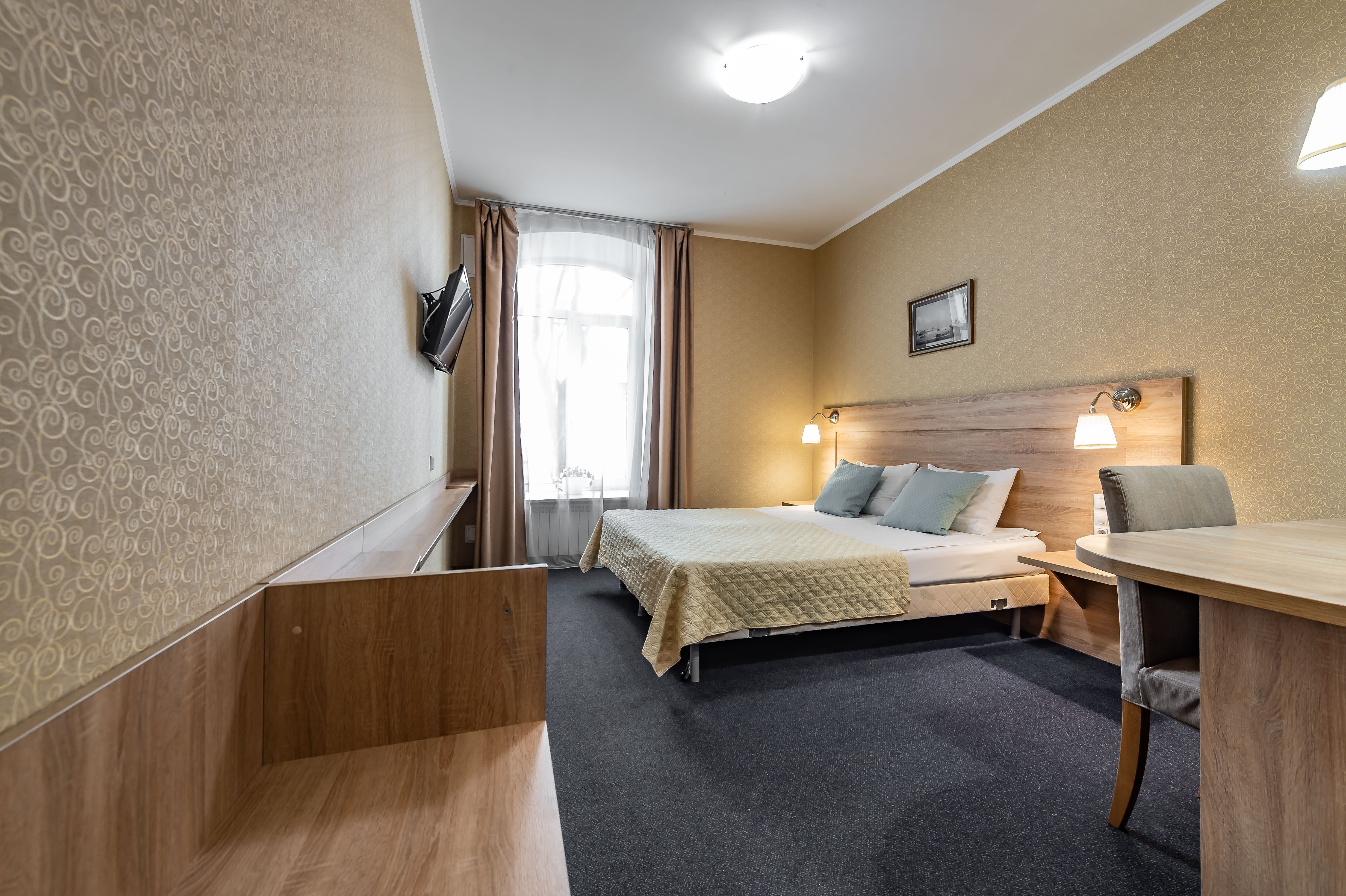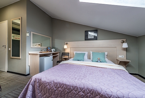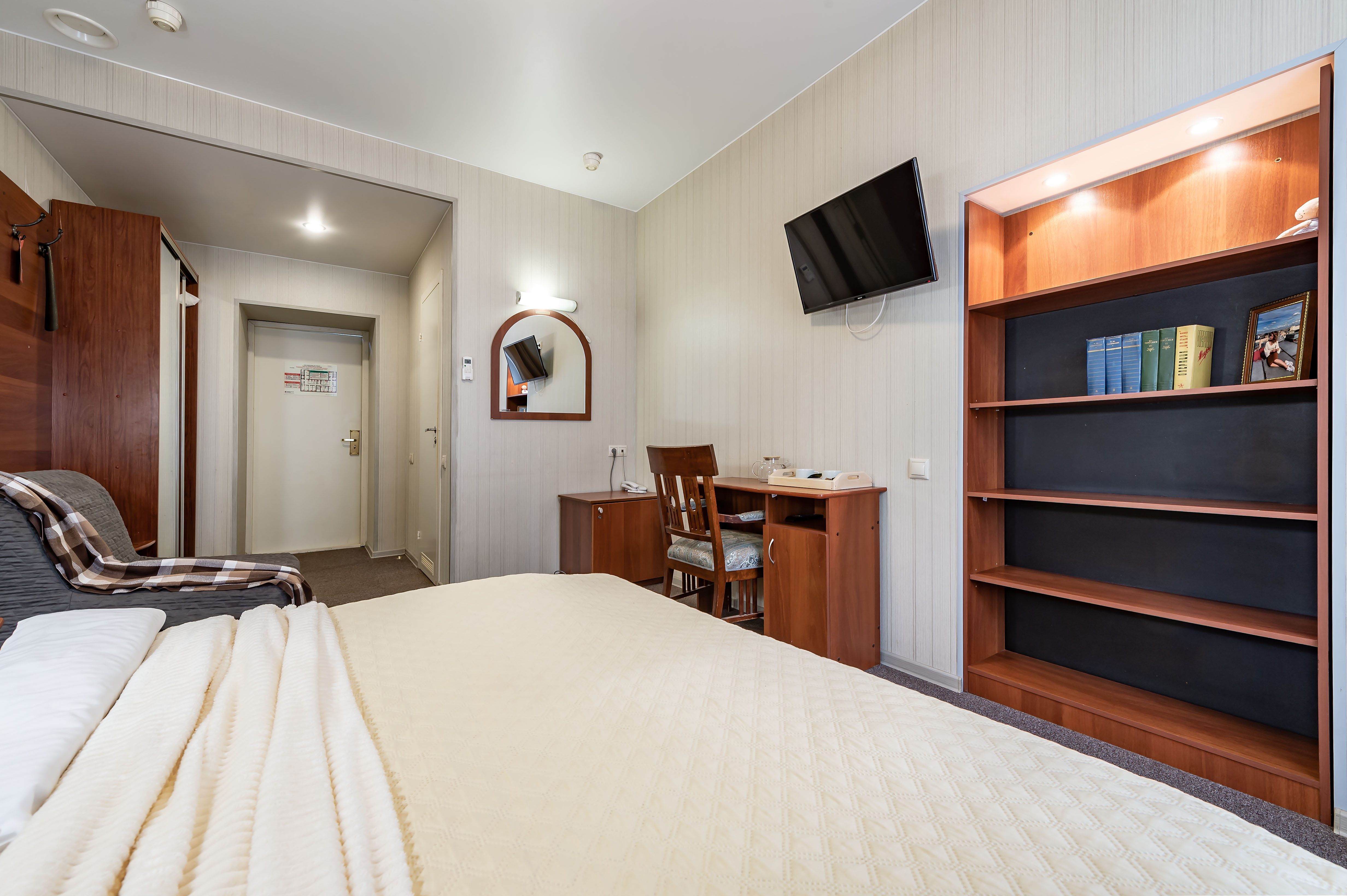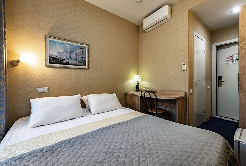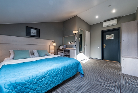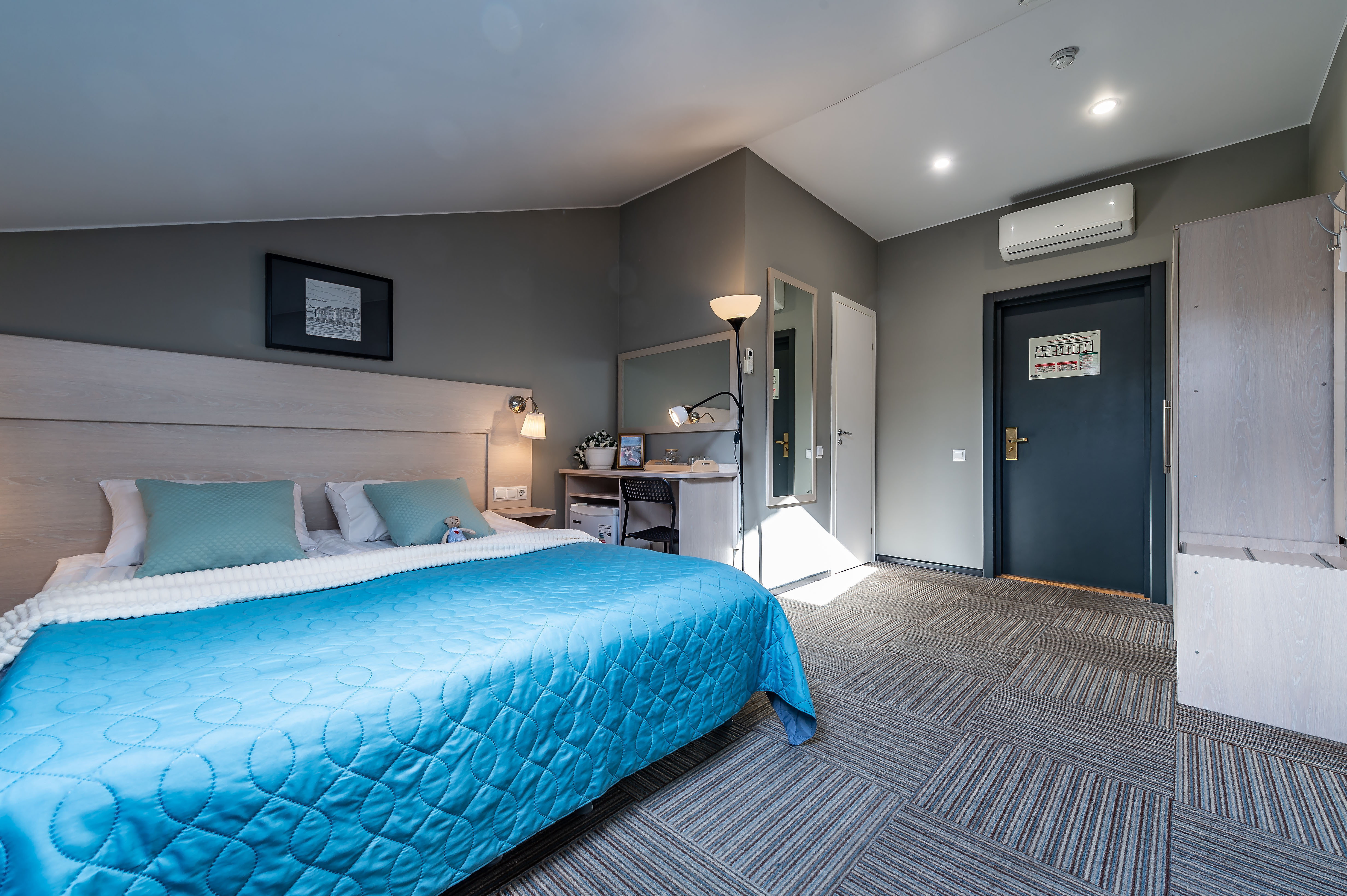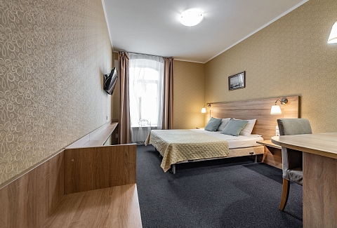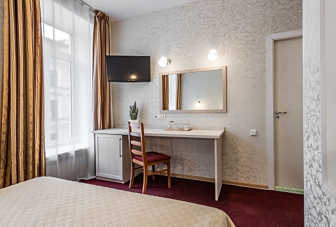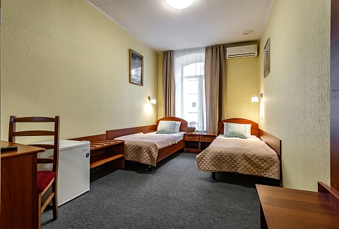 В номере: вешалка, зеркало, кровать двуспальная/ две полутороспальные кровати, прикроватные тумбочки, стол, стулья, шкаф, мини-холодильник, сплит-система, телевизор