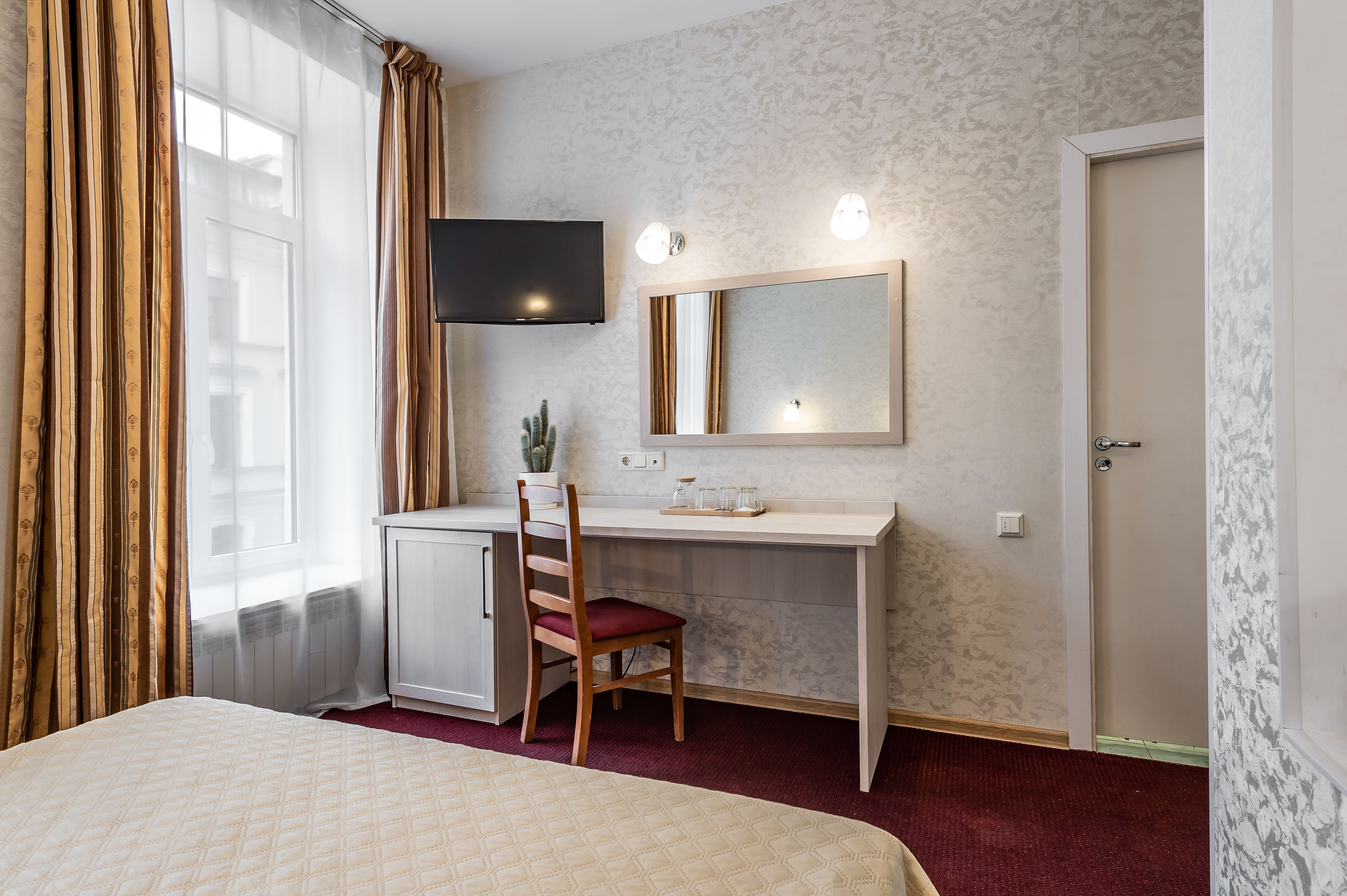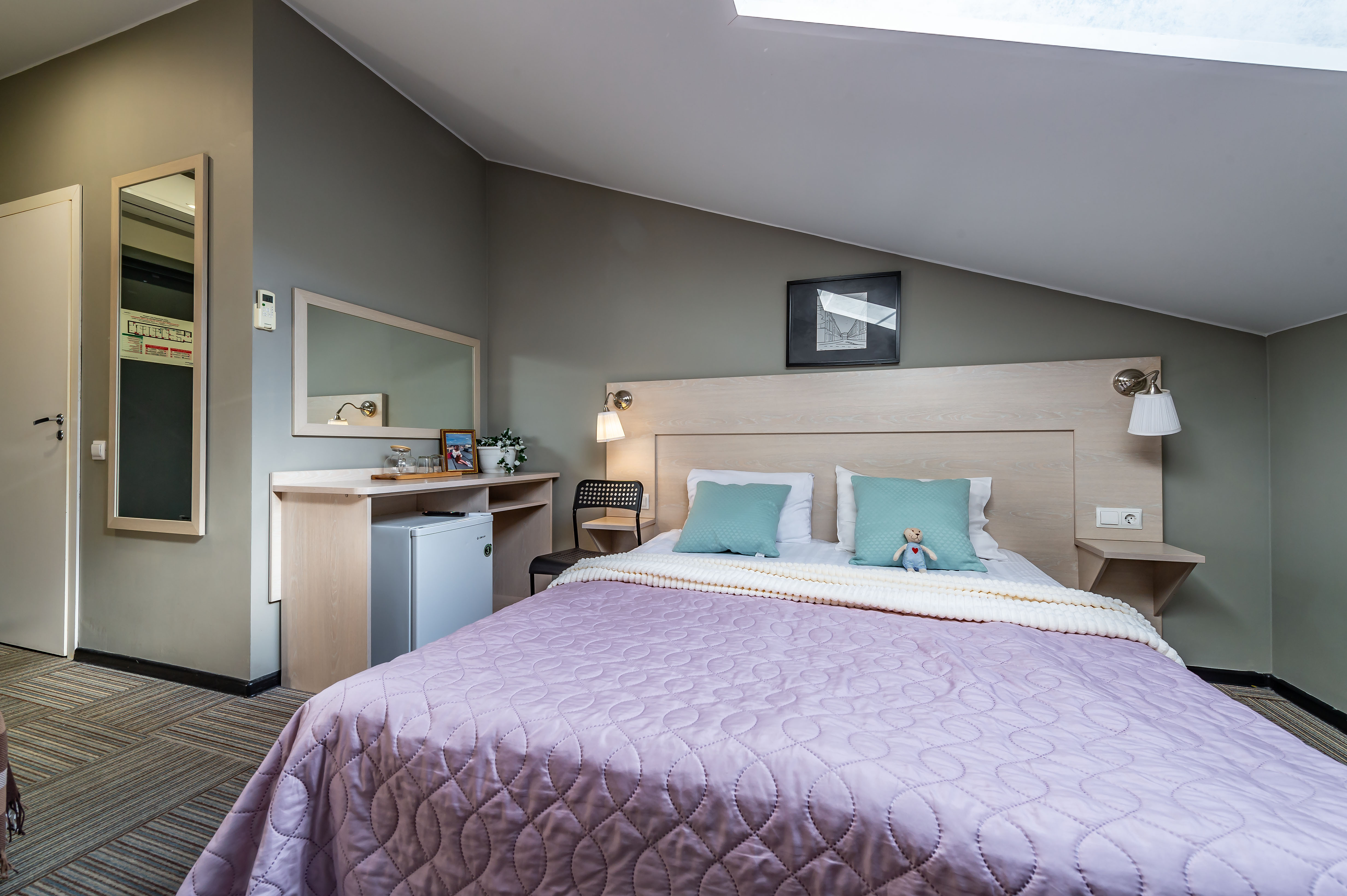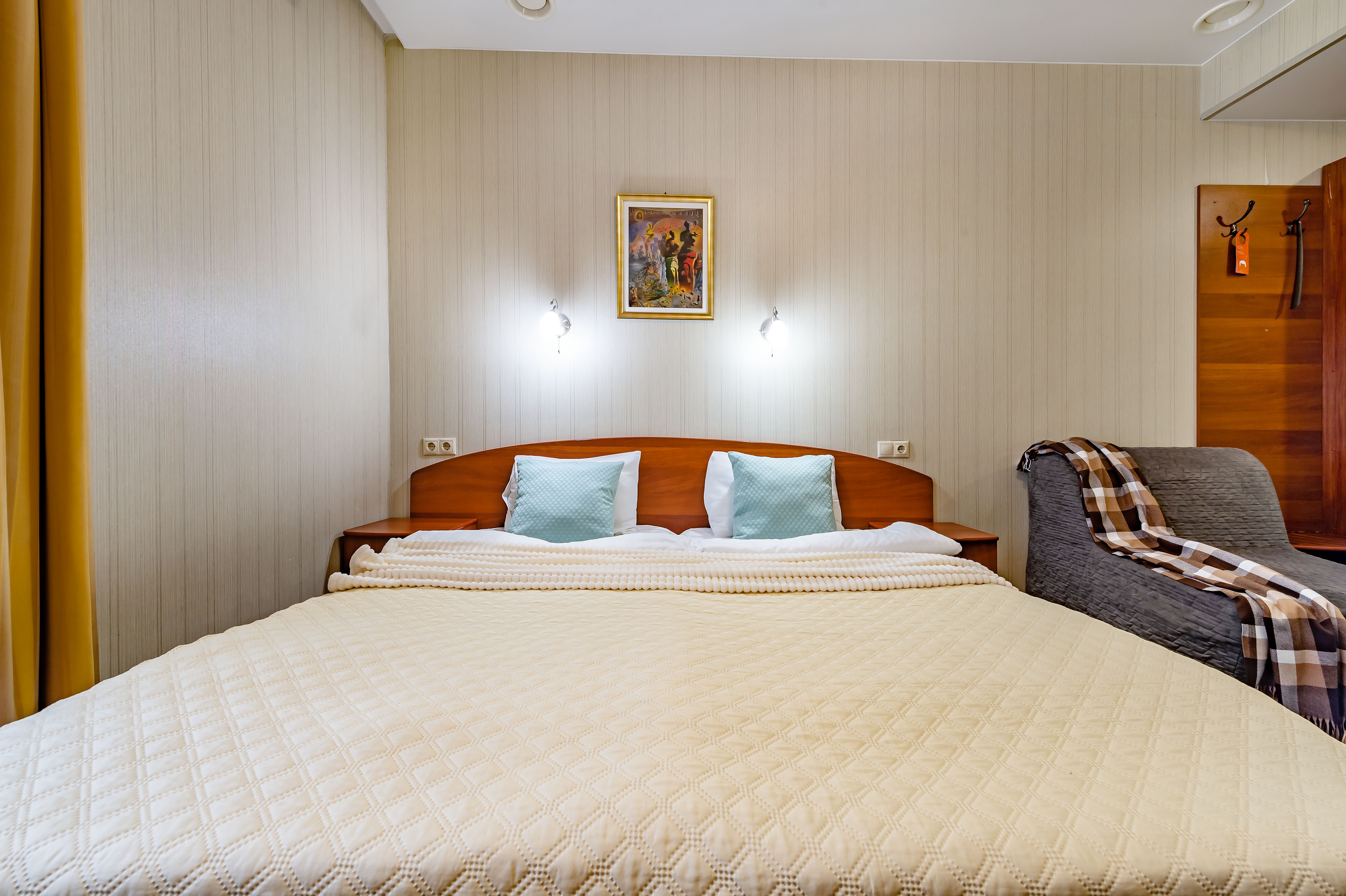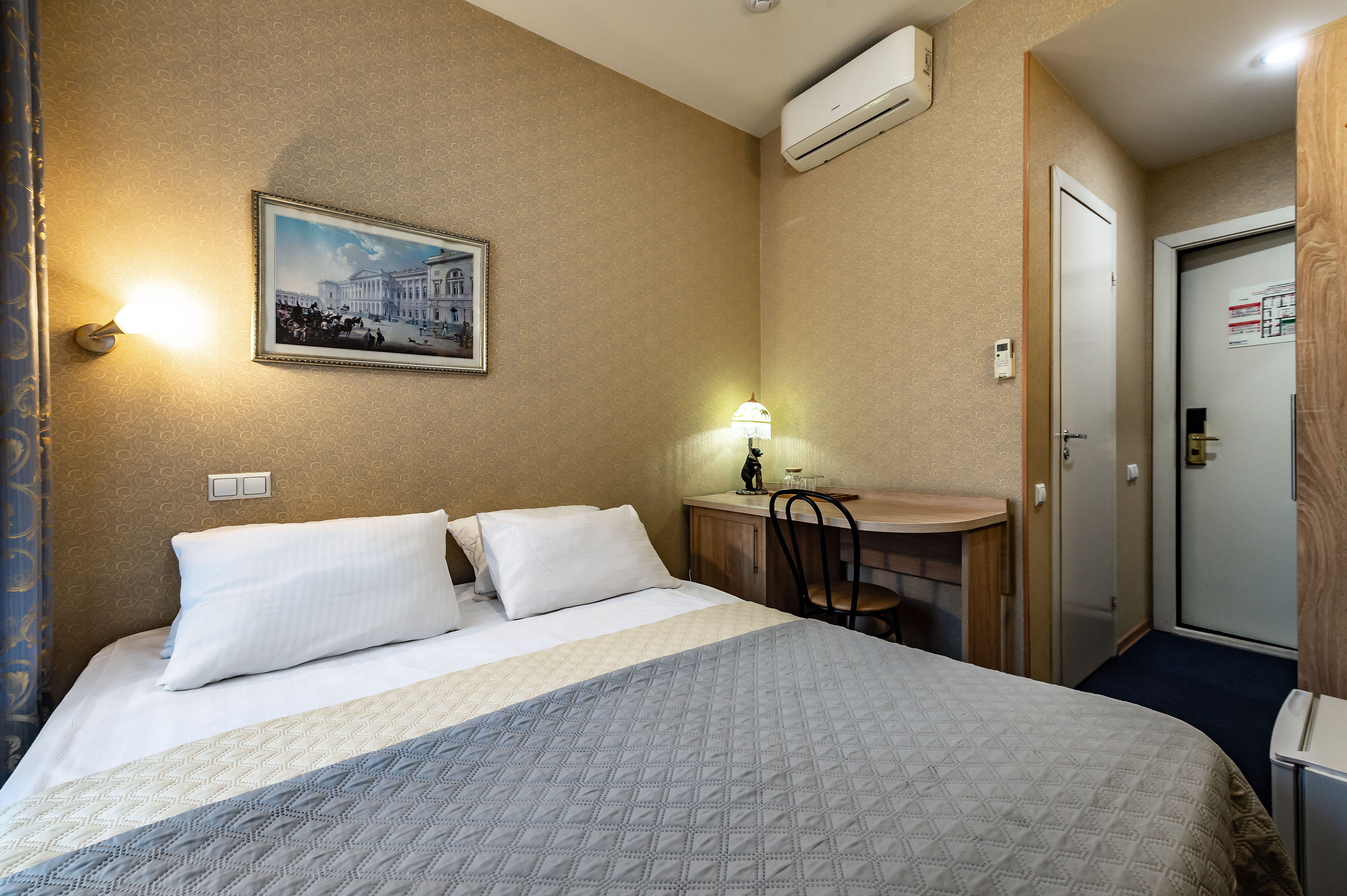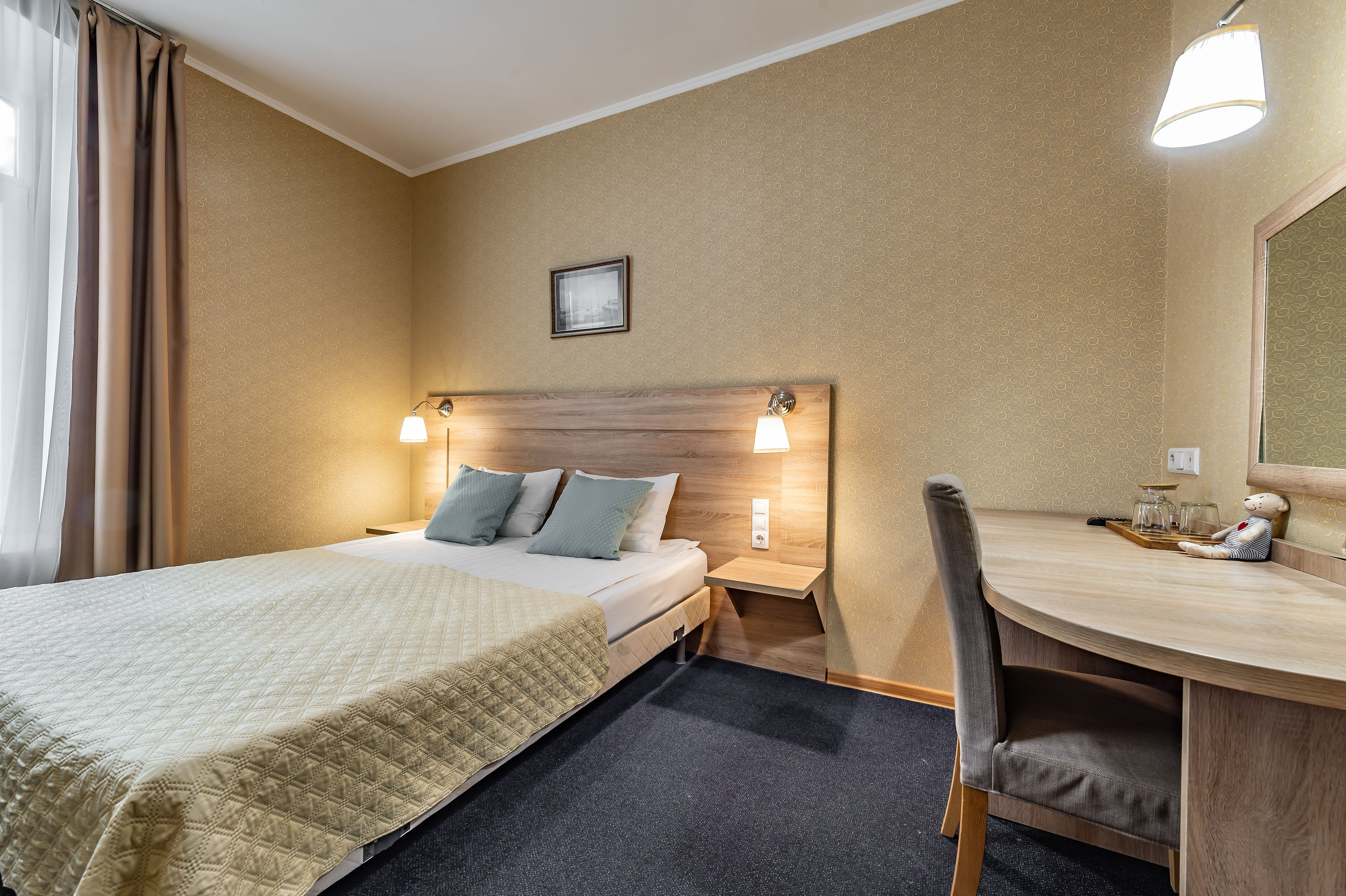 В номере: вешалка, зеркало, кровать двуспальная/ две полутороспальные кровати, прикроватные тумбочки, стол, стулья, шкаф, мини-холодильник, сплит-система, телевизор