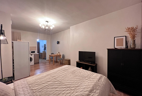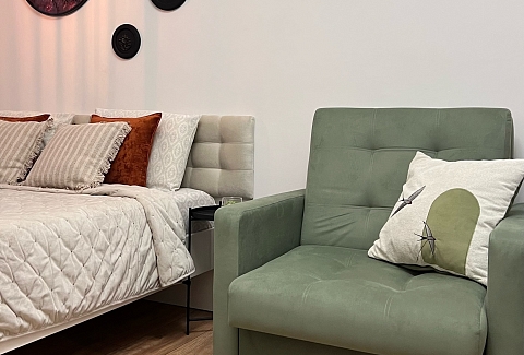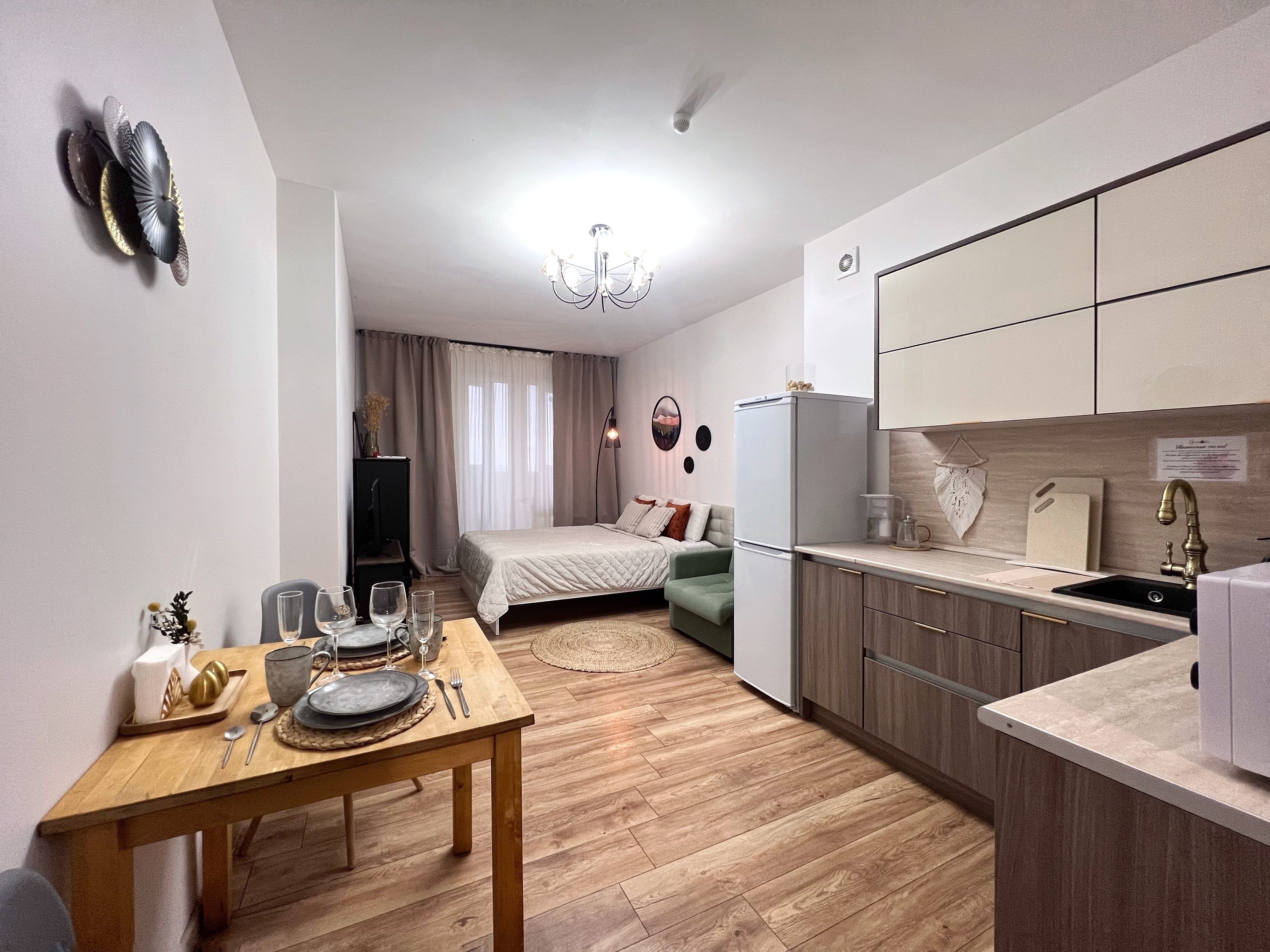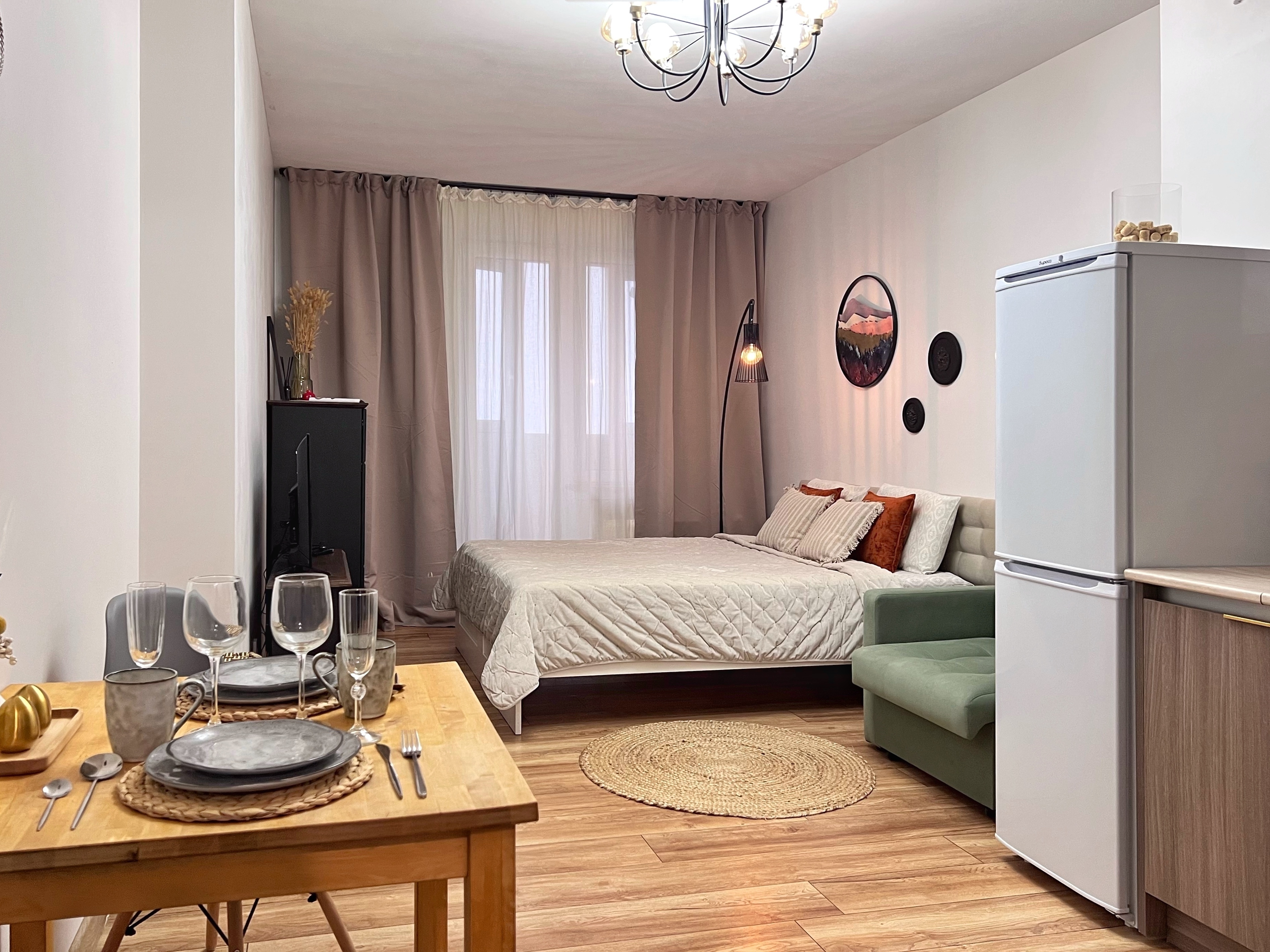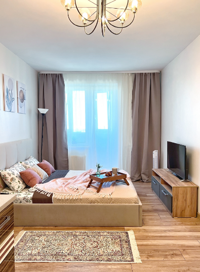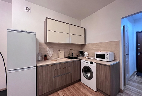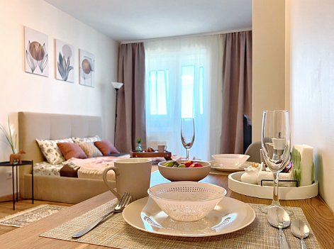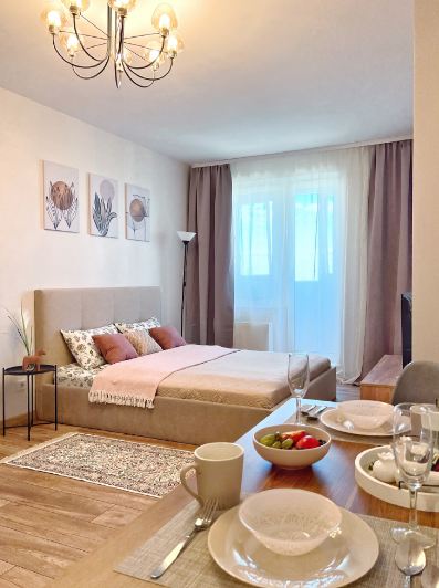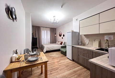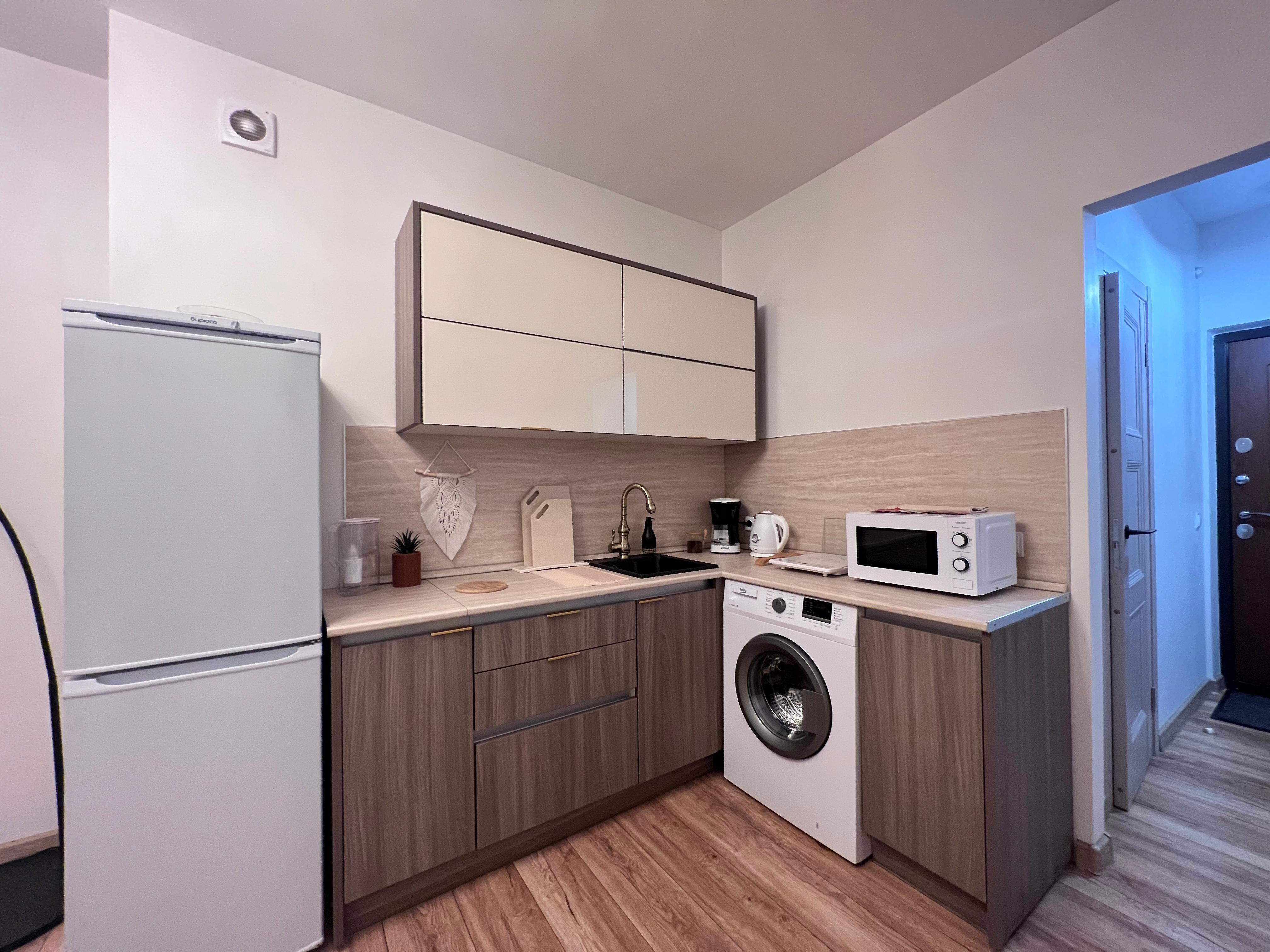 Расстояние до аэропорта Пулково составляет около 40–50 минут на автомобиле. Апартаменты представляют собой уютные студии с современным ремонтом и стильным интерьером. В комнате — двуспальная кровать и односпальное кресло-кровать. По запросу можно добавить переносную кроватку или детский стульчик для кормления. Кухня оснащена плитой, холодильником, микроволновой печью, электрическим чайником, всей необходимой посудой и столовыми приборами. Гостей ждет приветственный набор с чаем, кофе и сахаром, в холодильнике -подсолнечное масло. Работают спутниковое телевидение и высокоскоростной беспроводной интернет. Ванная комната оборудована стиральной машиной, феном. Предусмотрены гладильные принадлежности и сушилка для белья. Для гостей подготовлены предметы личной гигиены, одноразовые тапочки. Постельное белье и полотенца проходят профессиональную стирку и глажку. Рядом с домом предусмотрена общественная парковка, что удобно для путешествующих на личном авто. Действует бесконтактная система заселения, инструкция приходит накануне заезда. В апартаментах запрещено курение и проведение шумных мероприятий. В подарок гости получают авторский гайд с интересными местами Санкт-Петербурга.