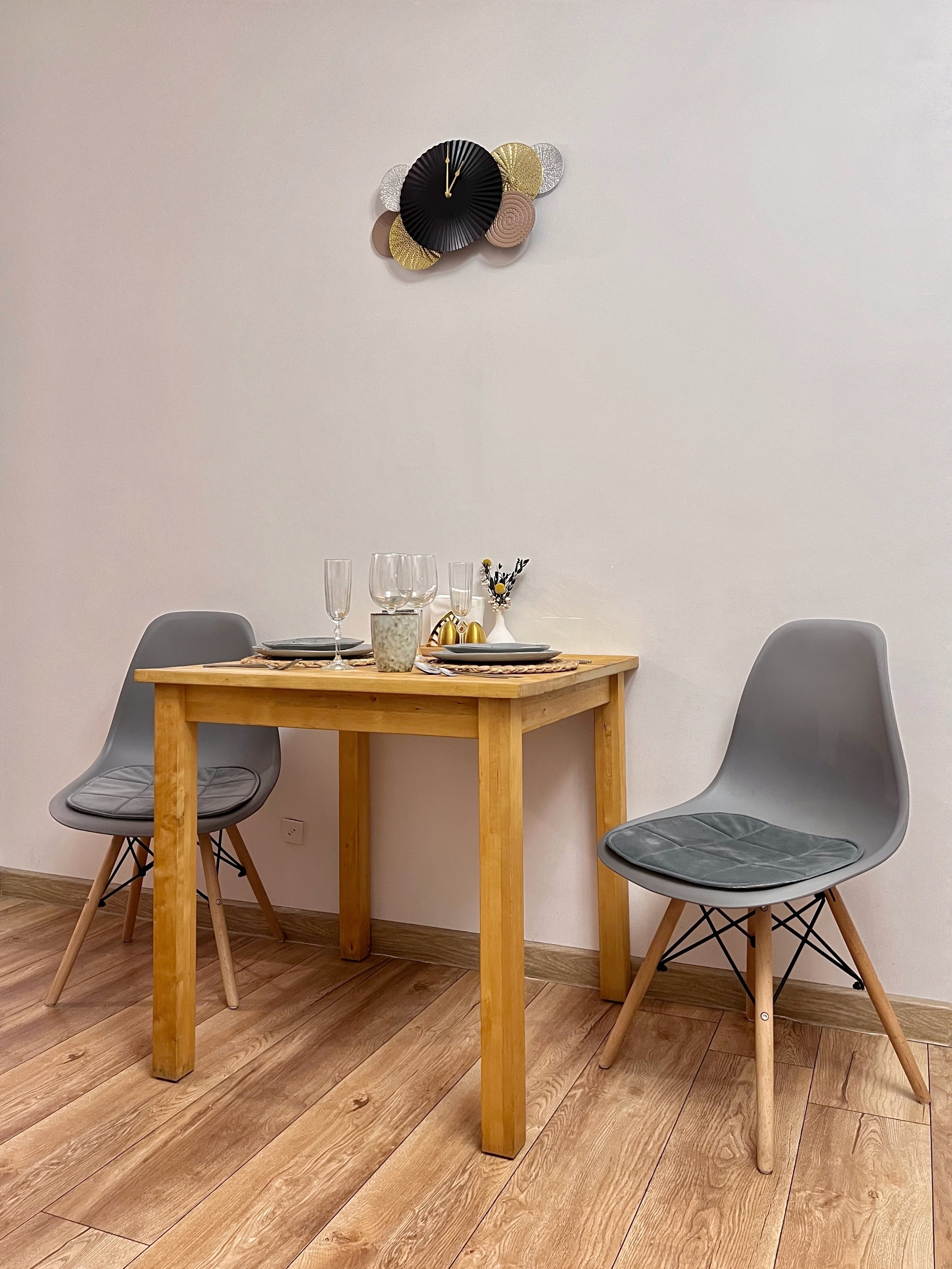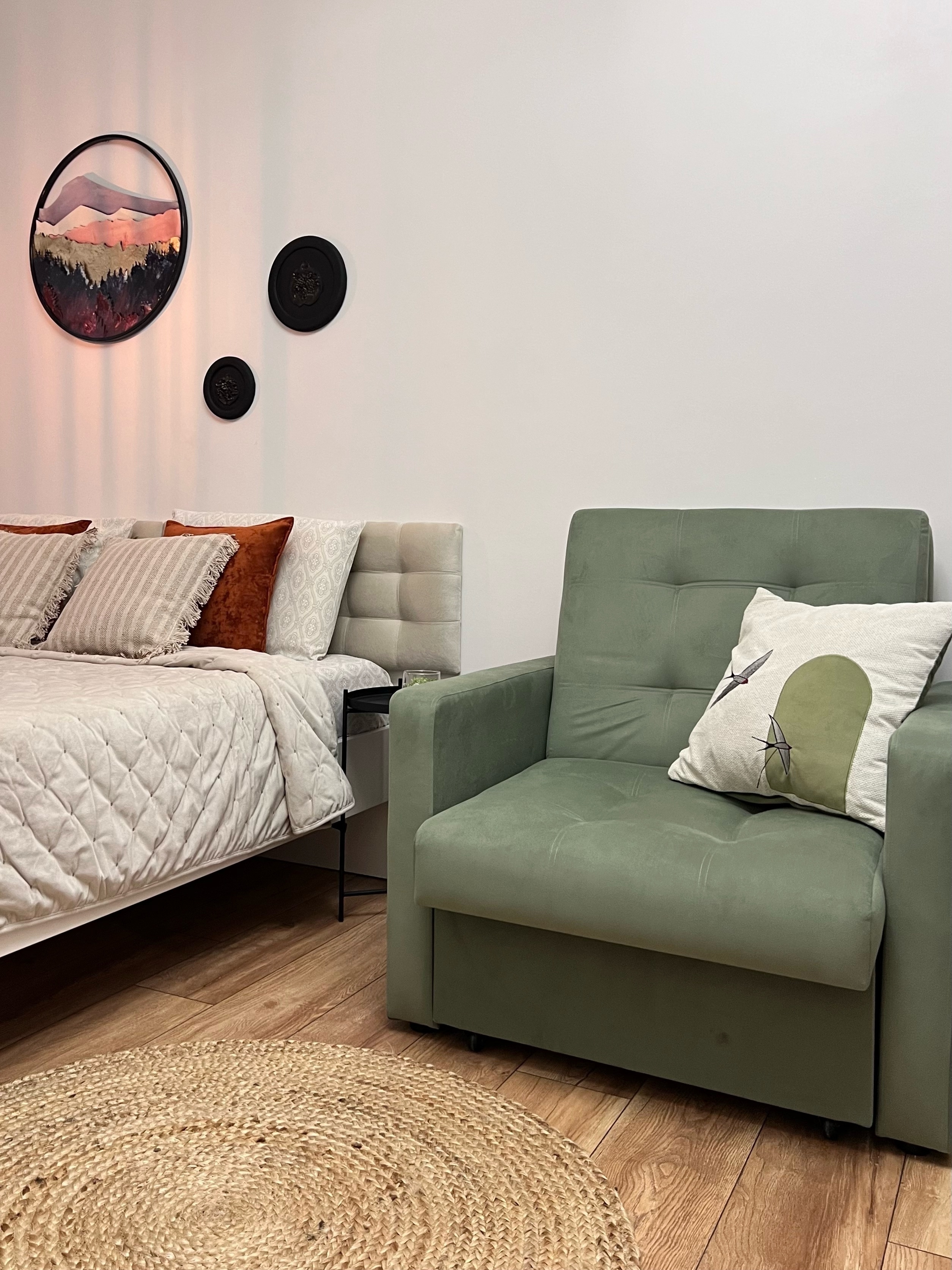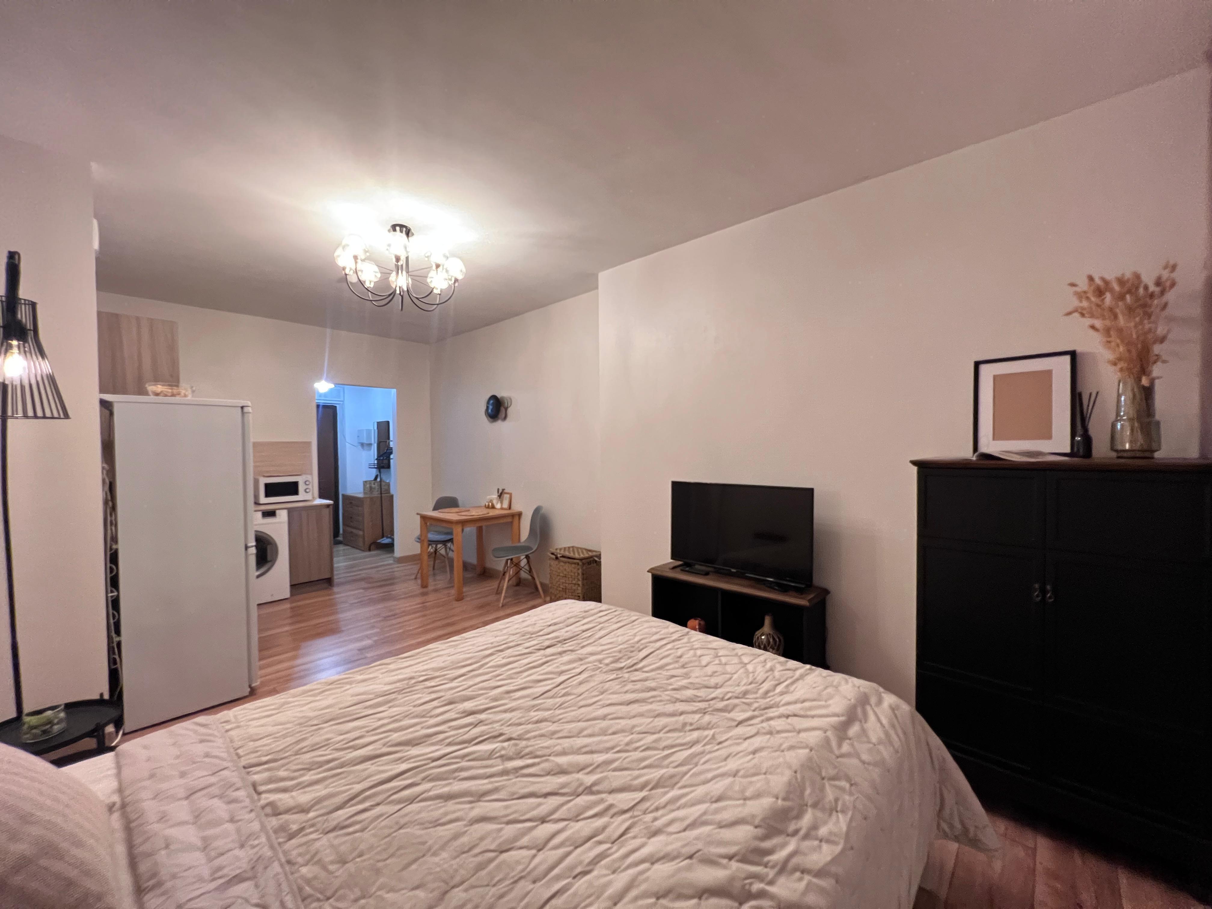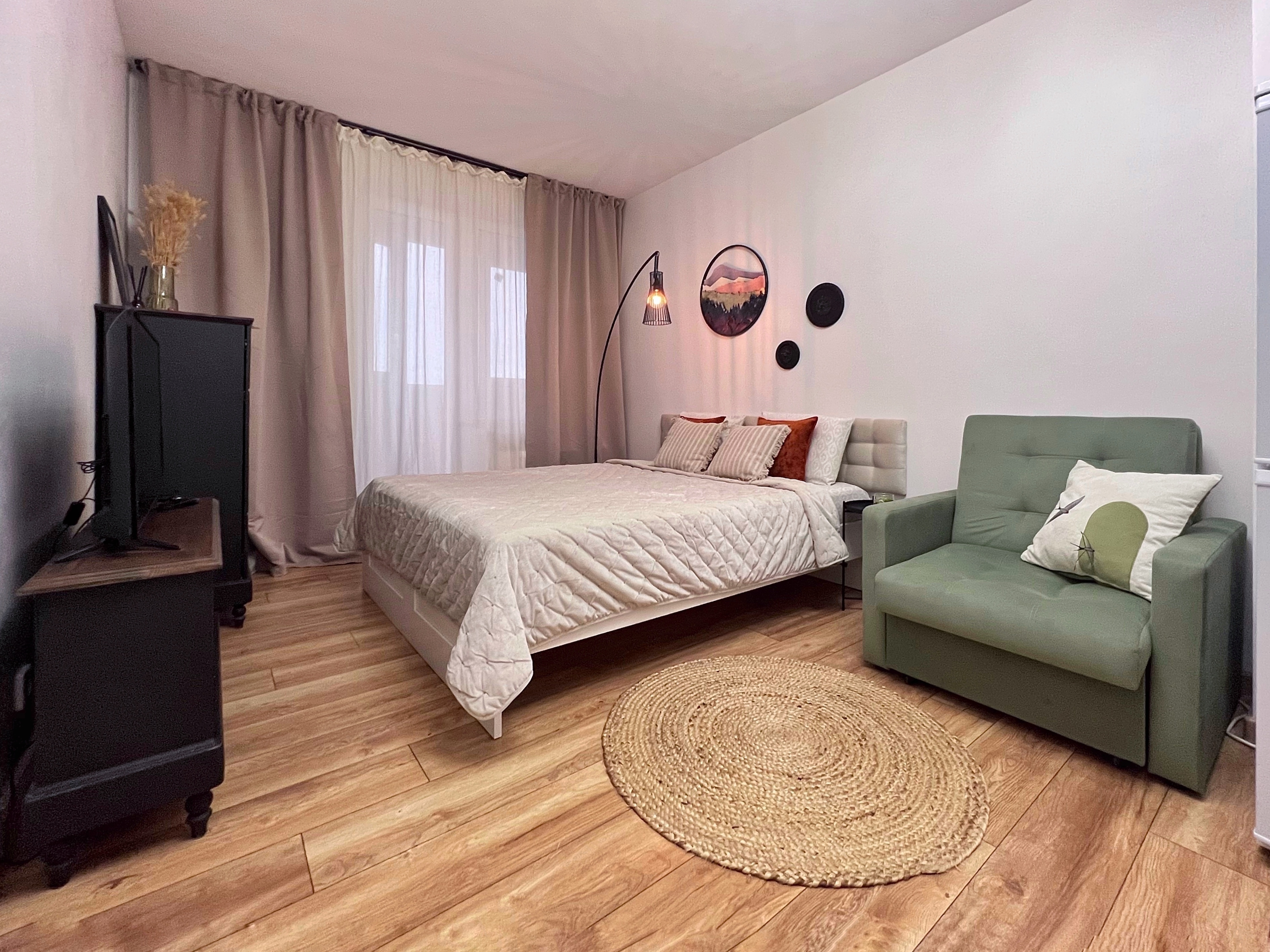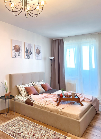 Расстояние до аэропорта Пулково составляет около 40–50 минут на автомобиле. Апартаменты представляют собой уютные студии с современным ремонтом и стильным интерьером. В комнате — двуспальная кровать и односпальное кресло-кровать. По запросу можно добавить переносную кроватку или детский стульчик для кормления. Кухня оснащена плитой, холодильником, микроволновой печью, электрическим чайником, всей необходимой посудой и столовыми приборами. Гостей ждет приветственный набор с чаем, кофе и сахаром, в холодильнике -подсолнечное масло. Работают спутниковое телевидение и высокоскоростной беспроводной интернет. Ванная комната оборудована стиральной машиной, феном. Предусмотрены гладильные принадлежности и сушилка для белья. Для гостей подготовлены предметы личной гигиены, одноразовые тапочки. Постельное белье и полотенца проходят профессиональную стирку и глажку. Рядом с домом предусмотрена общественная парковка, что удобно для путешествующих на личном авто. Действует бесконтактная система заселения, инструкция приходит накануне заезда. В апартаментах запрещено курение и проведение шумных мероприятий. В подарок гости получают авторский гайд с интересными местами Санкт-Петербурга.