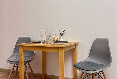 В номере: кресло-кровать, кровать двуспальная, кухонная мебель, стол обеденный, стулья, шкаф, гладильная доска, микроволновая печь, набор посуды, плита электрическая, стиральная машина, телевизор, утюг, холодильник, электрочайник
