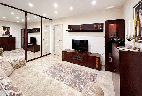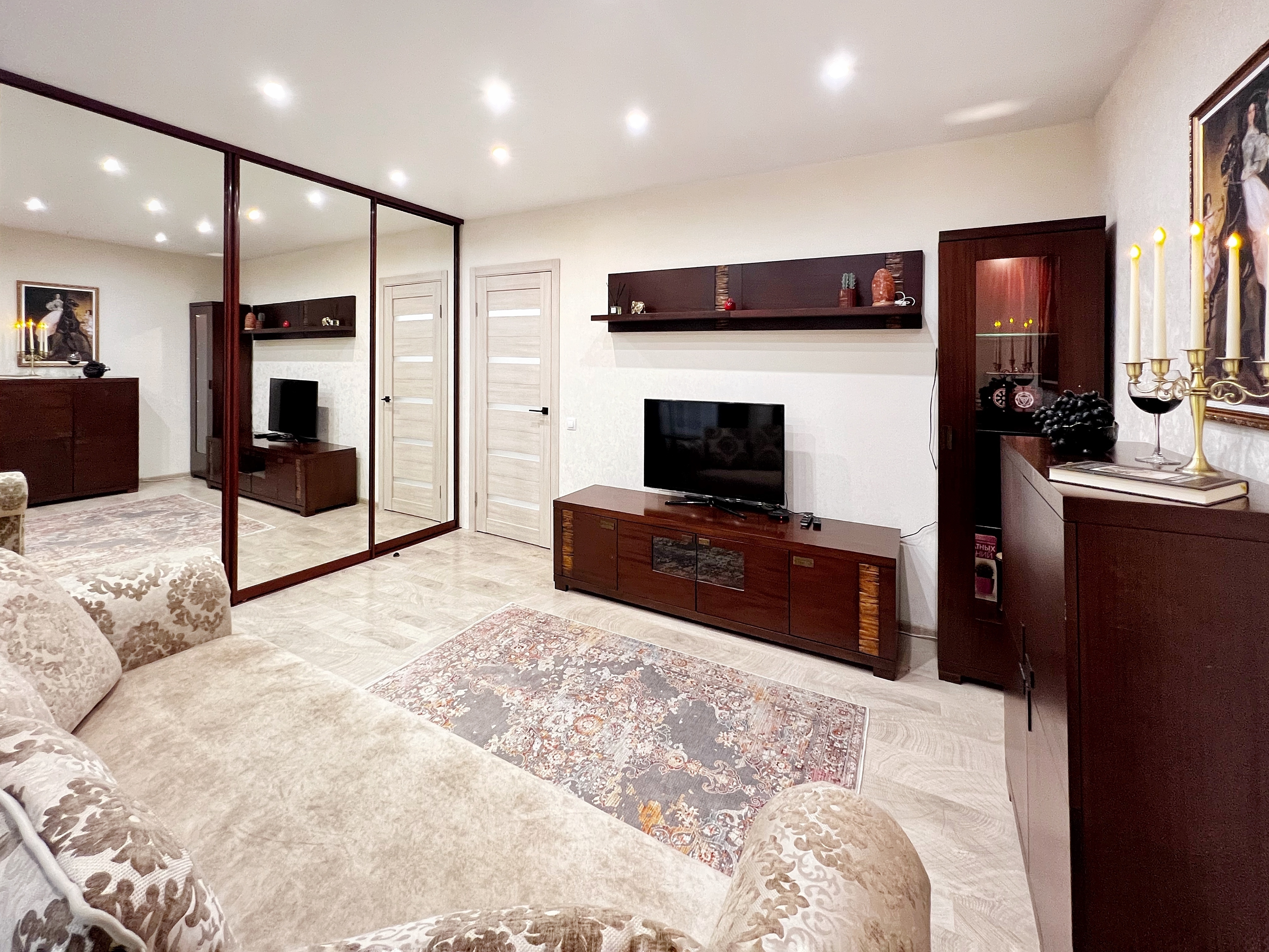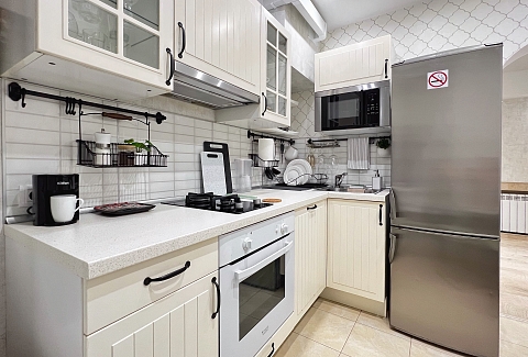 В номере: диван раскладной, кровать двуспальная, прикроватные тумбочки, столик кофейный, стол обеденный, стулья, шкаф, гладильная доска, микроволновая печь, набор посуды, плита газовая, посудомоечная машина, стиральная машина, телевизор, утюг, холодильник, электрочайник