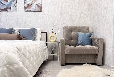 В номере: кресло-кровать, кровать двуспальная, стол, стулья, микроволновая печь, набор посуды, плита, стиральная машина, телевизор, утюг, холодильник, чайник