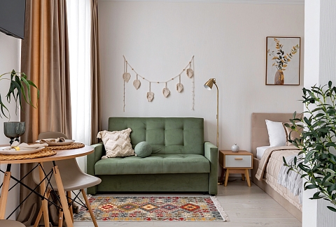 В номере: диван раскладной, кровать двуспальная, стол, стулья, микроволновая печь, набор посуды, плита, стиральная машина, телевизор, утюг, холодильник, чайник