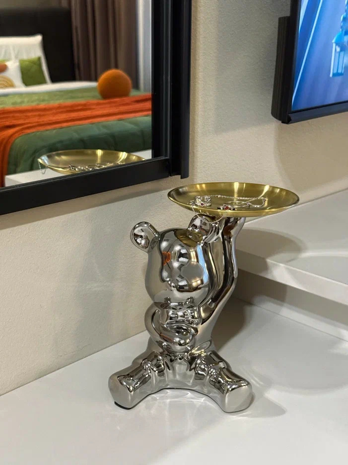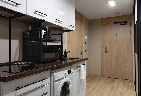 В номере: диван раскладной, кровать двуспальная, прикроватные тумбочки, стол, стулья, шкаф, гладильная доска, микроволновая печь, набор посуды, плита индукционная, стиральная машина, телевизор, утюг, холодильник, чайник