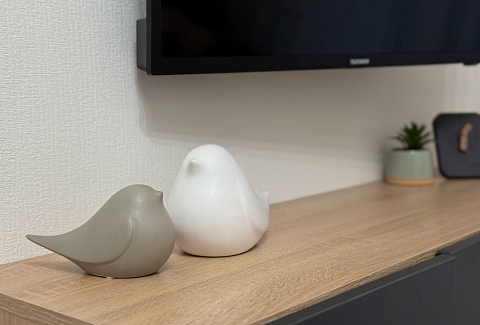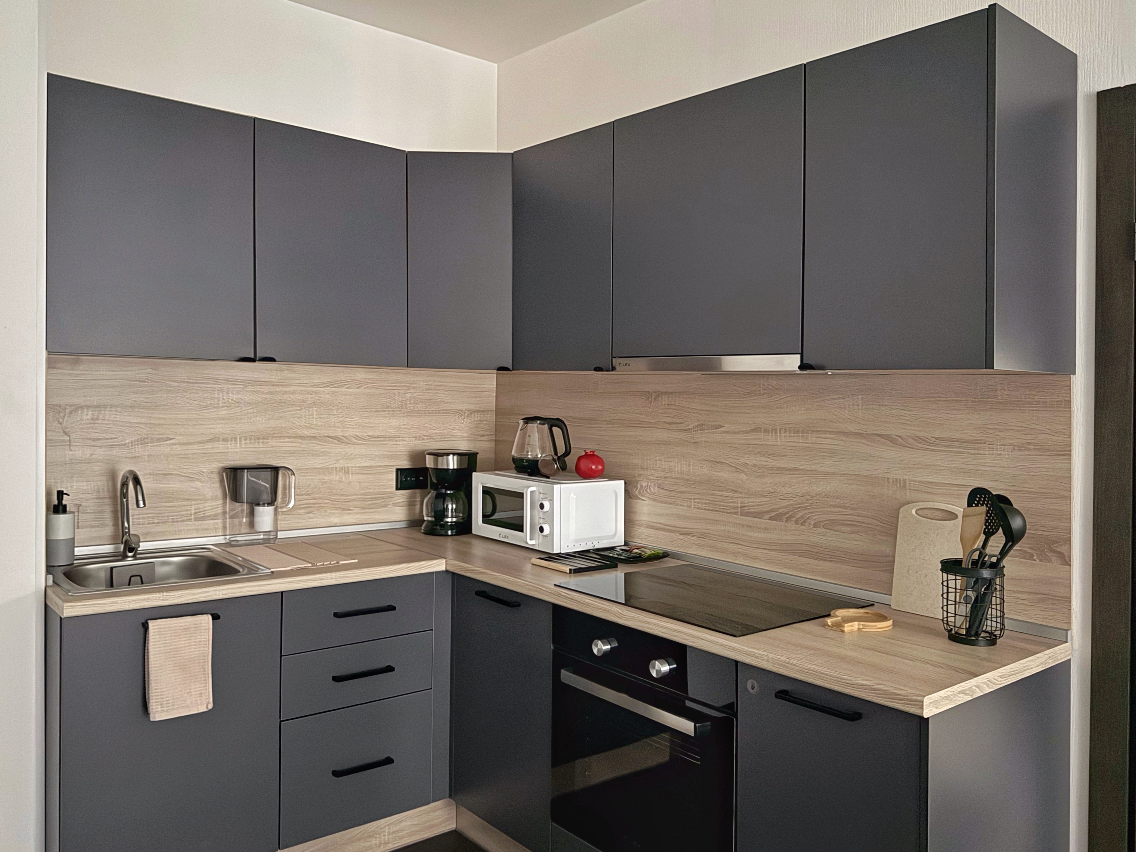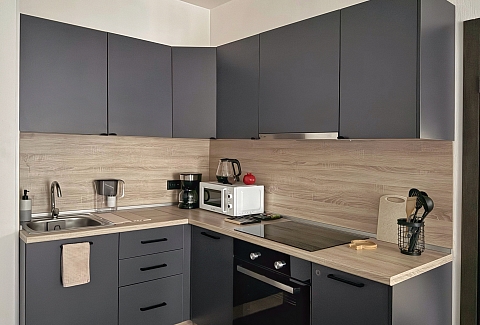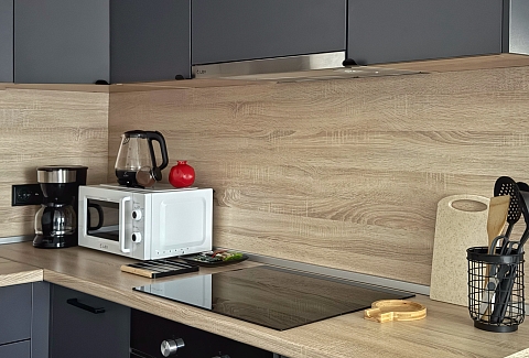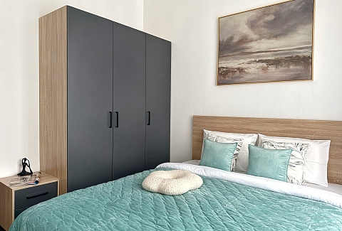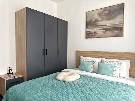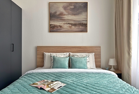 В номере: диван раскладной, кровать двуспальная, стол, стулья, шкаф, кондиционер, микроволновая печь, набор посуды, плита электрическая, стиральная машина, телевизор, утюг, холодильник, чайник
