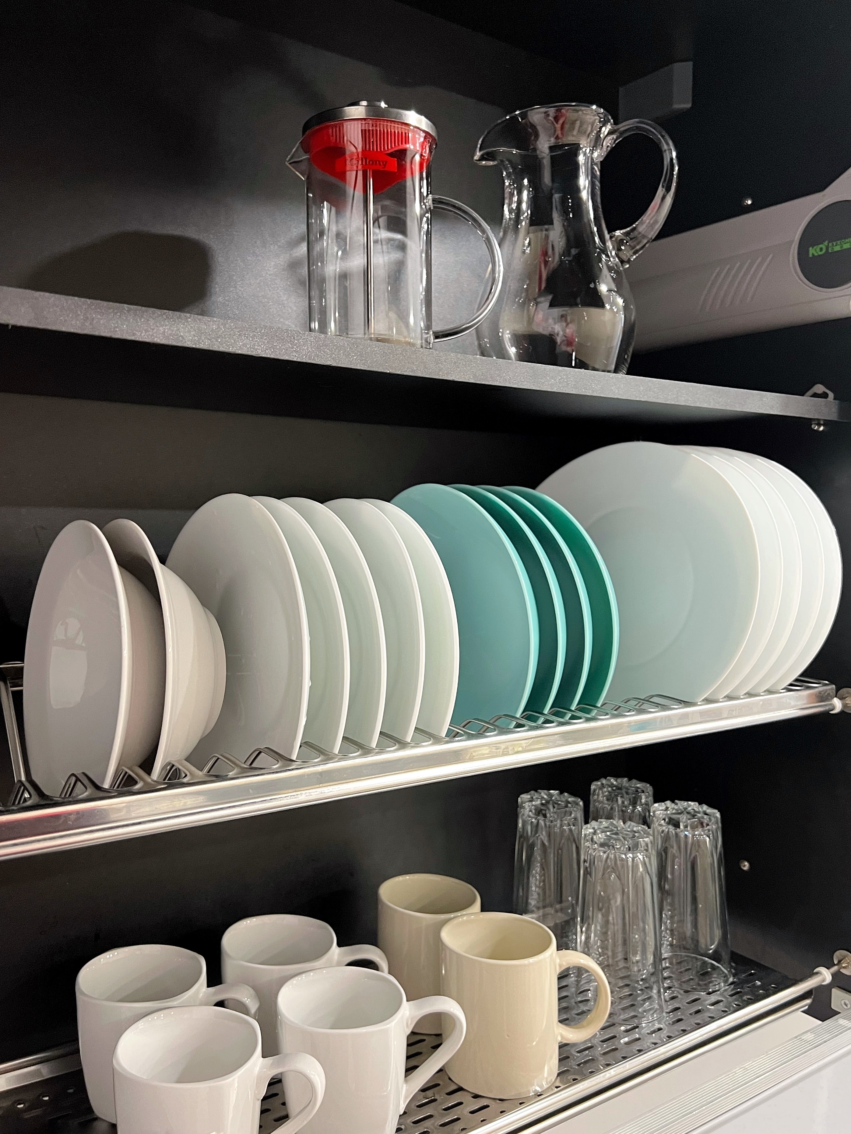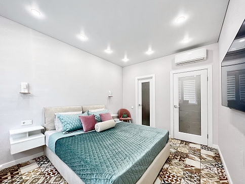 В номере: диван раскладной, кровать двуспальная, стол, стулья, шкаф, кондиционер, микроволновая печь, набор посуды, плита, посудомоечная машина, стиральная машина, телевизор, утюг, холодильник