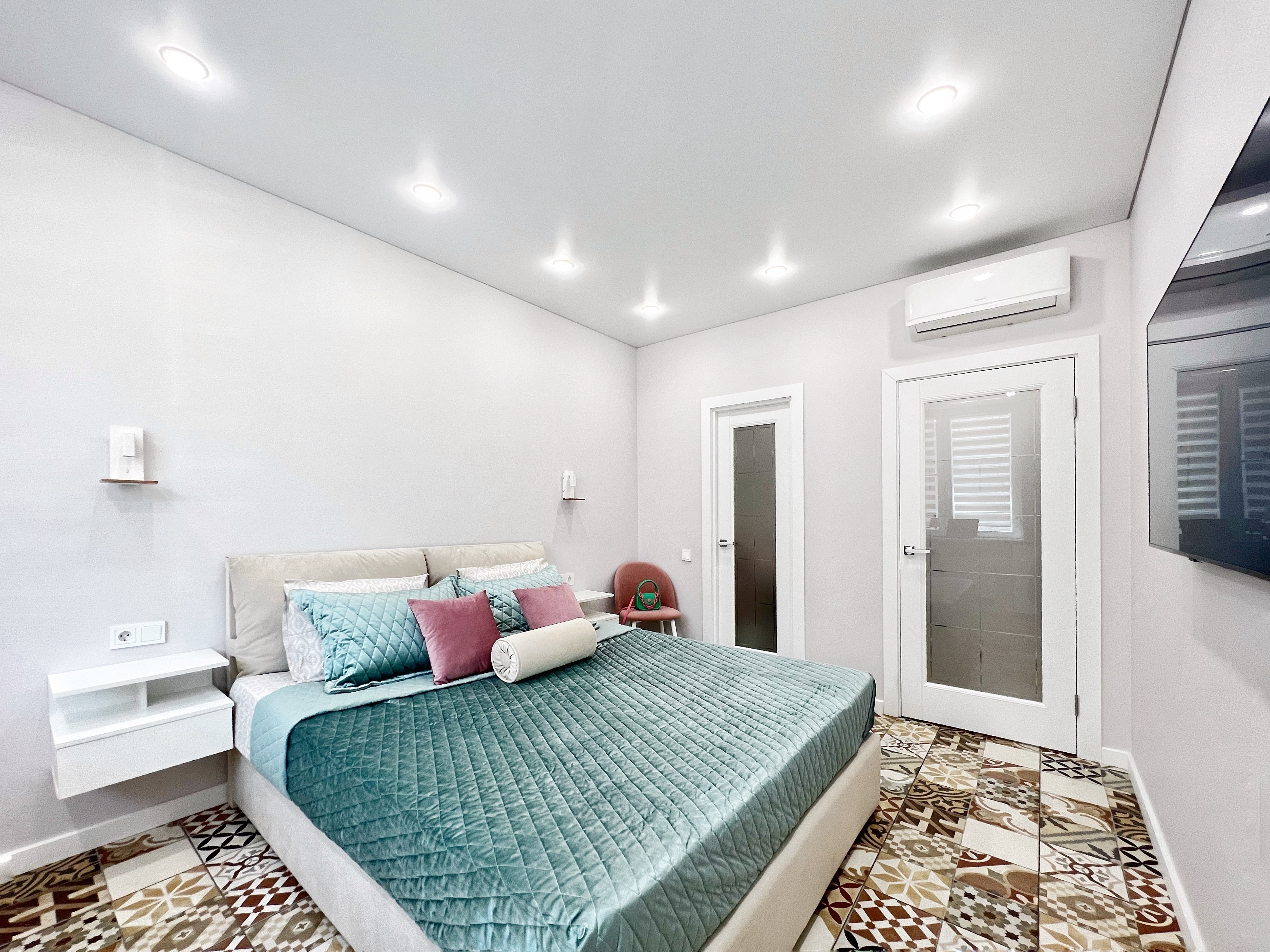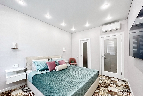В номере: диван раскладной, кровать двуспальная, стол, стулья, кондиционер, микроволновая печь, посудомоечная машина, стиральная машина, телевизор, утюг, холодильник